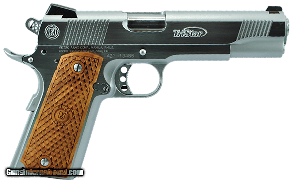Description: Guns Listing ID: 491252 9mm Luger, semi-automatic with steel frame and steel slide. Single Action. Front dovetail & Rear Novak sight. Custom hardwood grips with logo. Extended beavertail & Thumb safety. Skeletal combat hammer. Front and rear slide serrations. 1 Magazine included and packaged in hard plastic case. Also includes a gunlock, cleaning kit and owner‚‚s manual SOLD Manufacturer: TRISTAR ARMS INC. Model: American Classic II 1911 Caliber Info: 9MM LUGER (9X19 PARA) Condition: new Barrels: 5 BARREL Finish: CHROME |