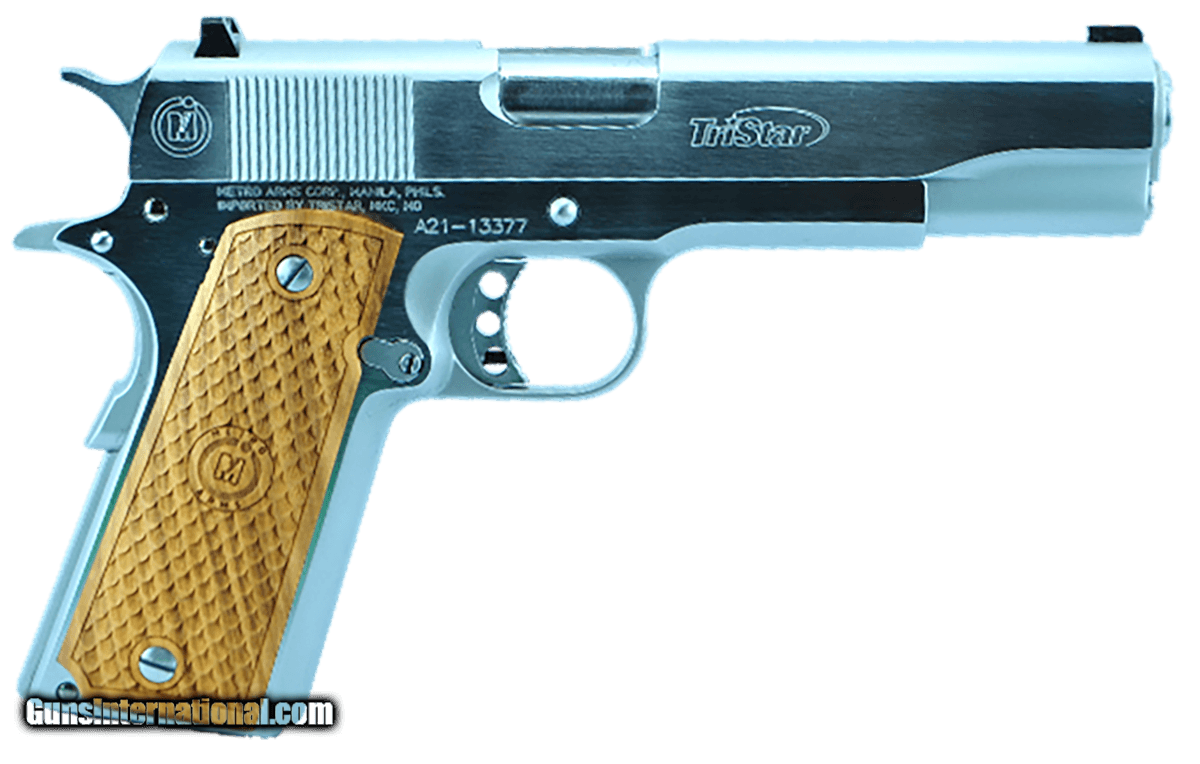 Description: Guns Listing ID: 491267 .38 Super semi-automatic with steel frame and steel slide. Single Action. Mil-Spec front & Rear sights. Custom hardwood grips with logo. 1 Magazine included and packaged in hard plastic case. Also includes a gunlock, cleaning kit and owner‚‚s manual SOLD Manufacturer: TRISTAR ARMS INC. Model: CLASSIC GOVERNMENT 1911 Caliber Info: .38 SUPER +P Condition: new Barrels: 5 BARREL Finish: CHROME |