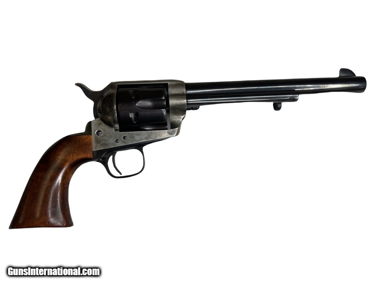 Description: Guns Listing ID: 453507 The gunsmiths at Uberti have fitted each El Patrón with high-grade, US-manufactured Wolff springs and each revolver has been carefully tested and certified for flawless fit and function. The result is a single-action that is reliable, lighter and faster with a smooth-tuned action. The new El Patrón is available in 6 new factory custom-tuned models with color case-hardened or stainless steel frames, numbered cylinders, steel backstraps and trigger guards, new checkered walnut grips and wide, easy-view front and rear sights. Item#I01011158 SOLD Manufacturer: UBERTI Model: 1873 CATTLEMAN Caliber Info: .45 LC Condition: Used - Non-Certified Barrels: 7.5 BARREL Finish: WOOD AND BLACK |