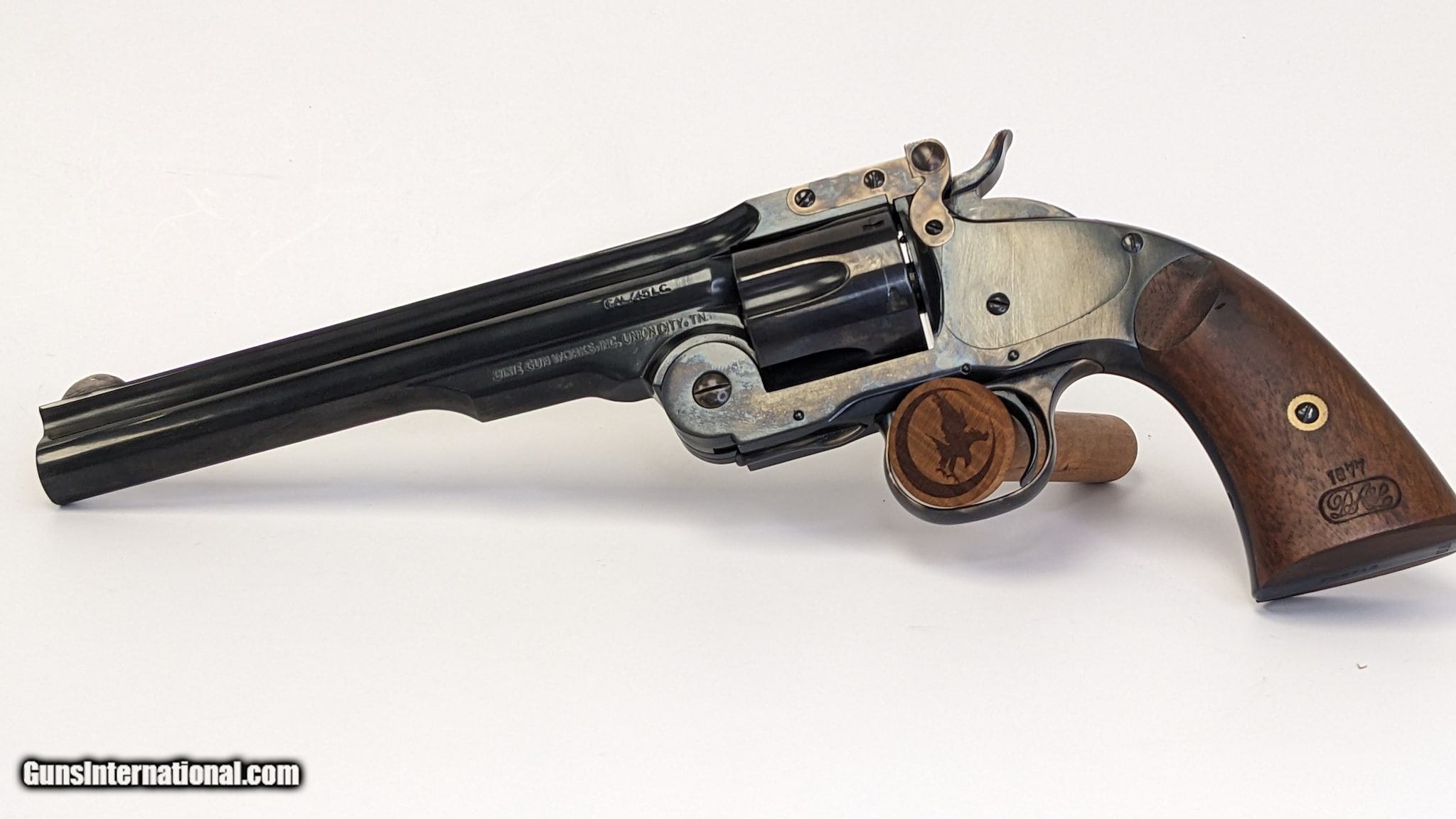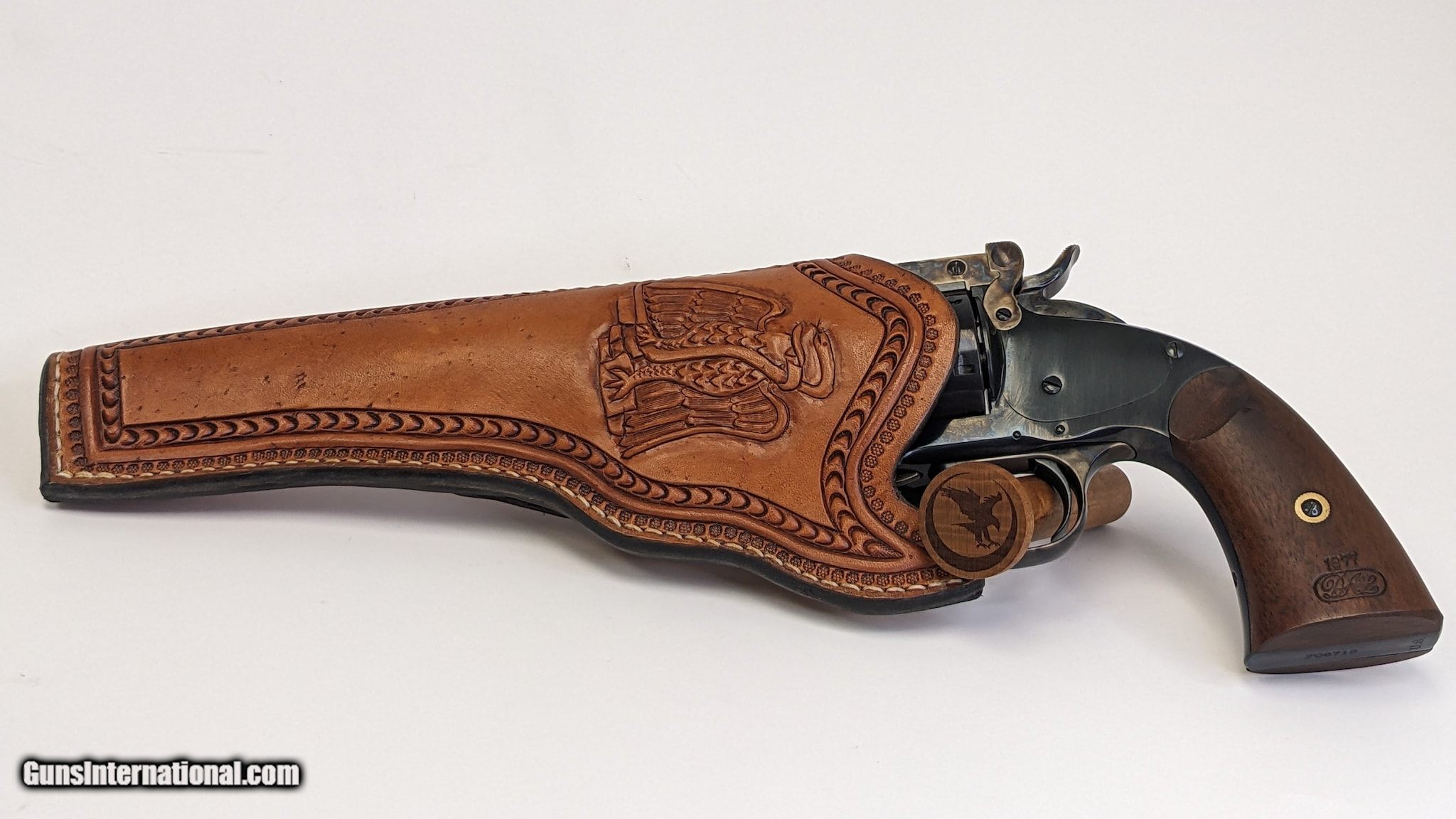 Description: Guns Listing ID: 1105988 DESCRIPTION What we have here is an Uberti Model 3 1875 Schofield Break open Single Action Cowboy gun. It is chambered in .45LC and is in excellent condition. Nearly 100%. Included is a custom Schofield leather holster with artistic engraving. With the near perfect blueing and case hardening on the trigger guard and upper part of the frame, it is truly a beauty! Major George Schofield designed the Top Break as a cavalry pistol. Its efficient, break-open design could be operated with one hand. That made it easy to eject the spent cartridges and reload while on horseback. It was the Russian government that truly embraced the new side arm. The Czar ordered 41,000 Top Breaks. Those had a modified grip design, lanyard ring, and a distinctive trigger spur. Firearm Specifications Manufacturer: Uberti Model: 1875 No. 3 2nd Model Top Break Caliber: 45 Colt Barrel Length: 7? Overall Length: 12.8? Finish: Blue Cylinder: 6-Shot; Fluted Number of Grooves: 6 Twist: 1:16? RH Grip: 2-Piece Walnut Frame: Blue Steel Frame Trigger Guard: Case Hardened SOLD Manufacturer: UBERTI Model: 1875 Model 3 Schofield Caliber Info: .45 LC Condition: Used - Non-Certified Barrels: 7 BARREL Finish: BLUE |