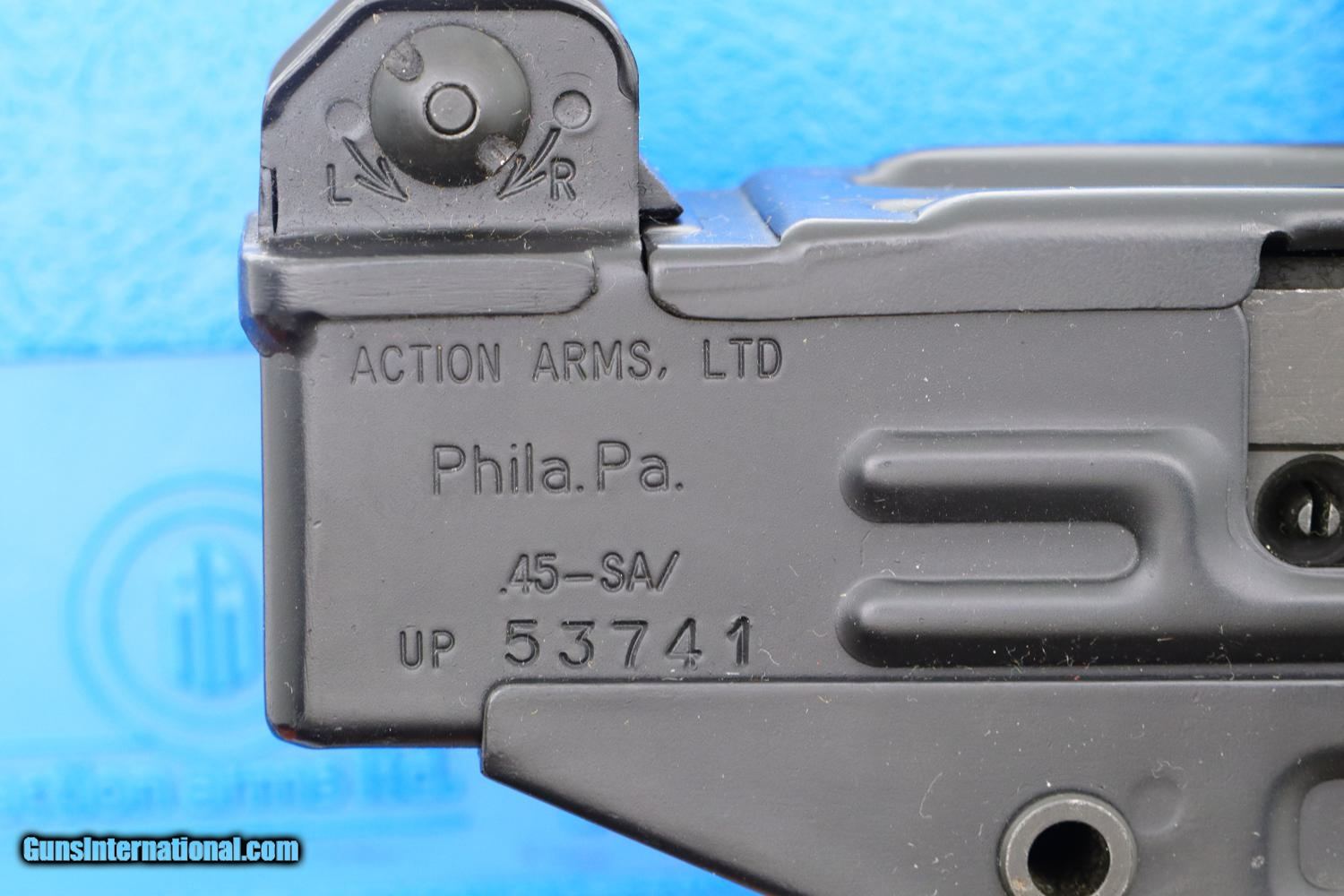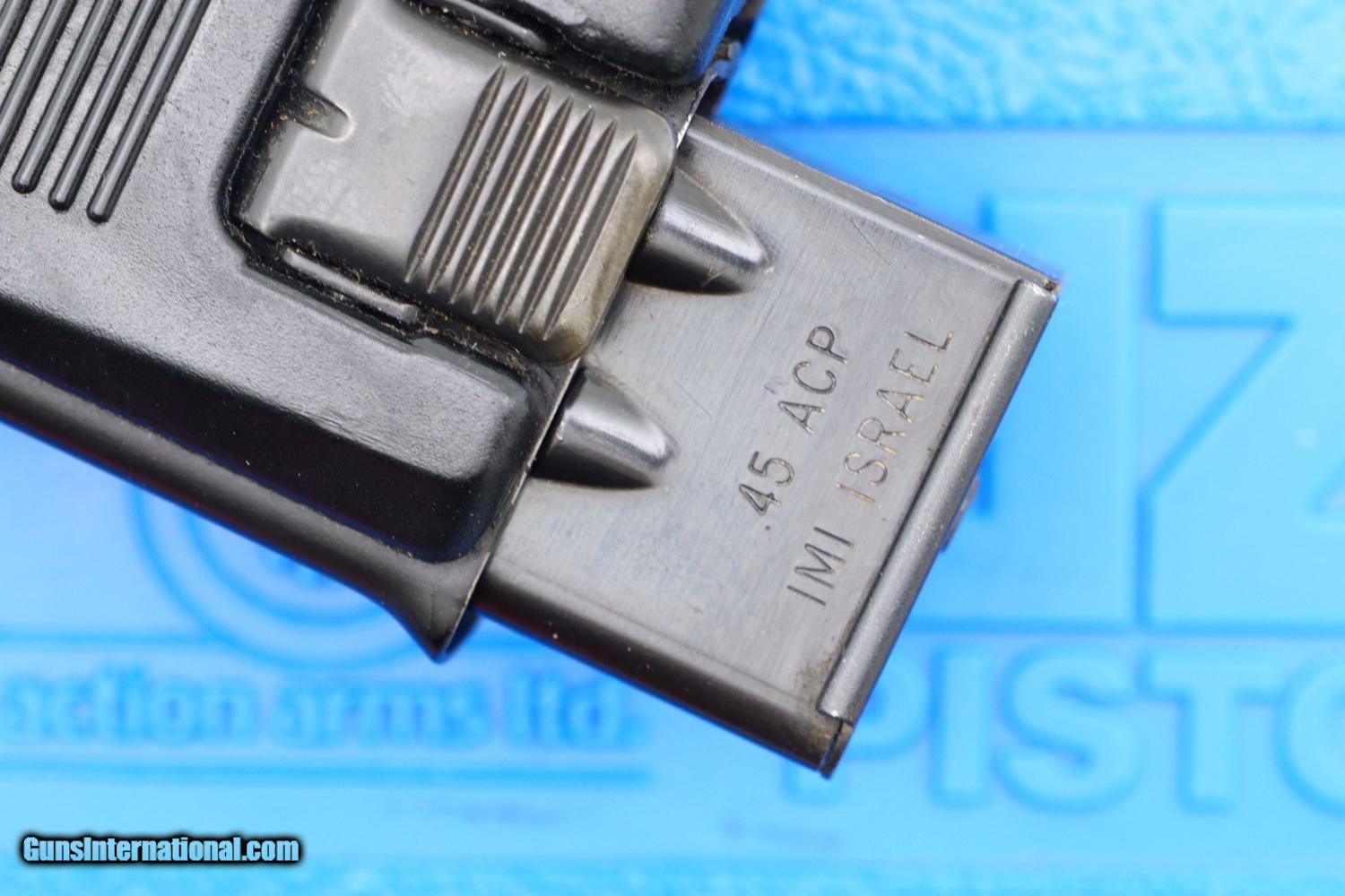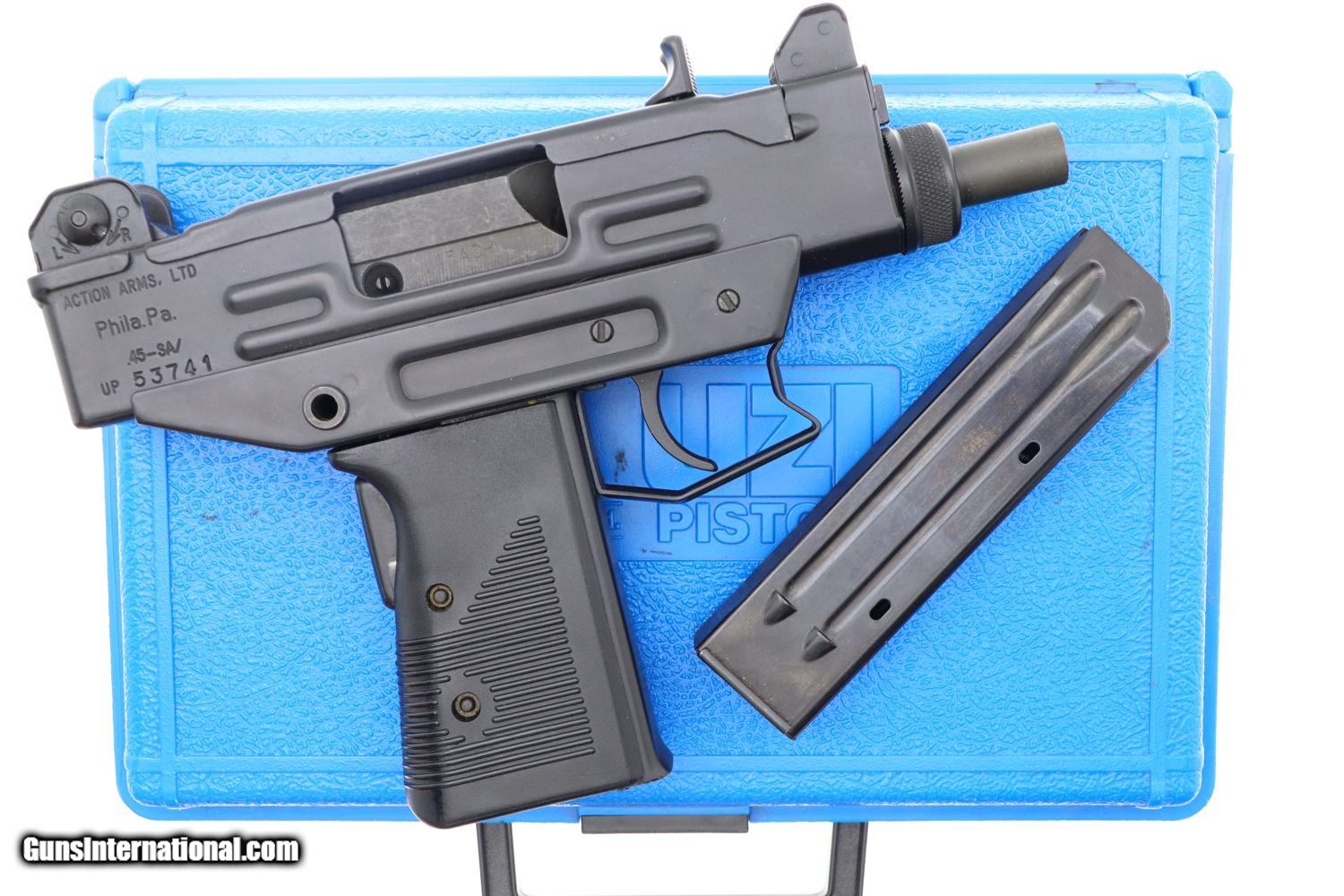 Description: Synopsis: IMI, Uzi Model 45 Pistol, Israel, Boxed UP53741, FB01164 Description: Scarce, highly charismatic Israeli Uzi pistol, .45 ACP, based on the classic Uzi carbine, this example near new in blue transport case with sight adjustment tool and 10 shot magazine. Standard pistol with three dot sighting system. The front sight is elevation adjustable; the rear sight is horizontally adjustable, both with protective ears. Non reciprocating top mounted charging handle. Left side of receiver marked with model, caliber, and manufacturer. Right side of receiver refrences Action Arms LTD as importer and serial number. Complete with original 10 shot magazine having 2 marked indicator windows, sight adjustment tool and blue transport case. No literature. Production was from approximately 1984 to 1993. Condition: Near new, with minor handling marks, as photographed. Mirror bore. Perfect manual mechanics though safety is difficult to move from fire to safe. EXC shipping box. Your chance to own a classic ‘bad boy’ pistol, in the most desirable .45ACP caliber, as featured in 1980s action movies! ~~Insured shipping fee of $75; most packages shipped using FedEx 2nd Day.~~ SOLD Manufacturer: IMI Serial Number: UP53741 Caliber Info: .45 ACP |