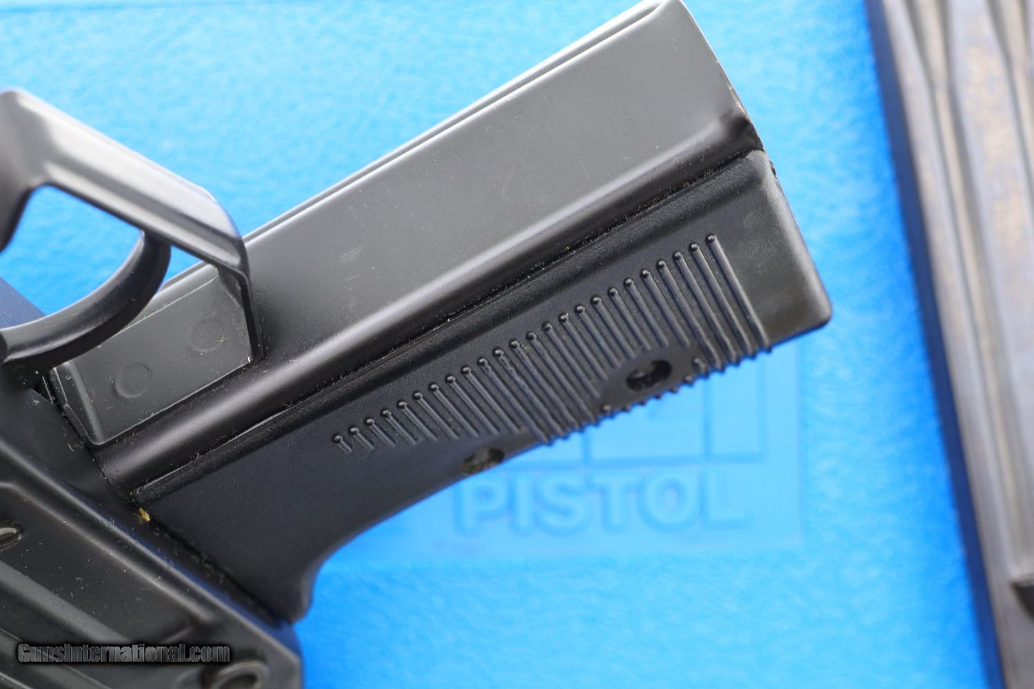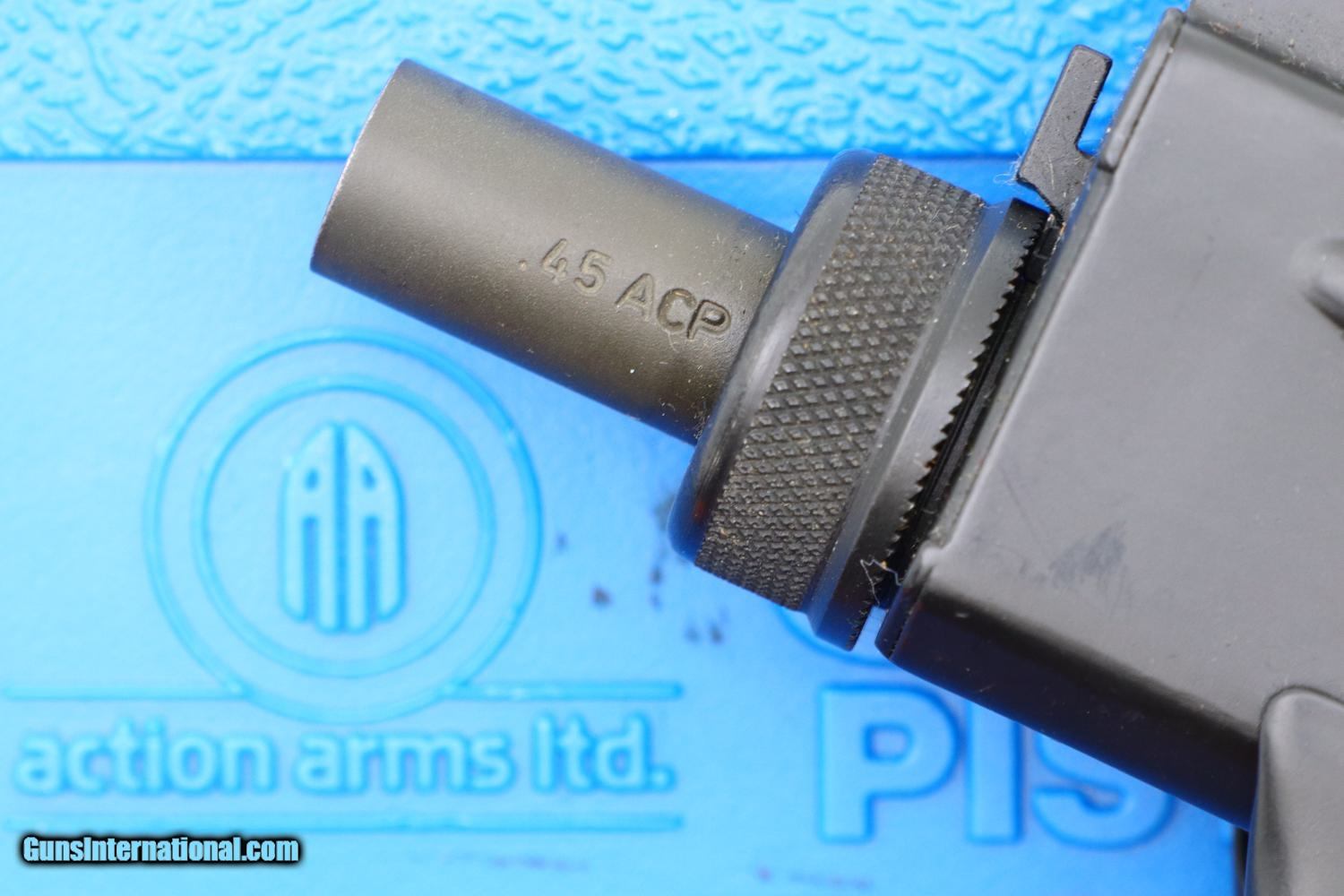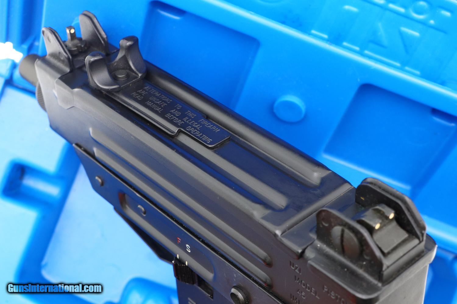 Description: Synopsis: IMI, Uzi Model 45 Pistol, Israel, Boxed UP53741, FB01164 Description: Scarce, highly charismatic Israeli Uzi pistol, .45 ACP, based on the classic Uzi carbine, this example near new in blue transport case with sight adjustment tool and 10 shot magazine. Standard pistol with three dot sighting system. The front sight is elevation adjustable; the rear sight is horizontally adjustable, both with protective ears. Non reciprocating top mounted charging handle. Left side of receiver marked with model, caliber, and manufacturer. Right side of receiver refrences Action Arms LTD as importer and serial number. Complete with original 10 shot magazine having 2 marked indicator windows, sight adjustment tool and blue transport case. No literature. Production was from approximately 1984 to 1993. Condition: Near new, with minor handling marks, as photographed. Mirror bore. Perfect manual mechanics though safety is difficult to move from fire to safe. EXC shipping box. Your chance to own a classic ‘bad boy’ pistol, in the most desirable .45ACP caliber, as featured in 1980s action movies! ~~Insured shipping fee of $75; most packages shipped using FedEx 2nd Day.~~ SOLD Manufacturer: IMI Serial Number: UP53741 Caliber Info: .45 ACP |