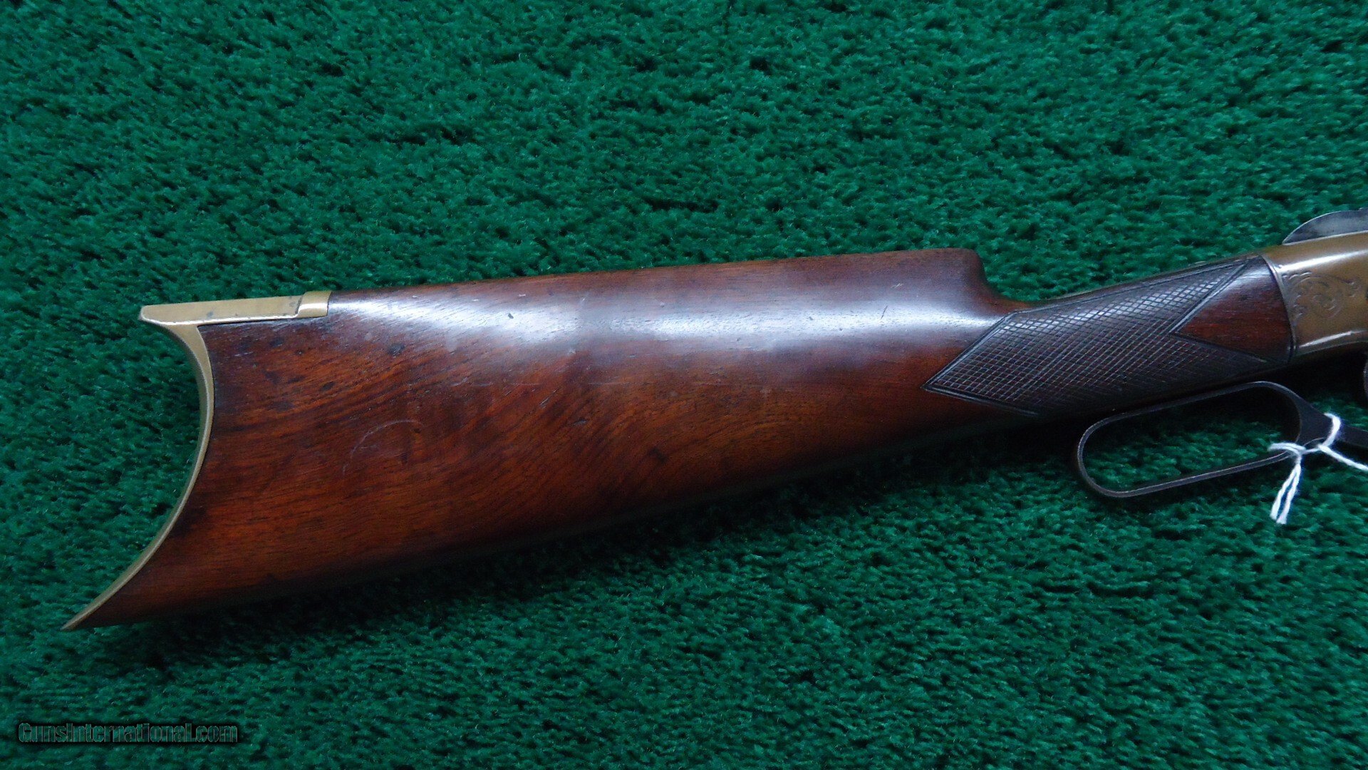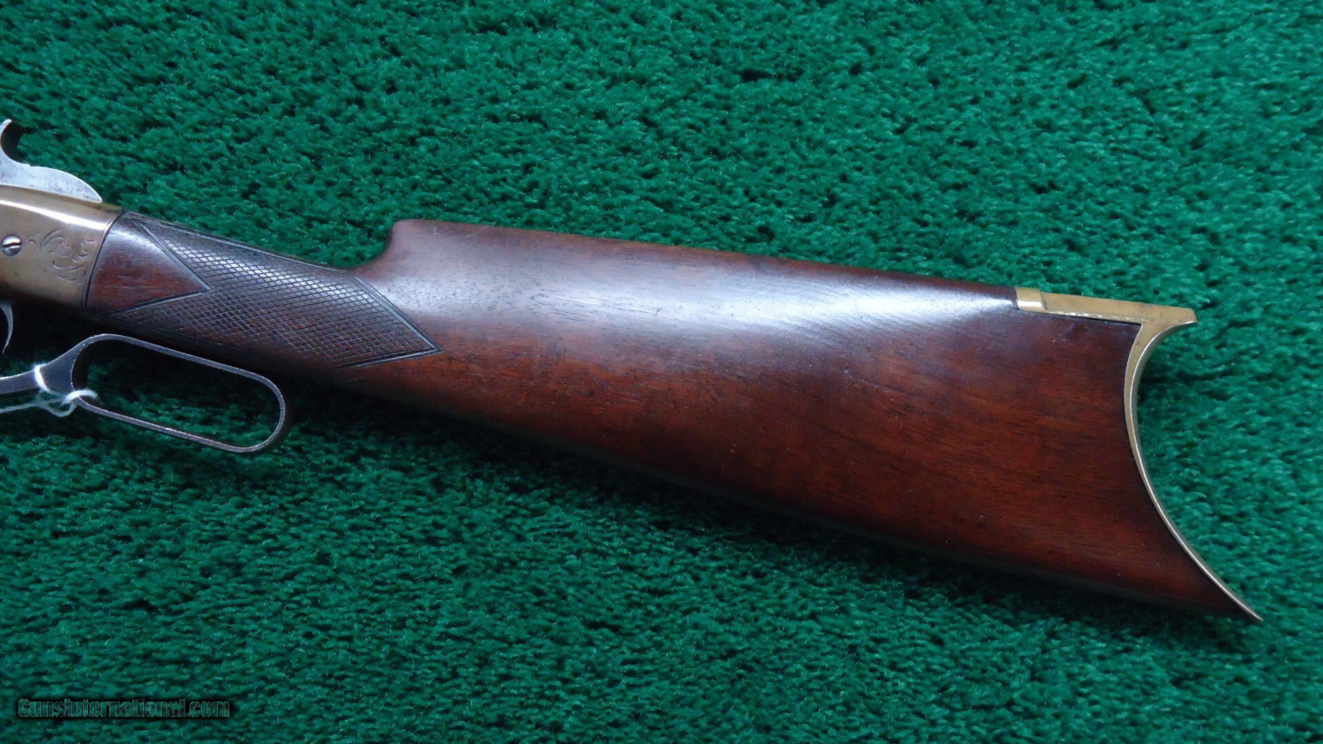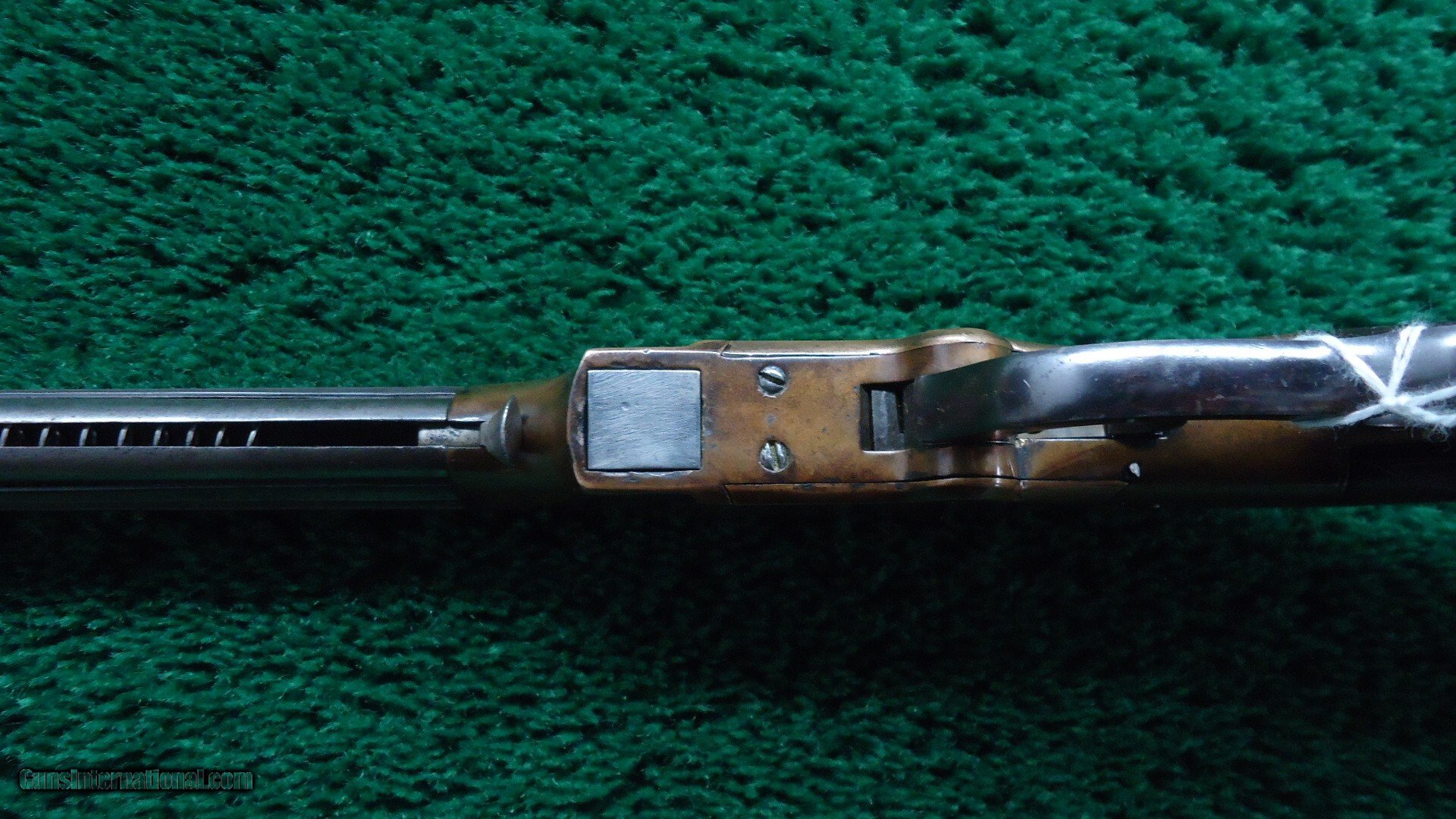 Description: 16-1/2 inch octagon barrel chambered in 41 caliber "Rocket Ball". This was self contained ammunition. Good shiny bore with good rifling and just a few scattered light pits. Sights include a small blade front and elevation adjustable notch rear. Barrel and integral full length magazine tube have been cleaned long ago and are gray patina with only a partial barrel patent marking discernible. Brass receiver is engraved and shows traces of tarnished silver plating with the balance having toned to a mustard patina. Varnished walnut stock has checkering in the wrist and some minor handling mars and a hairline crack coming off the lower tang. Brass crescent shaped buttplate also has some edge engraving and a mustard patina. About 1,000 of these carbines were manufactured in three different barrel lengths between 1857-1860. Leroy Merz Antique Firearms specializes in antique and vintage Winchesters and other fine American firearms. Since 1965 Mr. Merz has taken part in the world of firearms and has been a contributor to many well known reference books. We have hundreds of additional guns in every price range at our home online. Search for Merz Antiques in google. Antique: Yes Price: $24,750.00 Contact Seller |