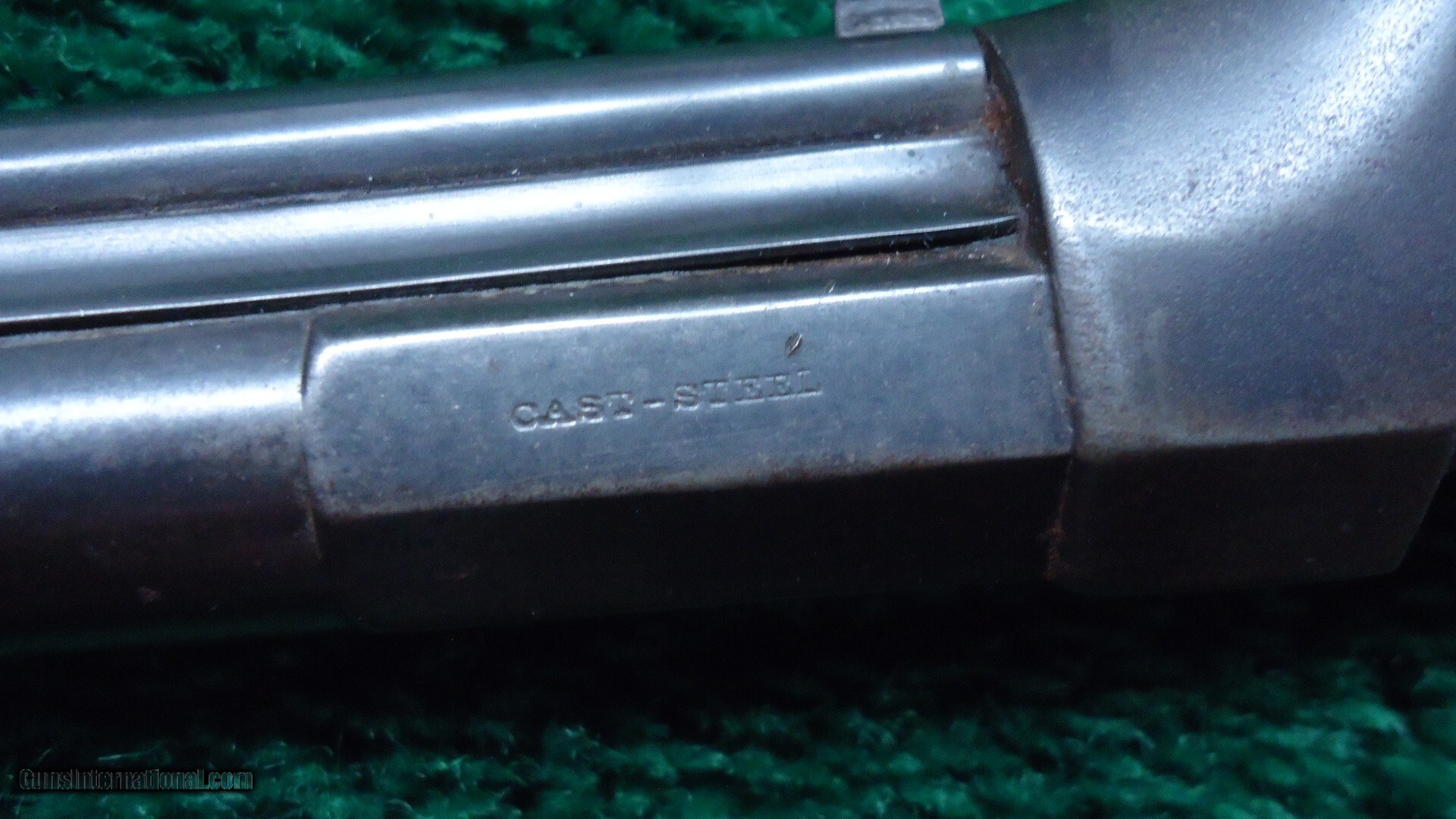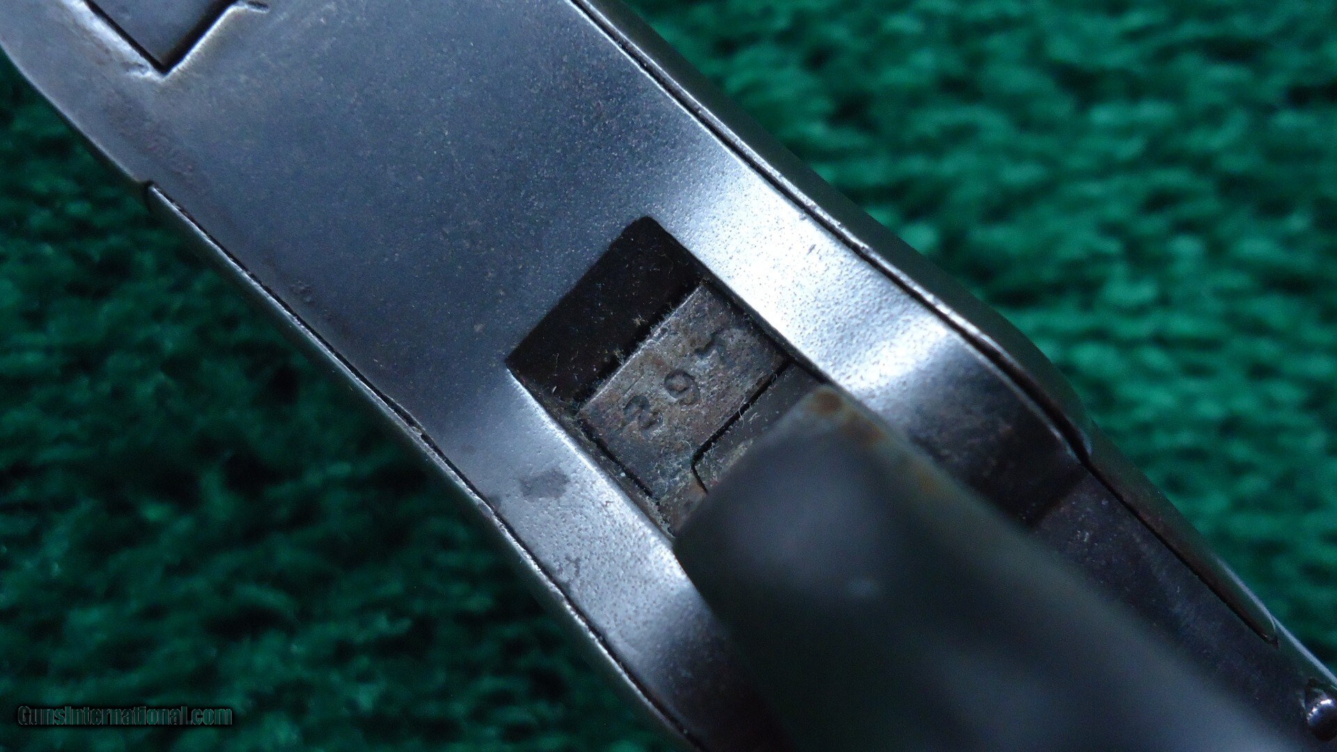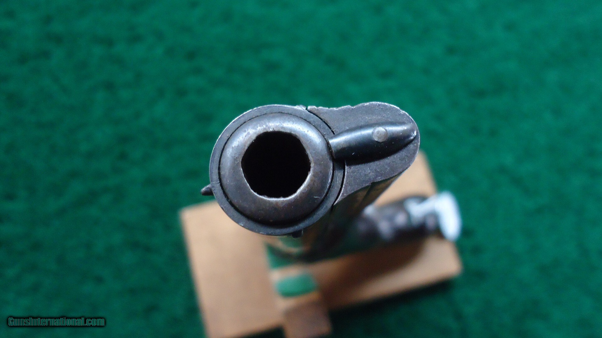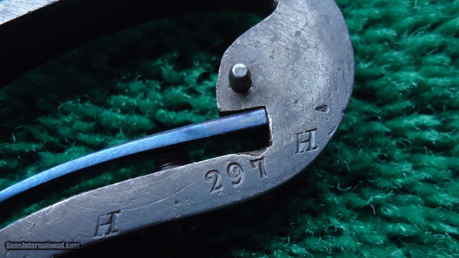 Description: Factory engraved early production serial number 297 small frame No. 1 Volcanic lever action pistol has an 4 inch part octagon barrel chambered in 36 caliber and has a very good shiny bore. These pistols fired the self contained "Rocket Ball". Features a nicely crowned muzzle face. The top of the barrel is stamped "SMITH & WESSON / NORWICH, CT" while one flat reads "PATENT / FEB 14,1854" and another reads " CAST-STEEL". Integral 6-shot magazine below the barrel. Sights include a post blade front and a fixed notch rear. Barrel and magazine tube assembly as well as the frame have traces of blue remaining with the balance a plum/brown patina. The blued iron frame has factory scroll engraving. Varnished Rosewood grips are numbered to the gun and fit good and have just some minor wear. Action functions properly. This Smith & Wesson Volcanic pistol was manufactured in 1855. Only about 1,200 of these 36 caliber small frame No. 1 Volcanic pistols were made between 1854-1855. This was the first Smith & Wesson branded firearm based on Daniel Wesson's 1854 patent. A rare and historic pistol that is important to S&W collectors and Winchester collectors alike. Leroy Merz Antique Firearms specializes in antique and vintage Winchesters and other fine American firearms. Since 1965 Mr. Merz has taken part in the world of firearms and has been a contributor to many well known reference books. We have hundreds of additional guns in every price range at our home online. Search for Merz Antiques in google. Antique: Yes Handgun Caliber: .31 Price: $8,850.00 Contact Seller |