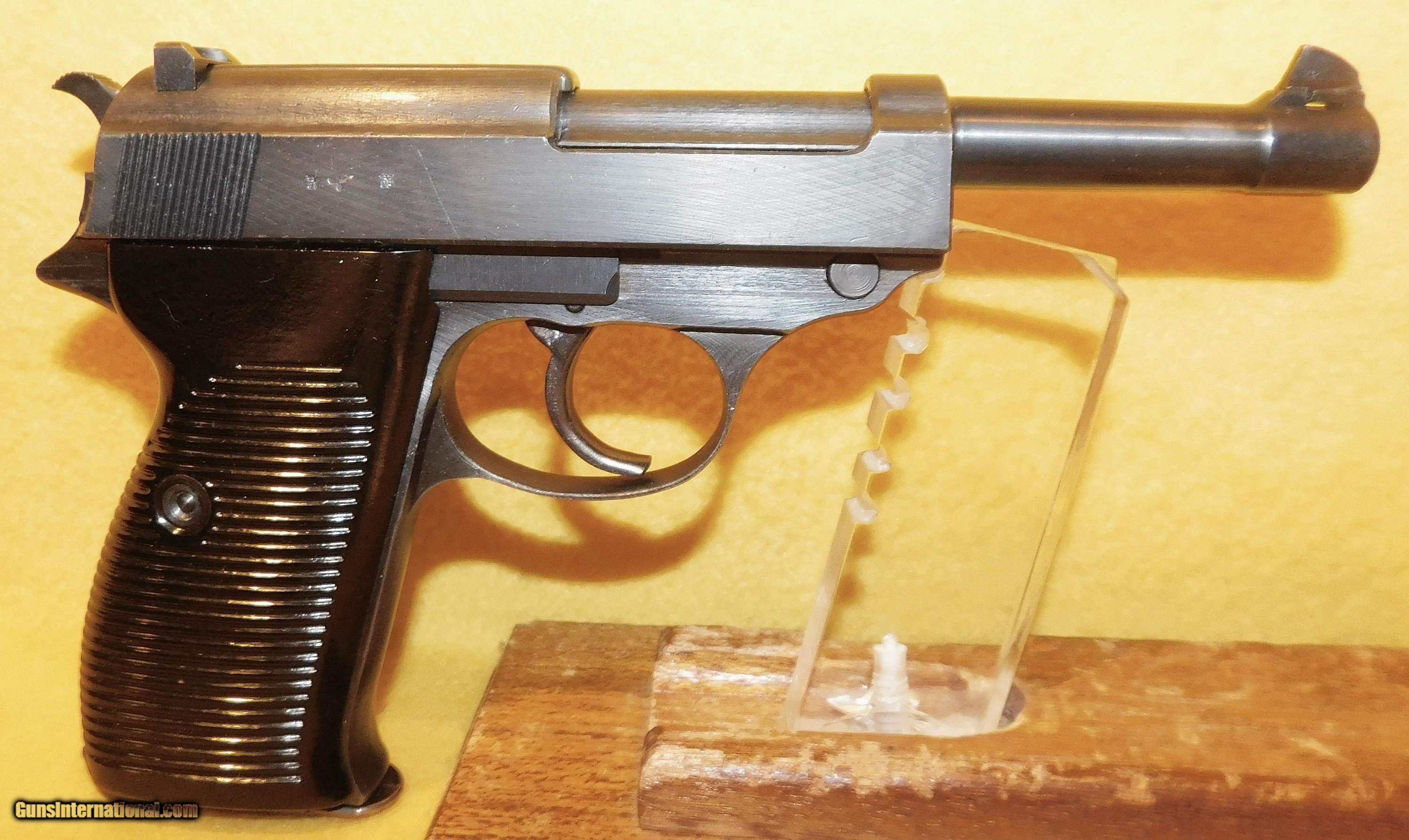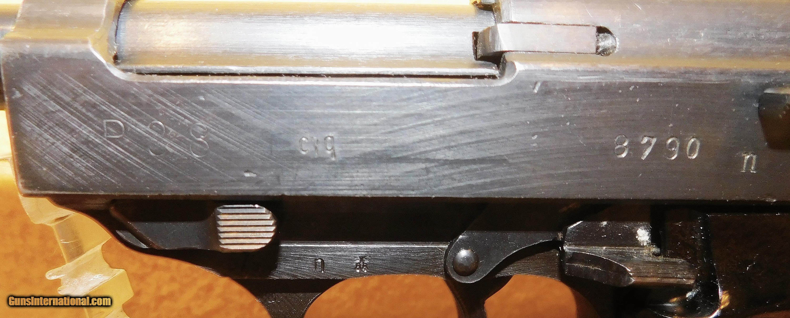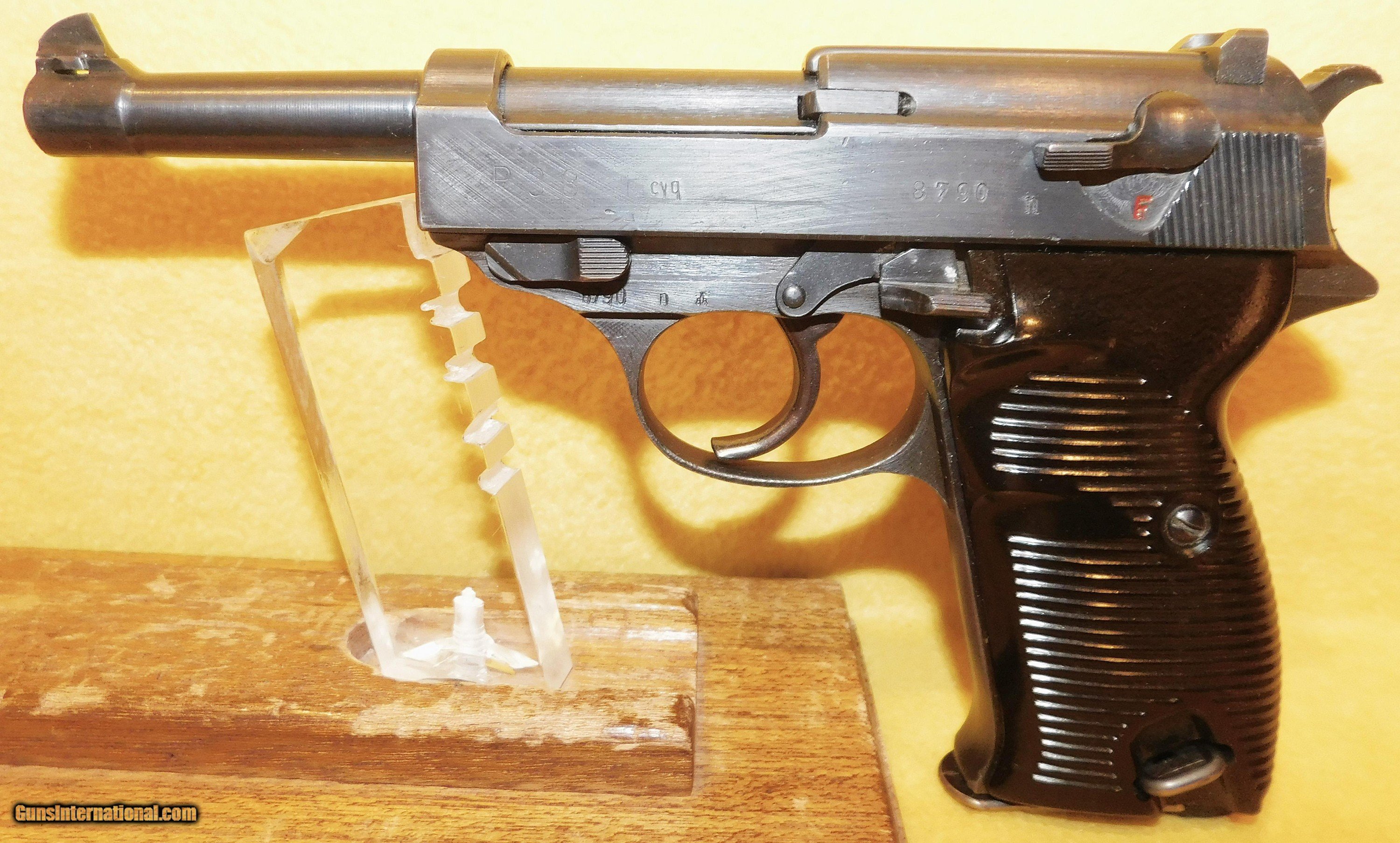 Description: SPREEWERK (WALTHER) CYQ P38 IN 9MM CAL., WITH 4 .75" BARREL. COLOR BLUE. CONDITION 96%+. SERIAL NUMBER 8790 n. SPREEWERK CYQ P38 n SERIES (WALTHER) IN 9MM CALIBER, MIRROR BORE, GRIPS EXCELLENT, AII PROPER WAFFEN MARKS, COMES WITH PROPER DATED CLAM SHELL HOLSTER (WAA 938 9 OAKLEAF ON A RUG 1943), TWO MAGAZINES (JVC MARKED) AND (WAFFEN 358 SERIAL MAG.), 96%+ OVERALL CONDITION, OUR STOCK # D8114 SOLD |
