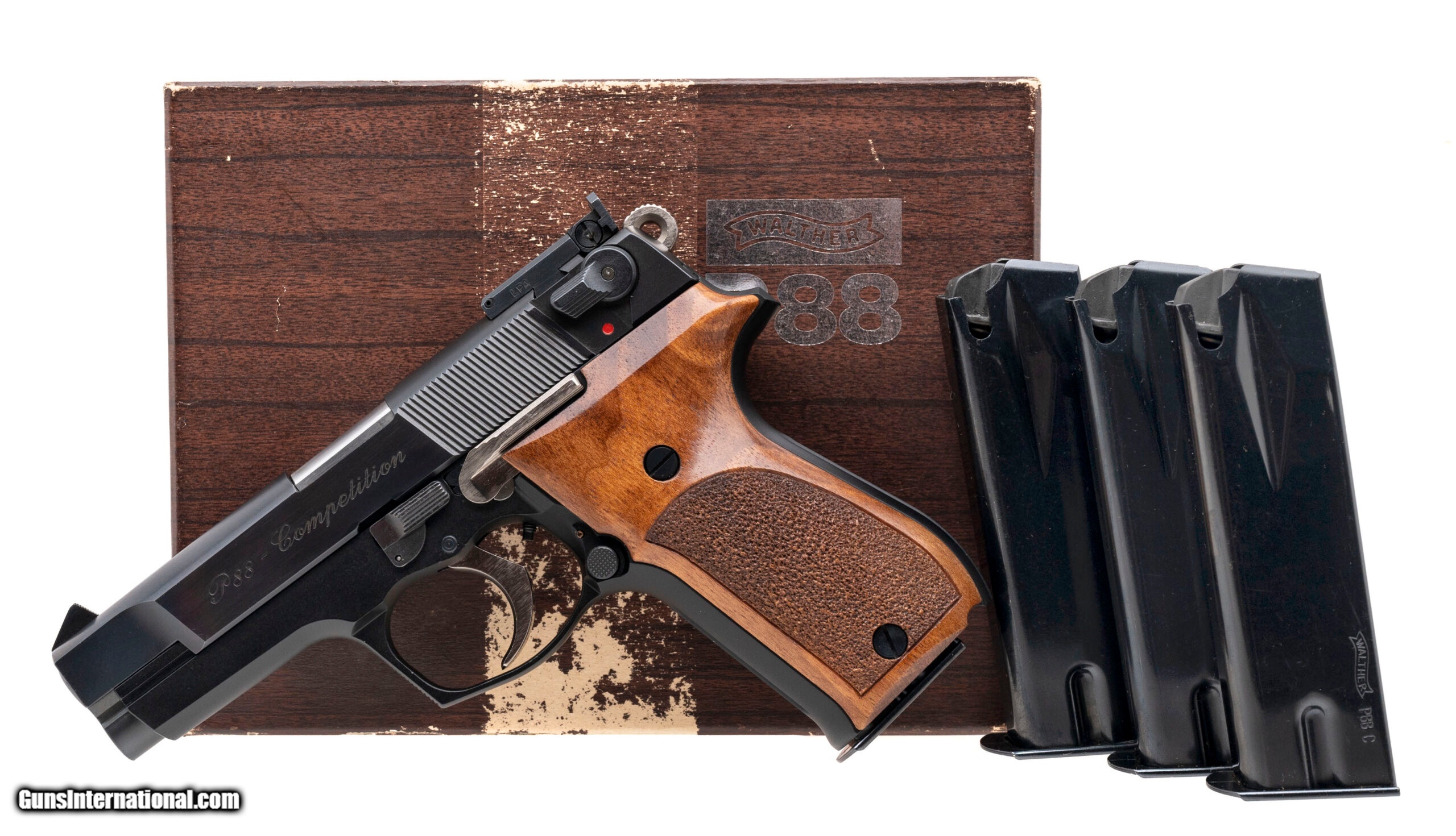 Description: "SN: 11542. Made in 1996. 9mm with a 3.9"" barrel. Bore is bright with strong rifling. Rare Competition Walther P88. Finish and walnut grips are in excellent condition. Comes with box and 3 extra magazines. Overall excellent condition example of a scarce German handgun. SOLD |