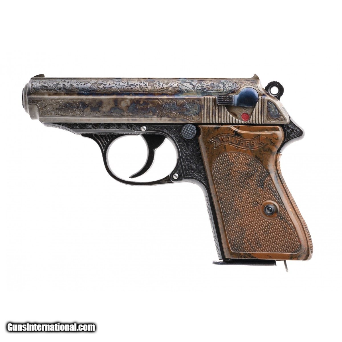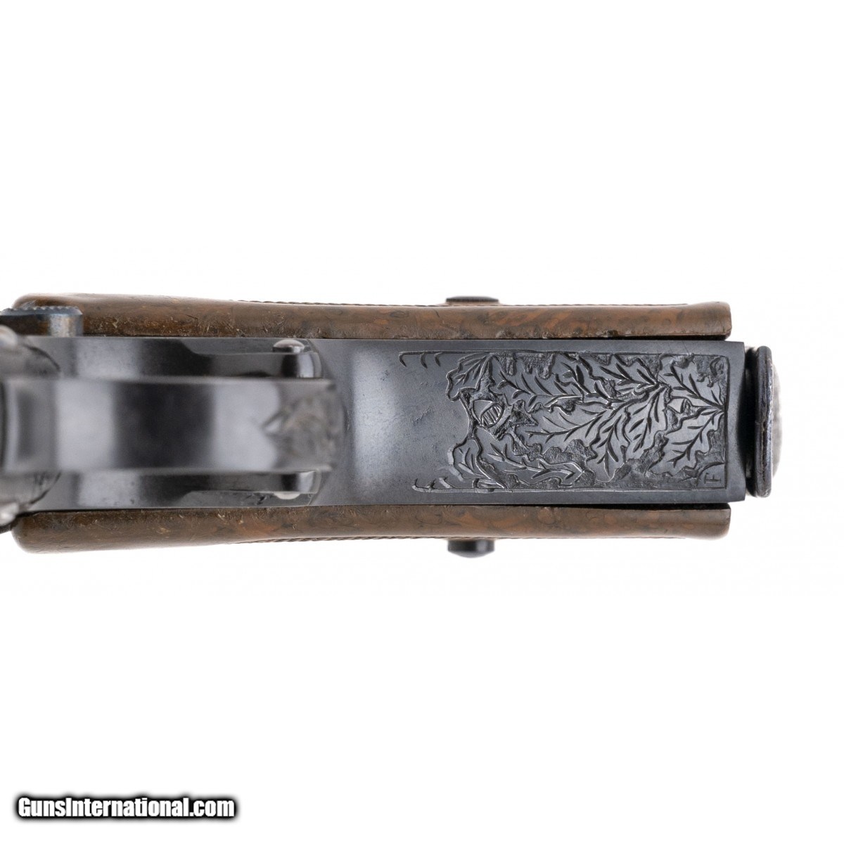 Description: "Serial number 324628K. Made circa 1944. 32 caliber with a 3" barrel. This gun is beautiful oak leaf engraved . The slide is case hardened and the frame is blued. Grips are excellent. Even the magazine plate is engraved. SOLD Curio/Relic: Yes |