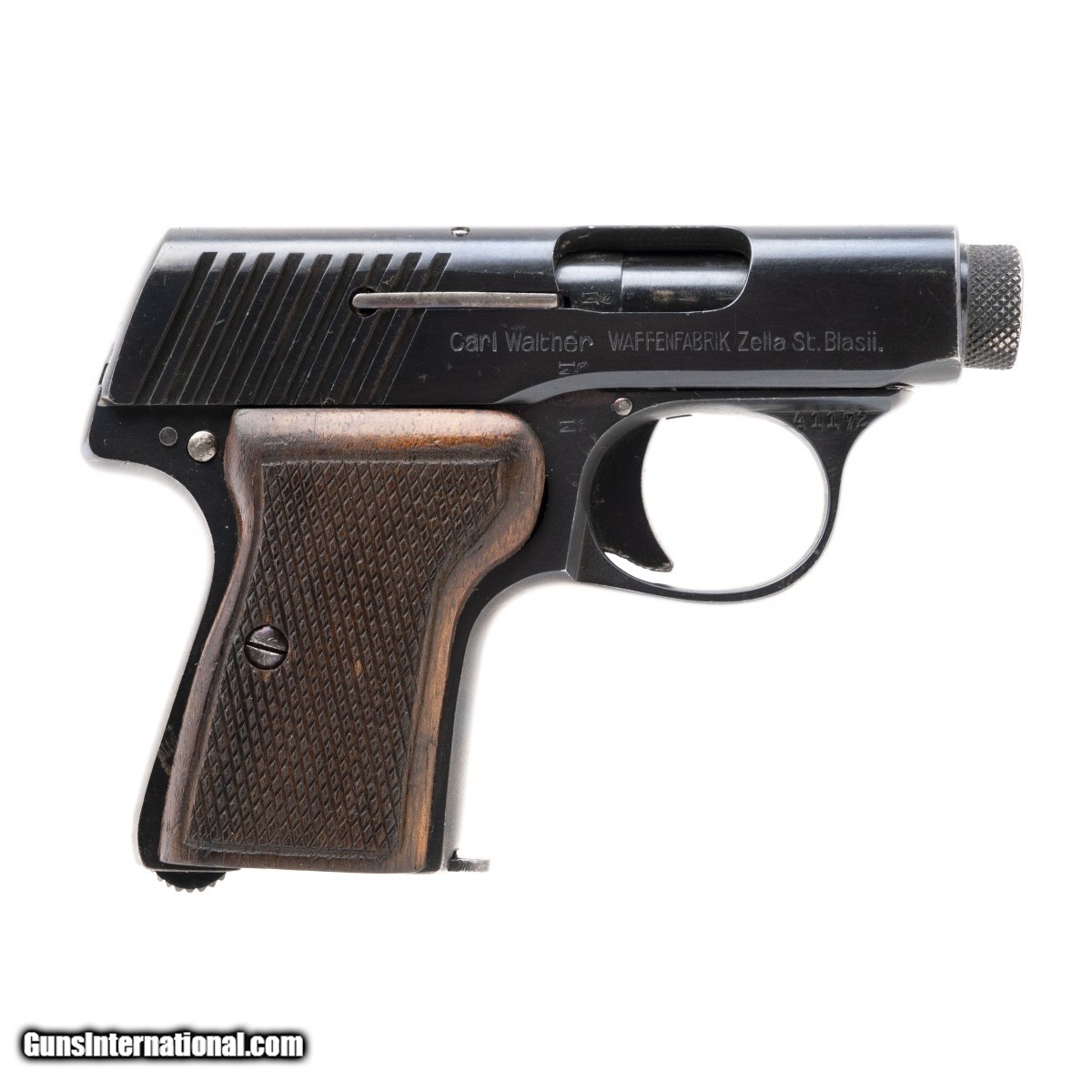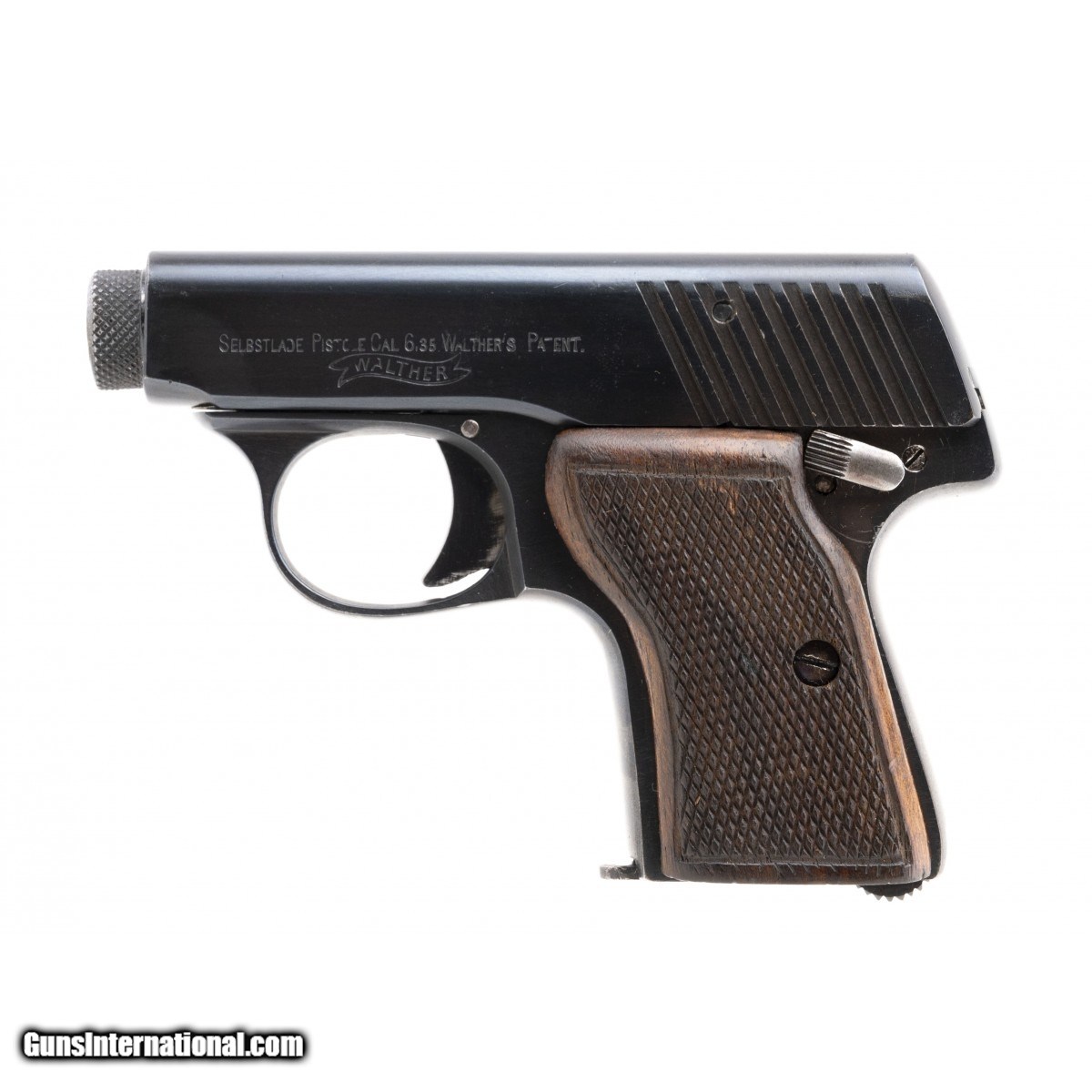 Semi-auto pocket pistol with 2.25"" barrel. The bore is very good with some etching. The pistol retains 98% of its original blue. The checkered wood grips are very good plus. The 1st variant of the Walther 5 has a sighting groove and tiny front sight post. Overall an excellent model 5!