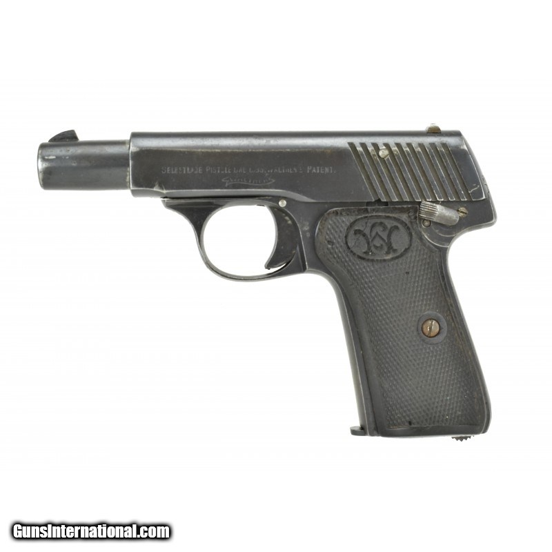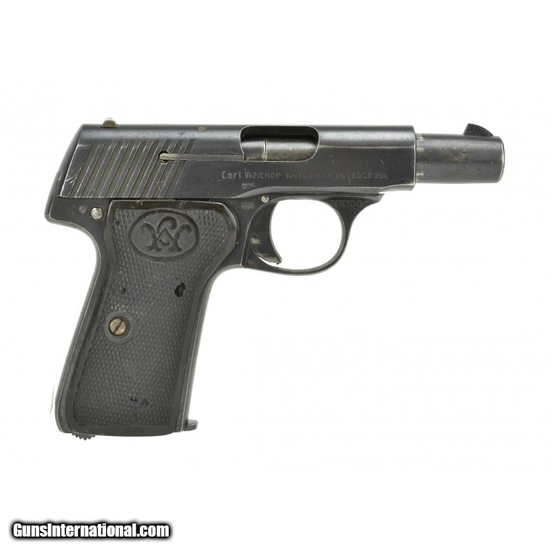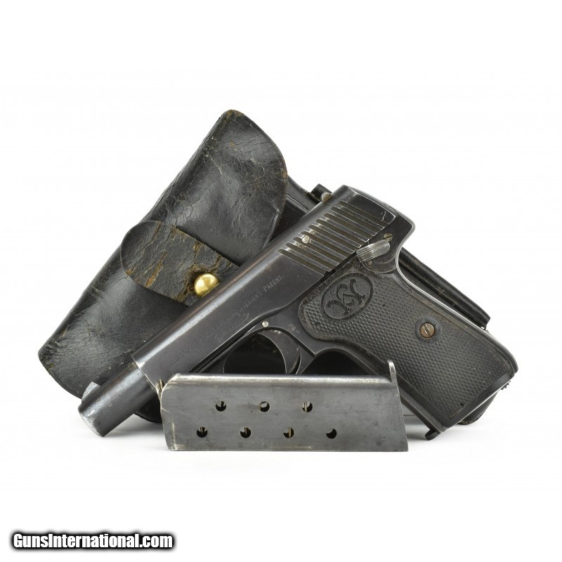Description: " Walther 7 .25 ACP caliber pistol. Scarce Model 7 only made 1917-1918. Bore has strong rifling with frosting. Left grip has a crack. Both grips have some bug damage. Comes with a holster and extra magazine. A great set up for a hard to find pistol. SOLD |