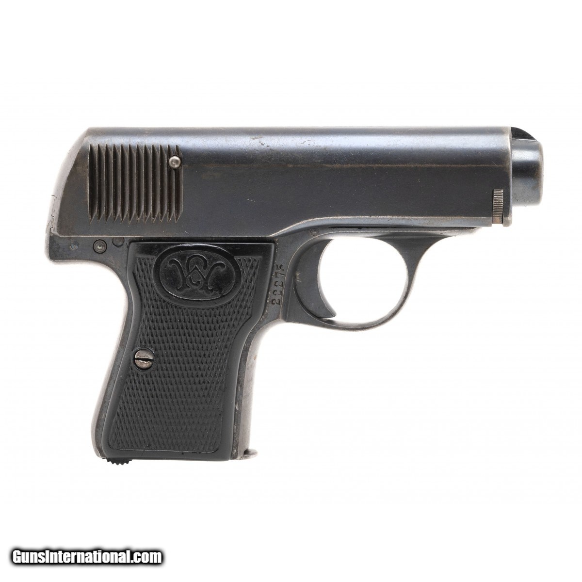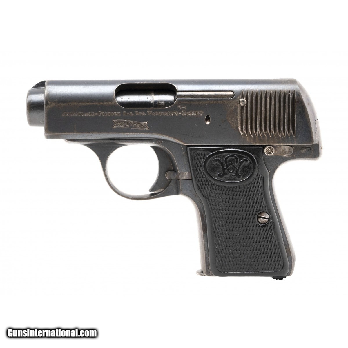 The Model 3 is one of the rarest of the early Walther numbered pistols. It was manufactured from 1910 to 1913. The 2.6"" 7.65mm (32ACP) barrel has an excellent bore with bright, strong rifling. The gun retains approx. 90% blue with speckling and fading grip straps. The left side of the slide is marked SELBSTLABE-PISTOLE CAL. E.75. WALTHER""S-PATENT over the Walther tradeark banner logo. It has German commerial crown over N proofs. The black checkered plastic grips, with the Walther W at the top, are fine. The action functions correctly. Thsi may be your only chance to acquire one of these rare Walther Model 5 pistols. Don't delay!