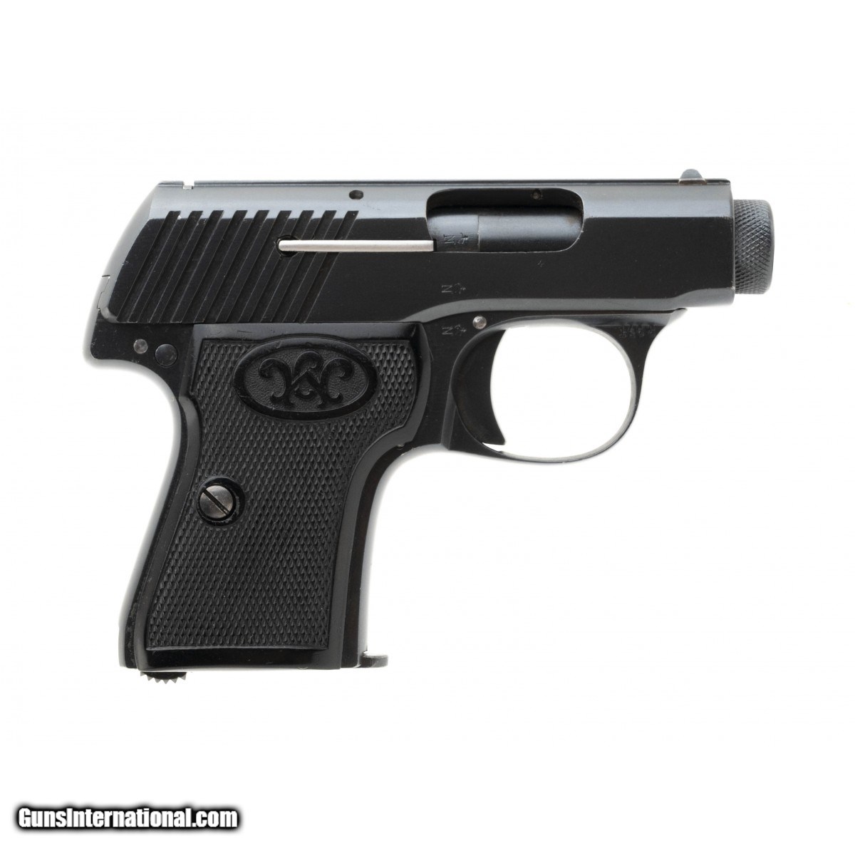 Description: " The 6.35mm (25ACP) Walther Model 5 was made from 1913 to 1915. It is a better quality version of the Model 2. The 2"" barrel has an excellent bore. The gun has approx. 98% blue. The left side of the slide is marked SELBSTLADE-PISTILE CAL. 6.35. WALTHER""S PATENT over the Walther banner logo. The checkered black plastic grips, with the Walther W at the top, are excellent with no cracks or chips. The correct magazine is present. The action functions correctly. If you collect early pocket autos, you will never need to upgrade this beauty! SOLD Curio/Relic: Yes |