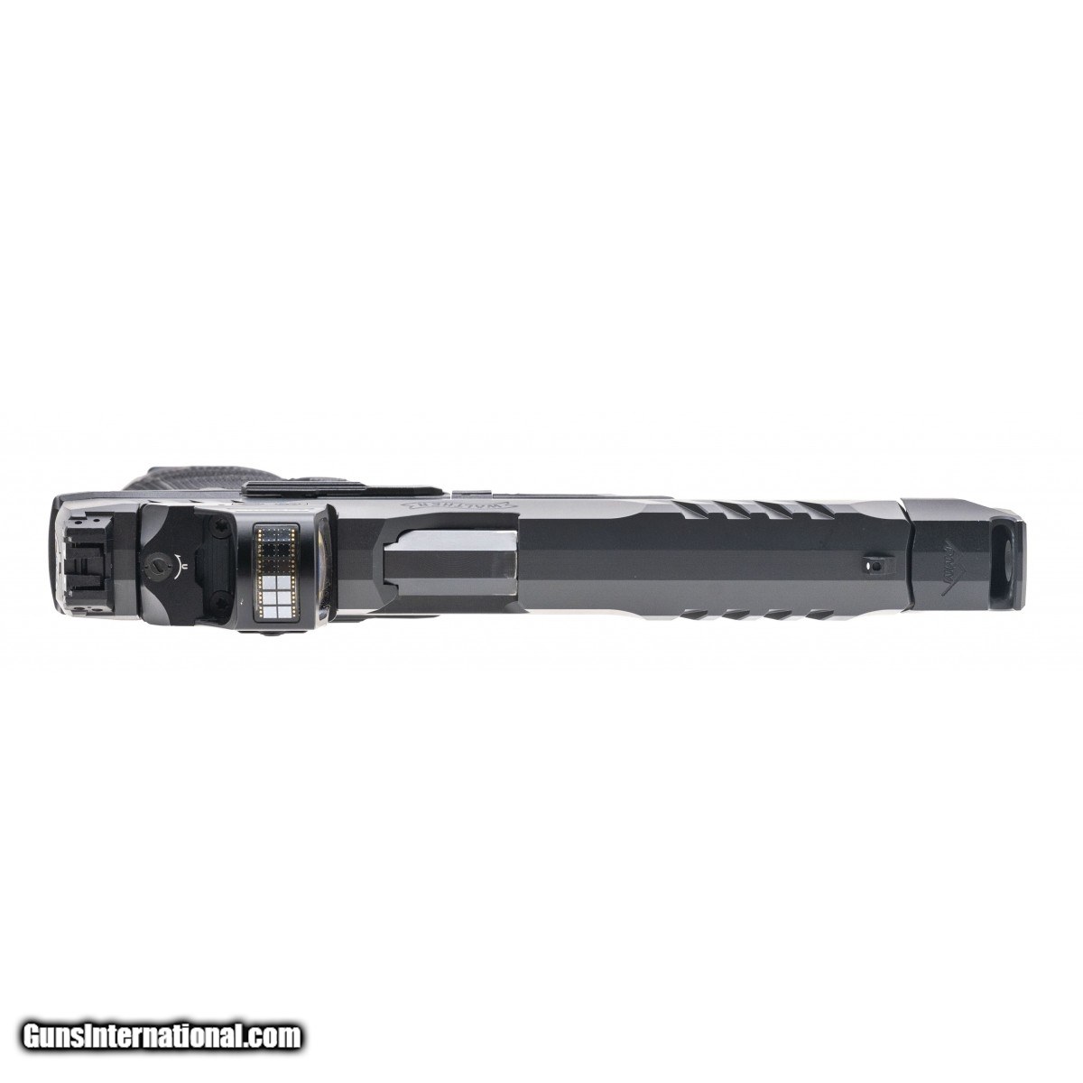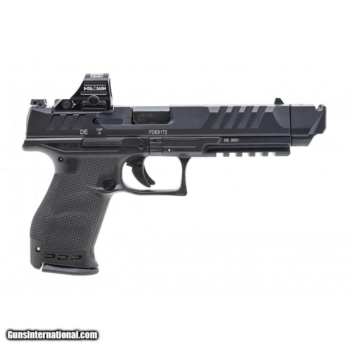Description: "SN:FDE8172. Modern Production. 9mm with a 5.75"" Compensated Jarvis barrel. Bore is in excellent condition. Full size polymer handgun. Finish and grips are in excellent condition. Pistol has holosun red dot. Overall condition is excellent. SOLD |