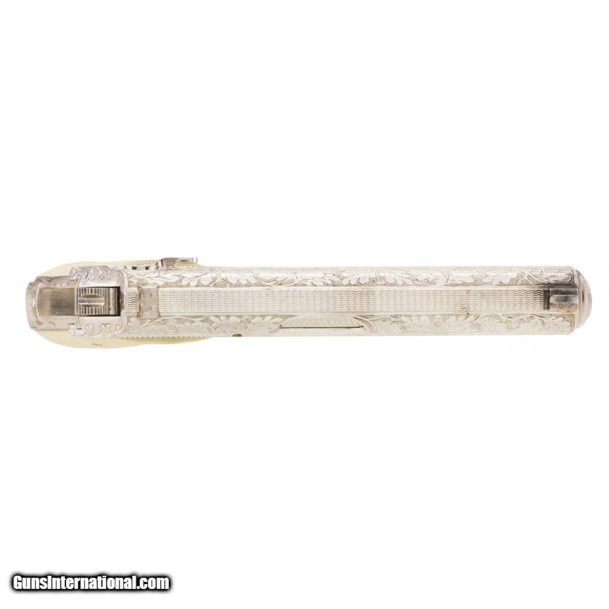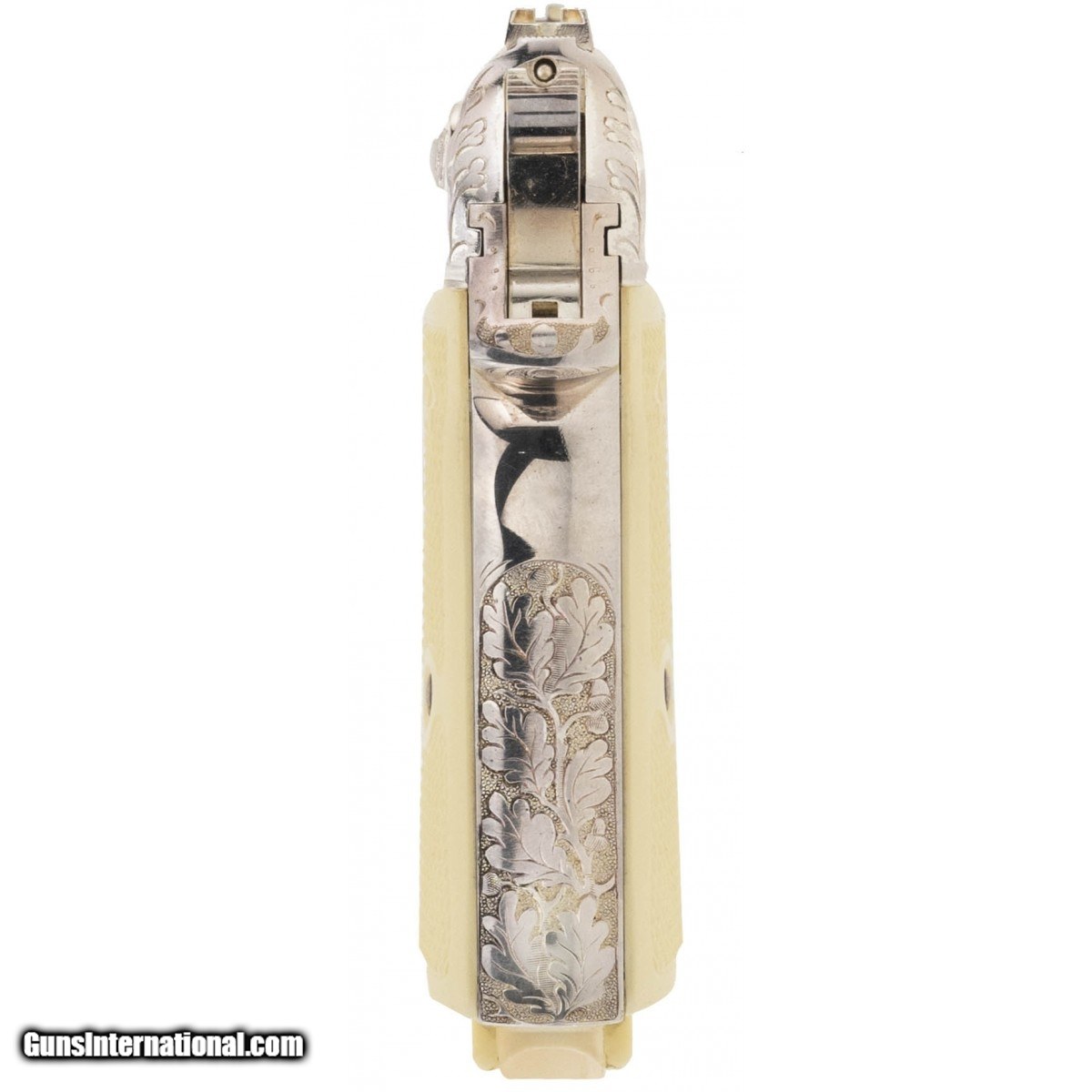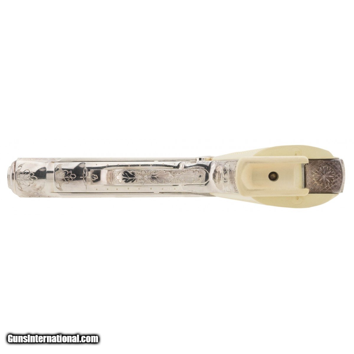 SN: 69009A. Beautiful W. German made factory engraved and silver plated pistol made in 1983. Has full coverage oak leaf engraving and lustrous silver plating, not nickel or chrome. The grips are the correct faux ivory for this period. Mint condition with box, papers and extra mag.