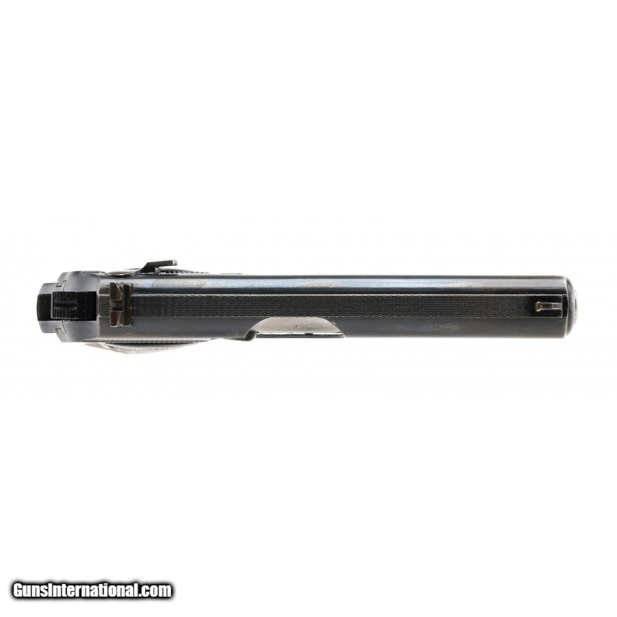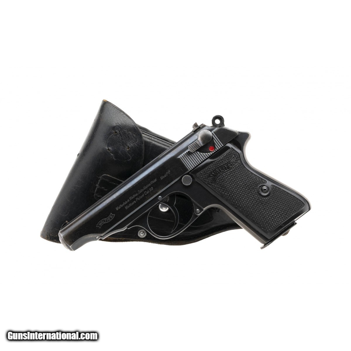 This eagle N inspected Walther .22 caliber PP pistol with holster is circa 1941. The barrel has an excellent bore with bright, strong rifling. The slide has the standard Walther markings on the left side. The three eagle N Nazi commercial proofs are on the right side of the barrel near the muzzle, the chamber, and the slide behind the ejection port. The gun has approx. 92% blue with the grip straps turning brown. The grips are excellent with no cracks or chips. The unmarked blued magazine is excellent. The action functions correctly. The holster is very good and is marked jba 1941. The right side of the flap had a device mounted to it at one time. There is no spare magazine. This very nice WWII era Walther PP in the desirable .22 caliber would fit any German or European auto pistol collection.