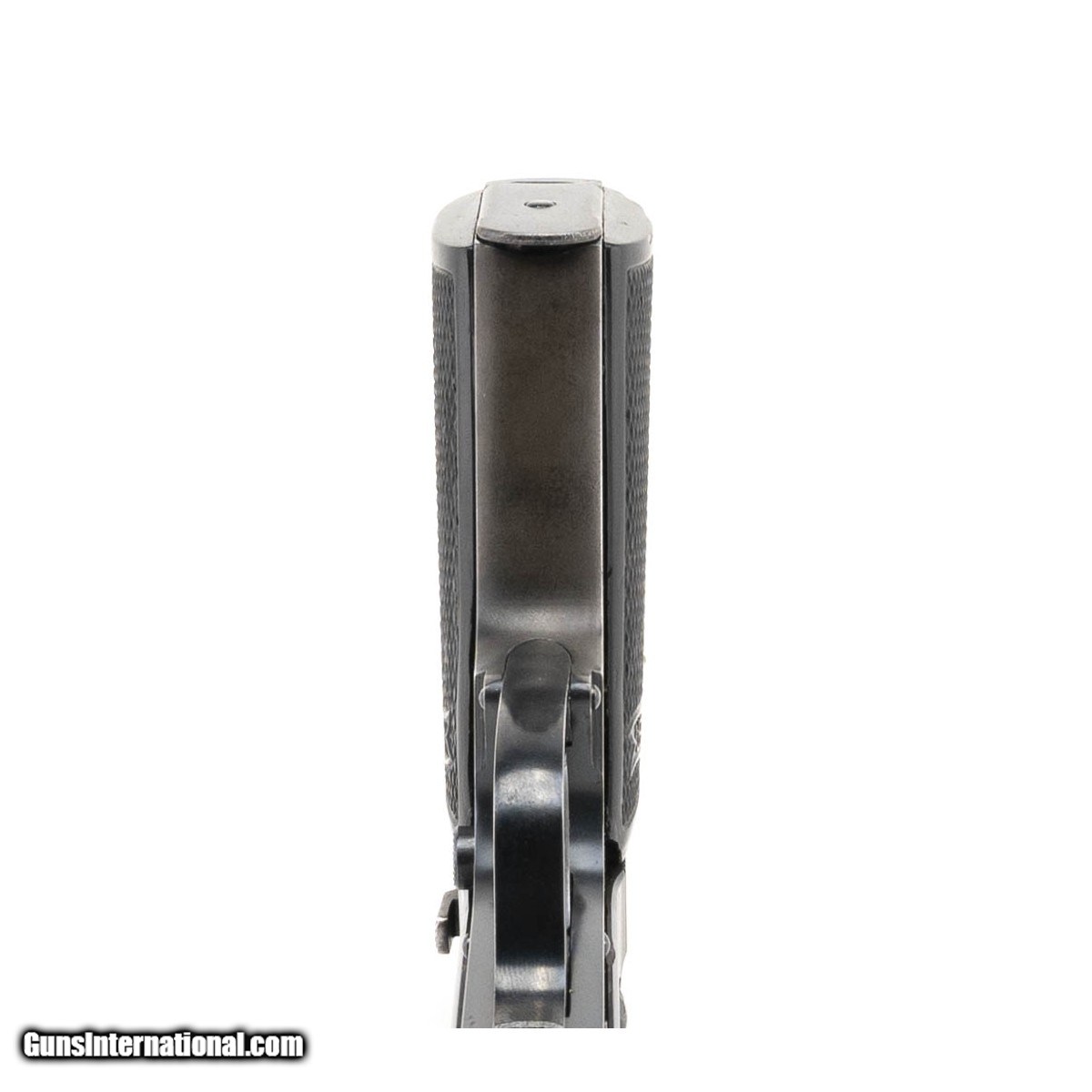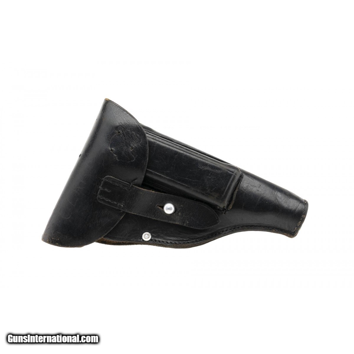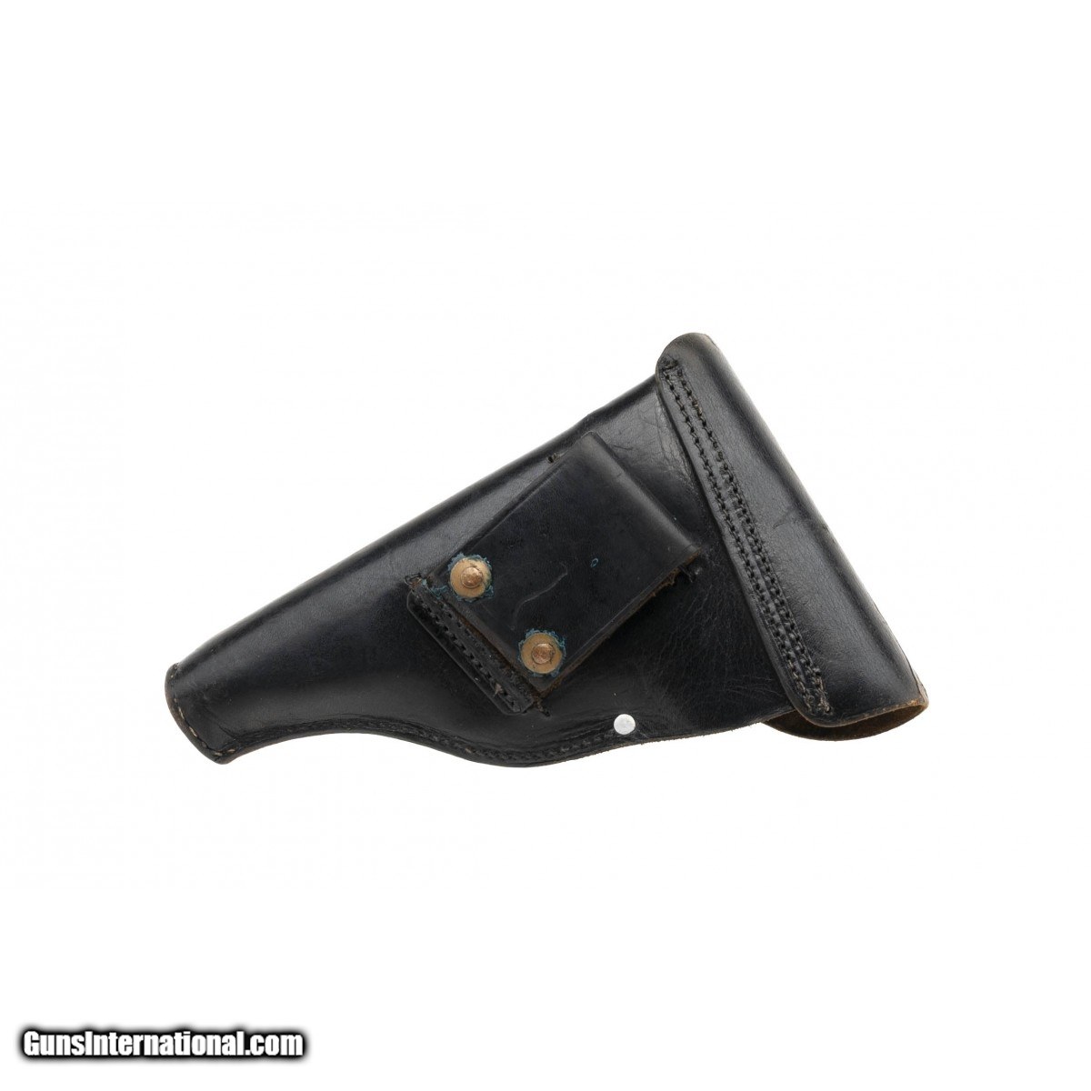 Description: " This eagle N inspected Walther .22 caliber PP pistol with holster is circa 1941. The barrel has an excellent bore with bright, strong rifling. The slide has the standard Walther markings on the left side. The three eagle N Nazi commercial proofs are on the right side of the barrel near the muzzle, the chamber, and the slide behind the ejection port. The gun has approx. 92% blue with the grip straps turning brown. The grips are excellent with no cracks or chips. The unmarked blued magazine is excellent. The action functions correctly. The holster is very good and is marked jba 1941. The right side of the flap had a device mounted to it at one time. There is no spare magazine. This very nice WWII era Walther PP in the desirable .22 caliber would fit any German or European auto pistol collection. SOLD |