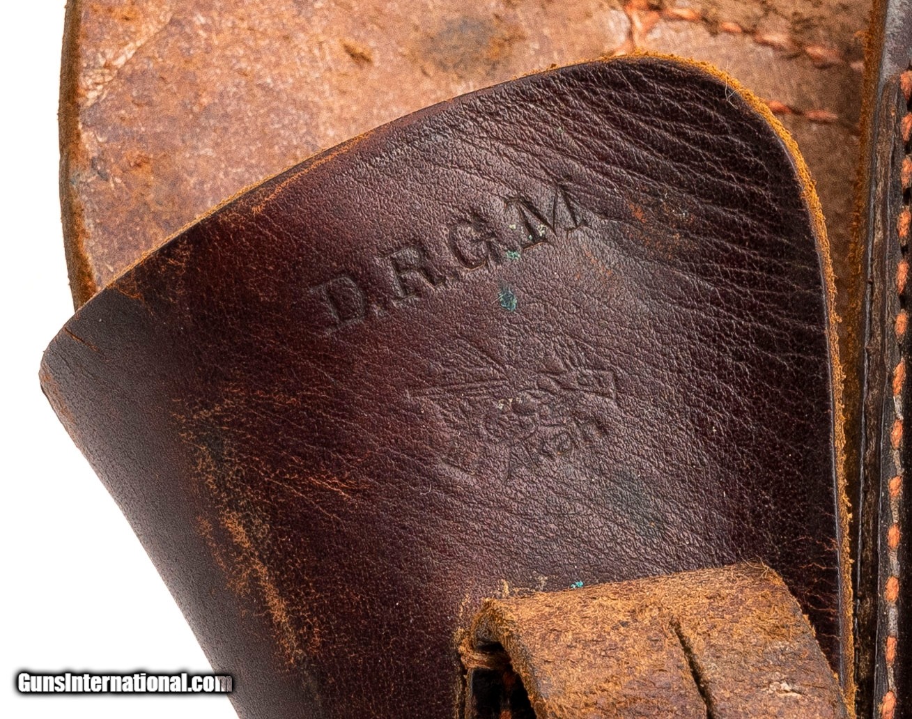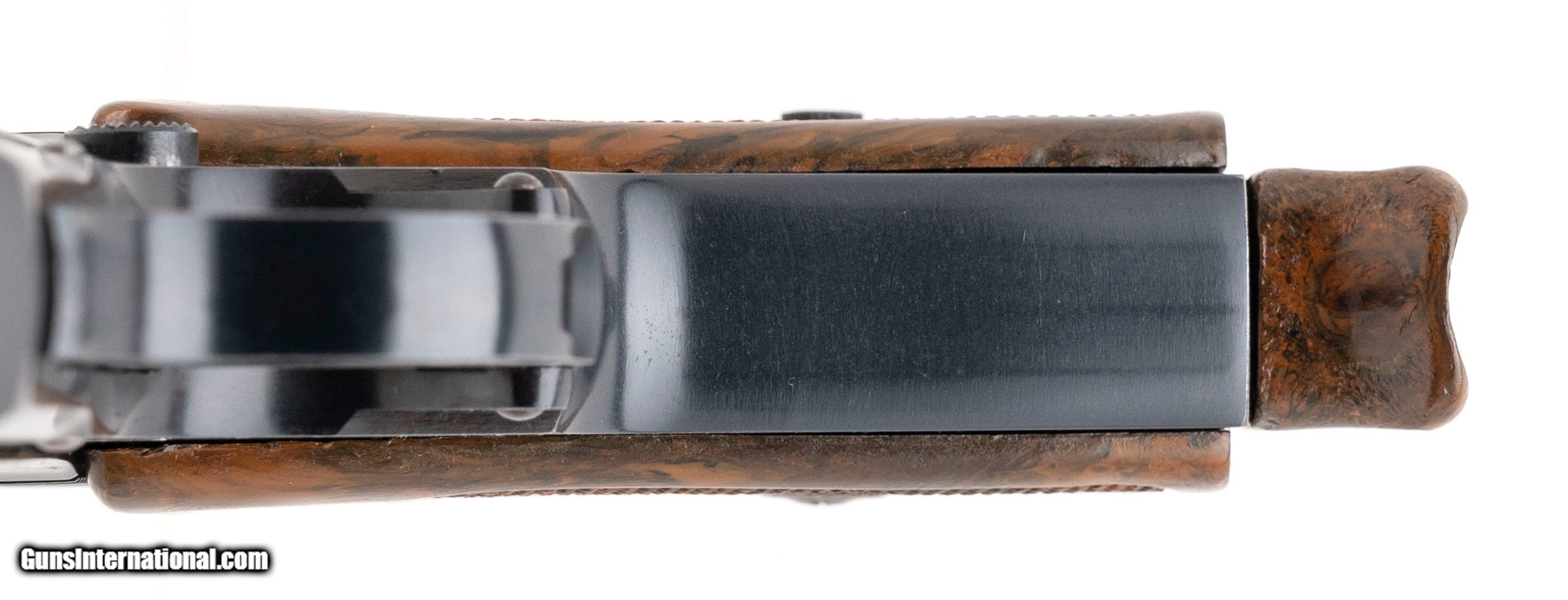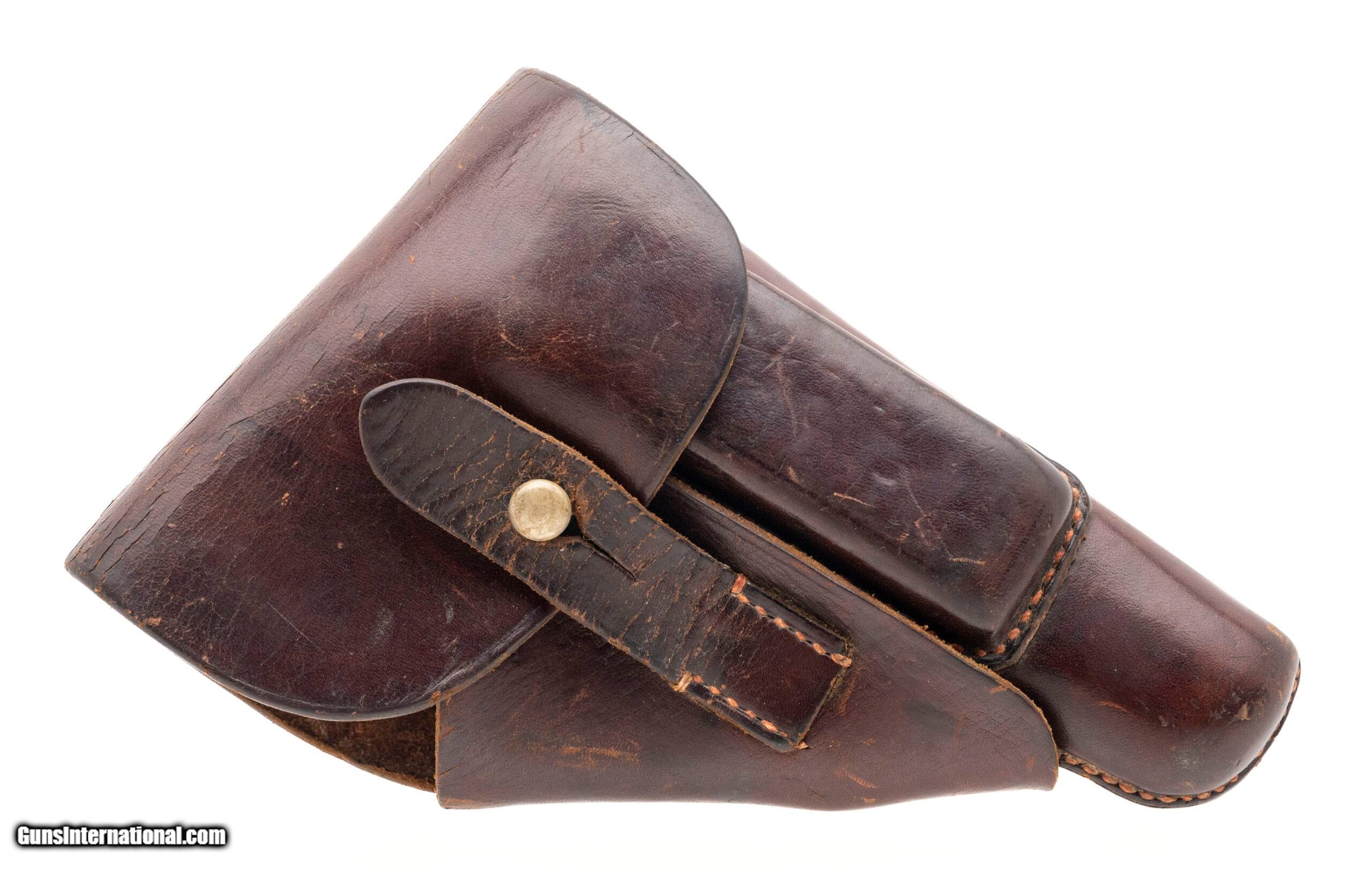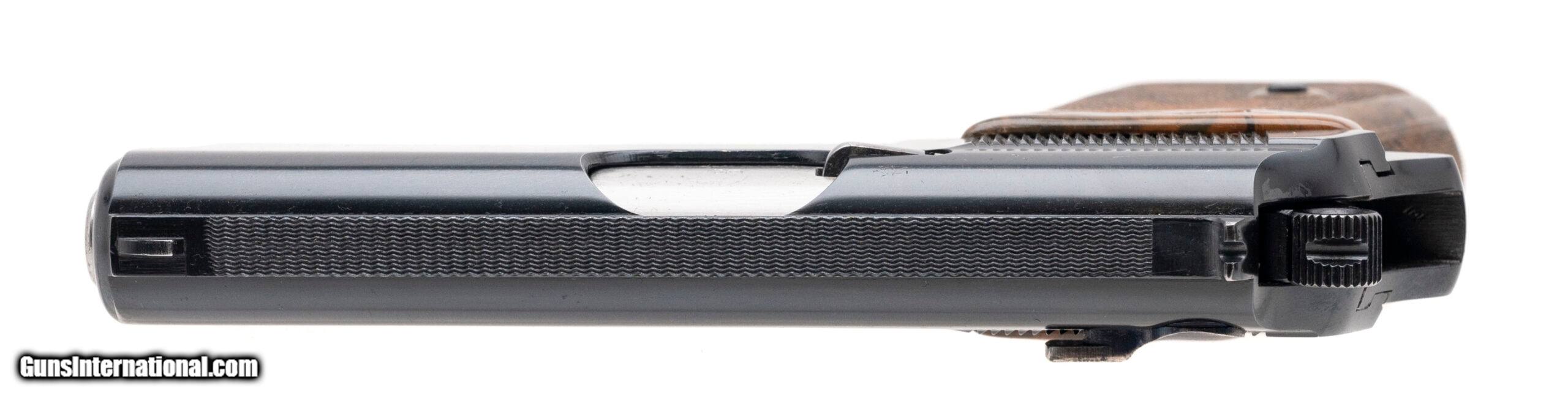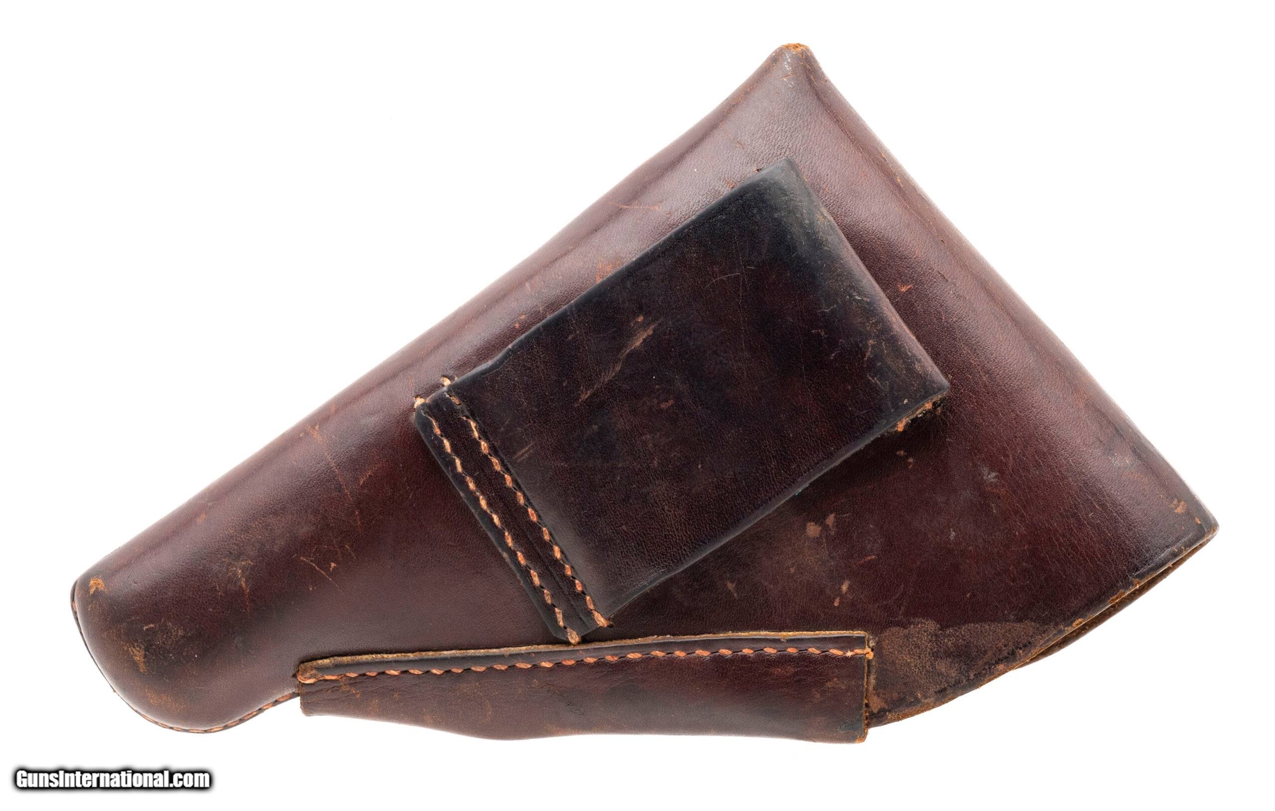 Description: "Serial No. 177863k, circa 1938, .22 caliber, 3.5" round barrel. Bore is excellent with strong rifling visible. Pre-war commercial model in scarce .22 cal. 98% finish remains, grips are in excellent condition. Action is smooth and functions correctly, comes with brown leather holster. Consignment SOLD |