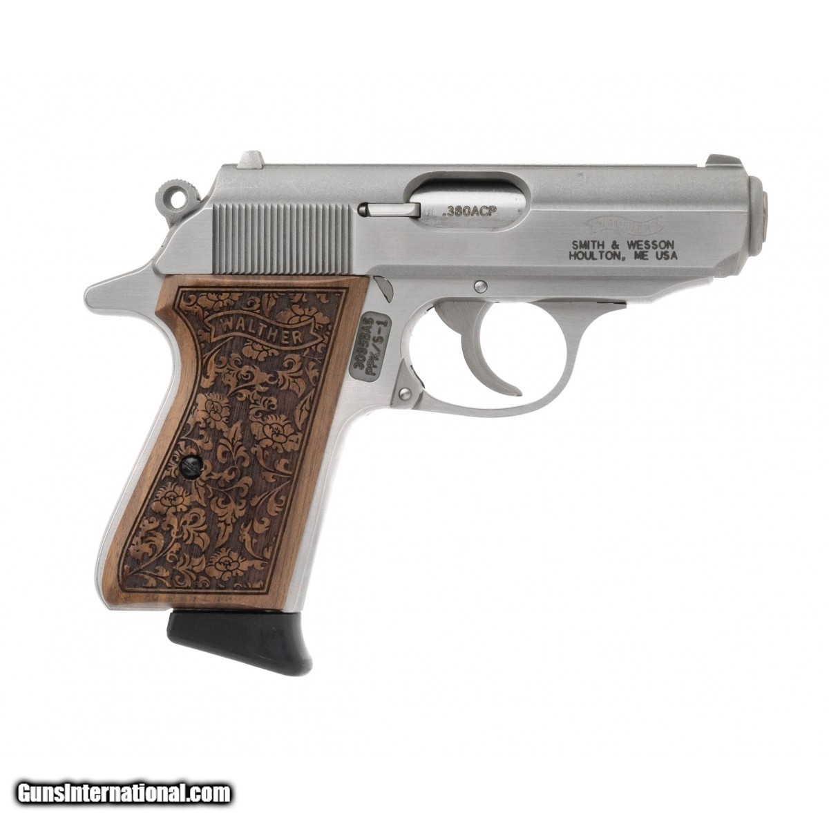 SN: 3085BAS. Modern production. .380ACP with a 3.3"" barrel, bore is excellent. Stainless pocket pistol with fixed sights, decocker-safety and floral engraved wood grips. Overall excellent condition.