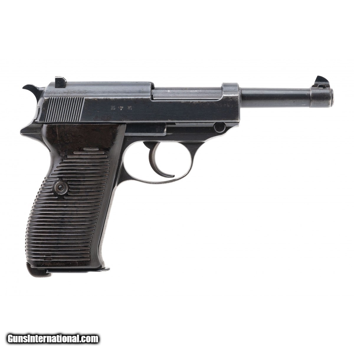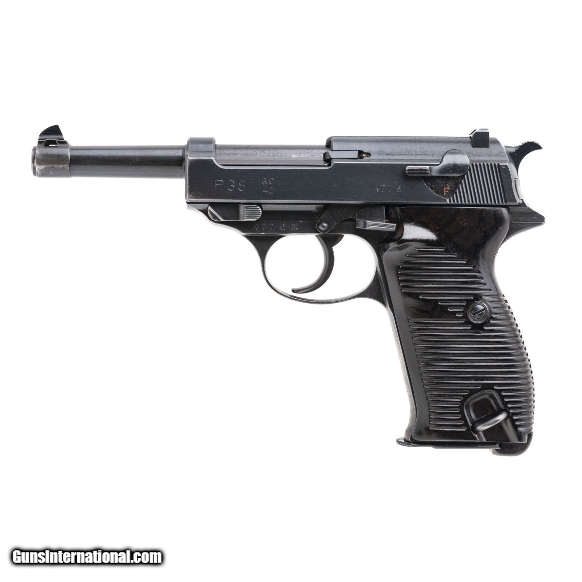 Serial No. 477d. made in May of 1942. 9mm with a 4.9"" barrel. Bore is bright with strong rifling. WWII German military pistol with matching numbers and appropriate E/359 Acceptance marks. Finish is in good with expected wear noted along the edges, light speckled pitting noted on the right side of the slide. Grips show light handling wear. Comes with hard-shell ""jln-1943"" marked holster. Action functions properly. Overall very good condition.