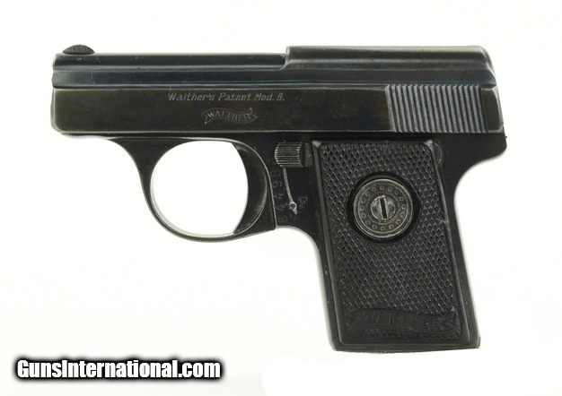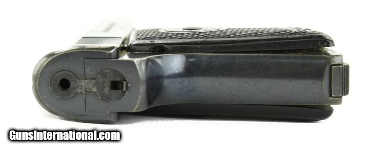 Description: Walther 9 .25 ACP caliber pistol. Very good plus Model 9. Excellent bore. Action works perfectly. Grips have no chips or cracks but show some slight warpage at the bottom of both grips. Magazine fits and works well but is a reproduction. One of the smaller Model 25 Autos.
