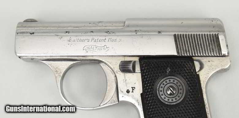 Walther 9 .25 Auto caliber pistol. Model 9, last model of the 1 thru 9 series of models. .25 caliber. Gun has a very good action and works perfectly. Grips are good with both sides being cracked and nicely repaired. In our opinion, the gun is re-nickeled and has 100% of the re-nickel. Model 9’s are among the smallest .25 Autos ever made.