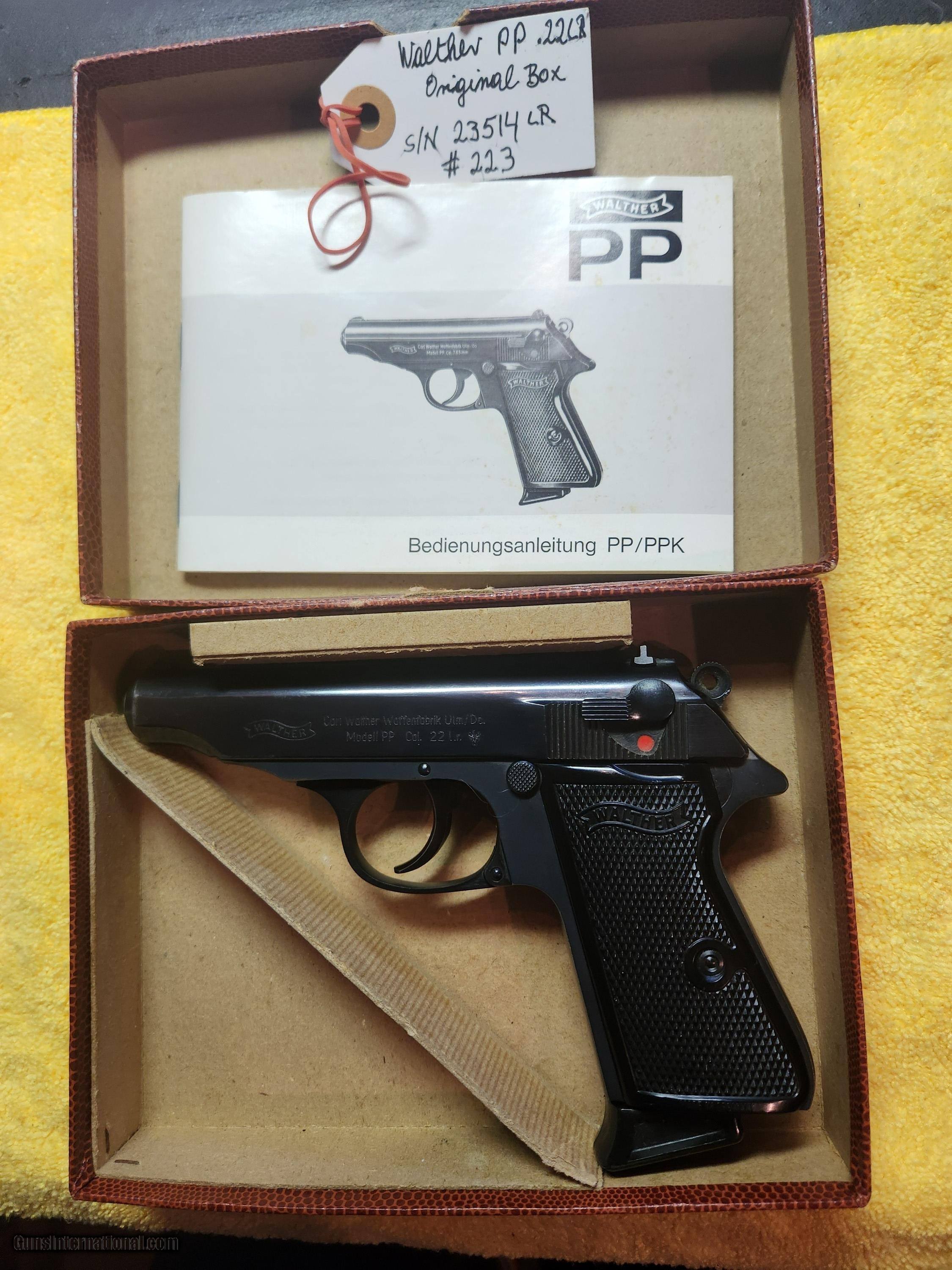 Description: 1964 West German Walther PP with beautiful factory blue finish chambered in .22LR. This is a high, collector's condition Walther with original matching s/n box and manual. Overall the finish rates 99%. The bore is bright and shiny with strong lands and grooves. The grips are in new condition. At 60 years old this one is in excellent like new condition gun. SOLD Curio/Relic: Yes Handgun Caliber: .22 Long Rifle Manufacturer: Walther Model: PP Serial Number: 23514 Condition: excellent Metal Condition: excellent Bore Condition: excellent Finish: Blue Manufacture Date: 1964 |
