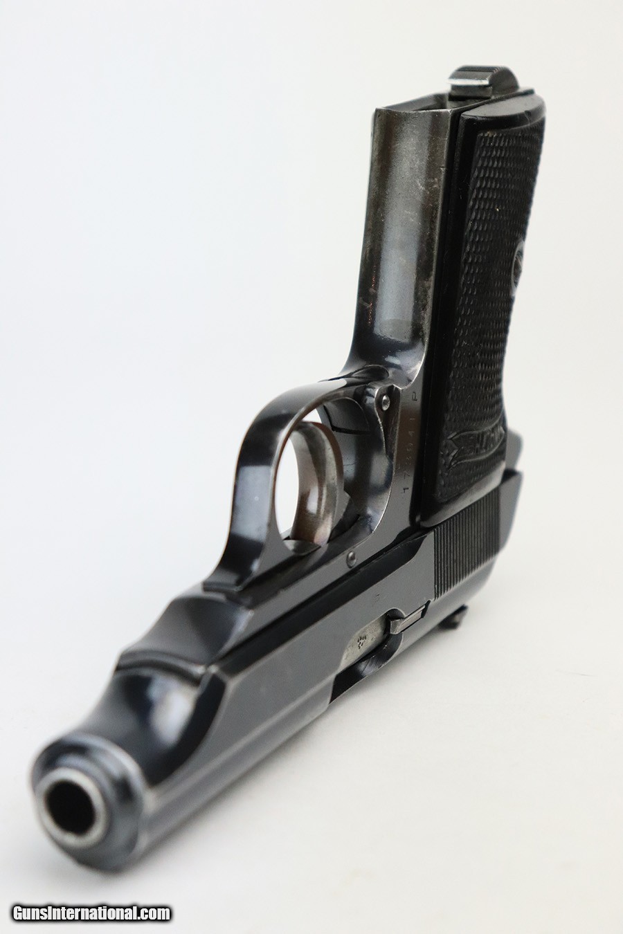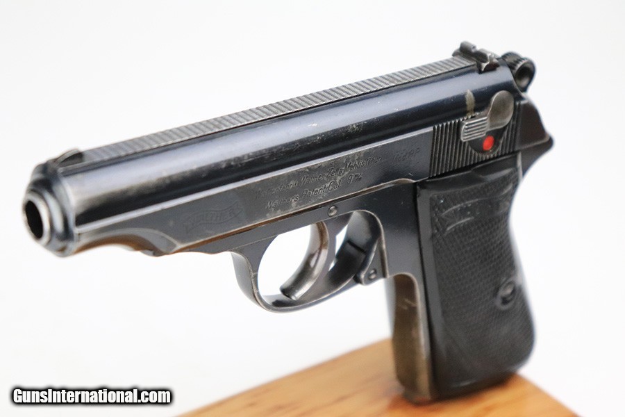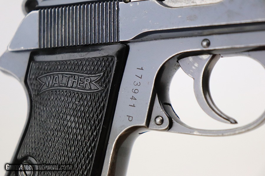 Description: This is a nice example of a rare 9mm Walther PP sold in the commercial market in 1939-40. It is all matching and has the proper "Crown N" commercial proofs. Overall, it has retained roughly 80% of its original finish. The finish loss is most noticeable on the left side of the slide and on the grip straps, but there are areas of spotty/scratchy wear and discoloration throughout. Mostly concentrated around the high edges. Comes with nice black plastic grips (a little worn on the left side) and a period-correct 9mm magazine. The bore is shiny with strong rifling. SOLD Curio/Relic: Yes Handgun Caliber: .380 ACP (9x17mm Browning Short) |