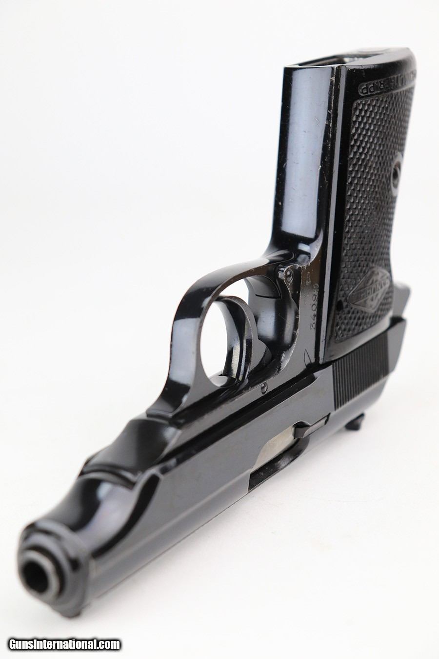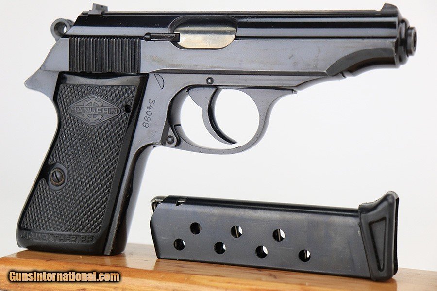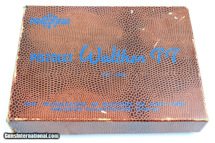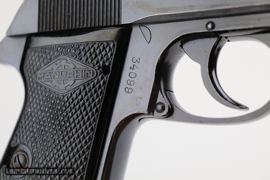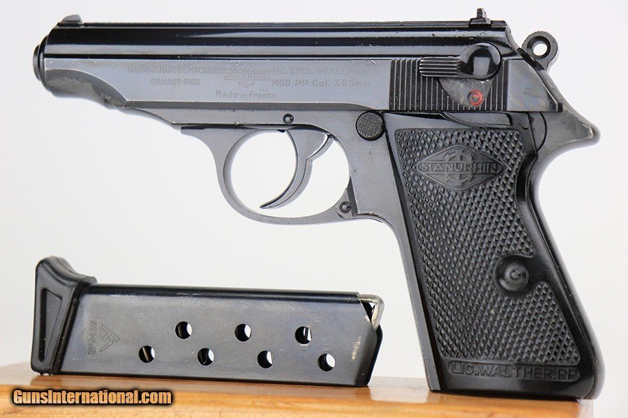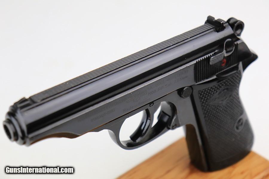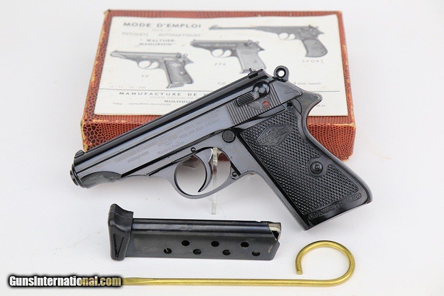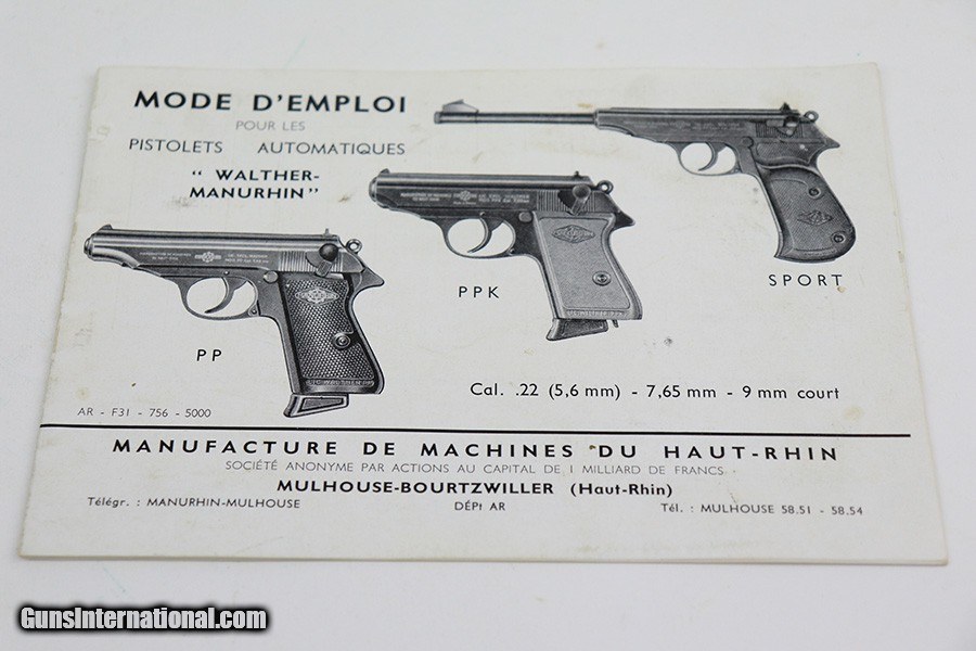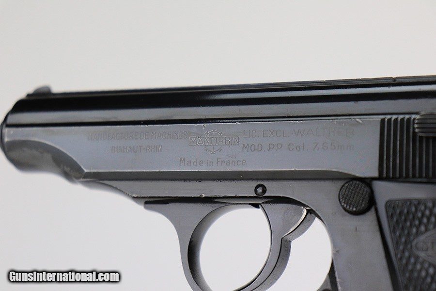 Description: This is an excellent example of a Manurhin Walther PP made in France in the 1950's. The gun is all matching and has the proper French proofs. It comes in a period-correct box, but the label is missing and is therefore un-numbered. It also comes with a proper owners manual, cleaning rod, and one reproduction black finger extension magazine. The gun has retained about 98% of its finish. While there isn't much actual finish loss, there are noticeable dings and handling marks throughout, most obvious on the grip straps and both sides of the frame. Comes with very nice Manurhin black plastic grips. Minty bore. SOLD Curio/Relic: Yes Handgun Caliber: .32 ACP (7.65x17mm Browning SR) Bore: 9.5/10 Condition: ~98% |