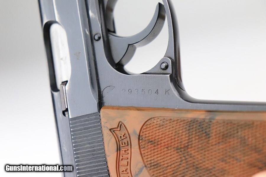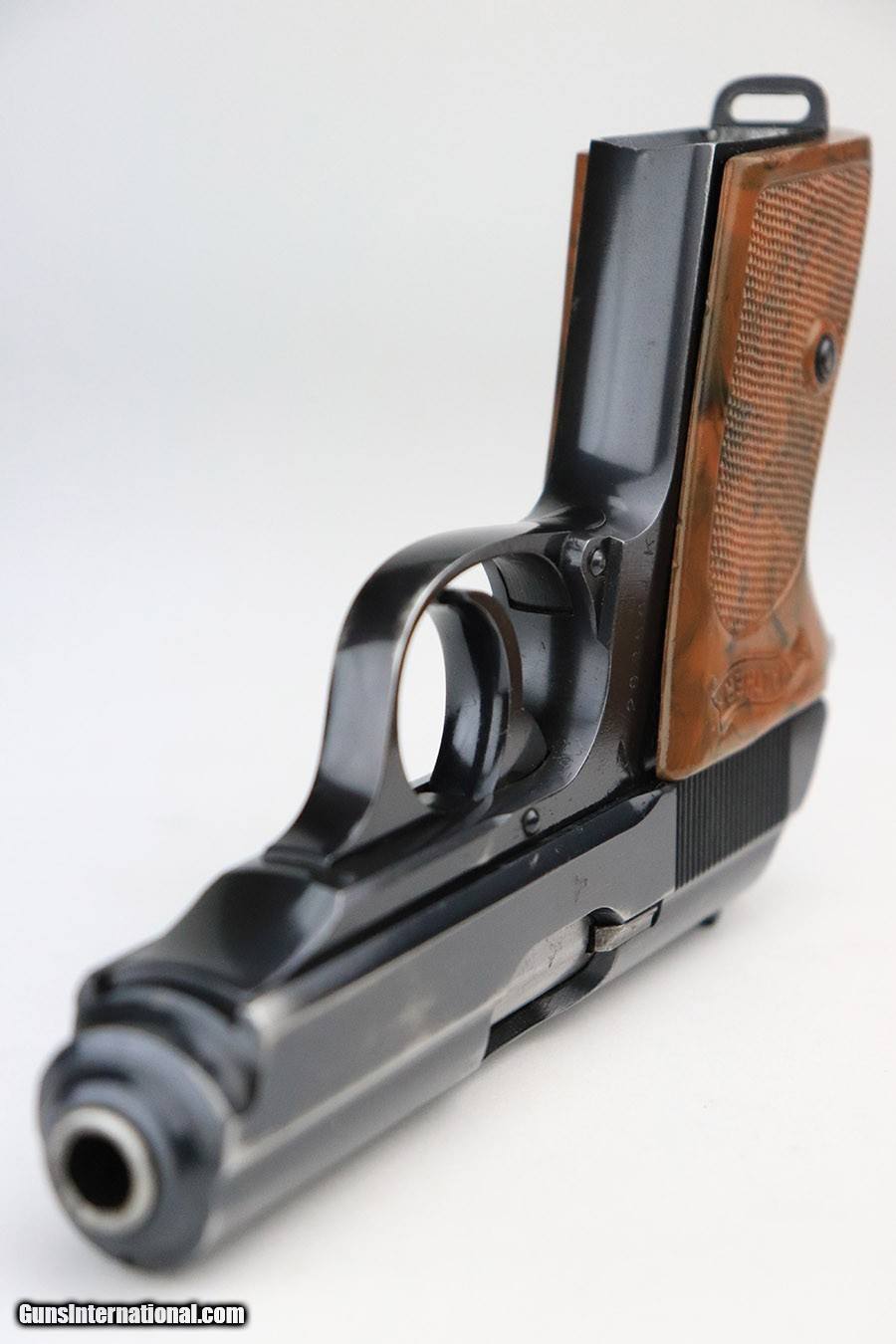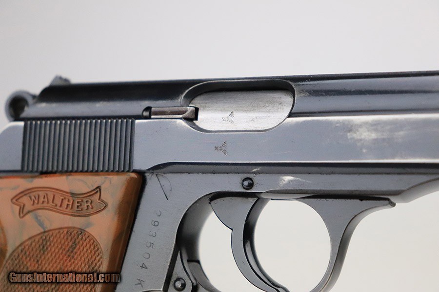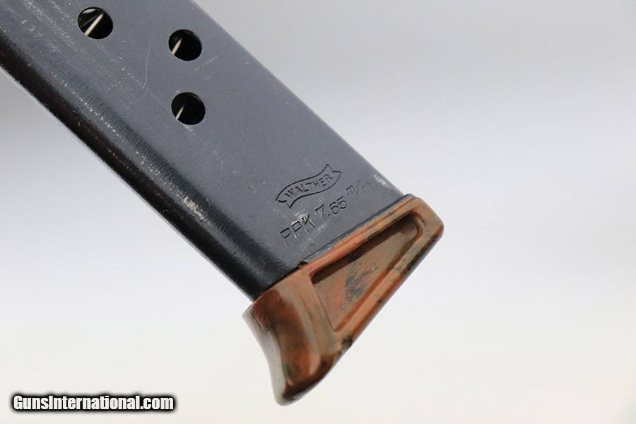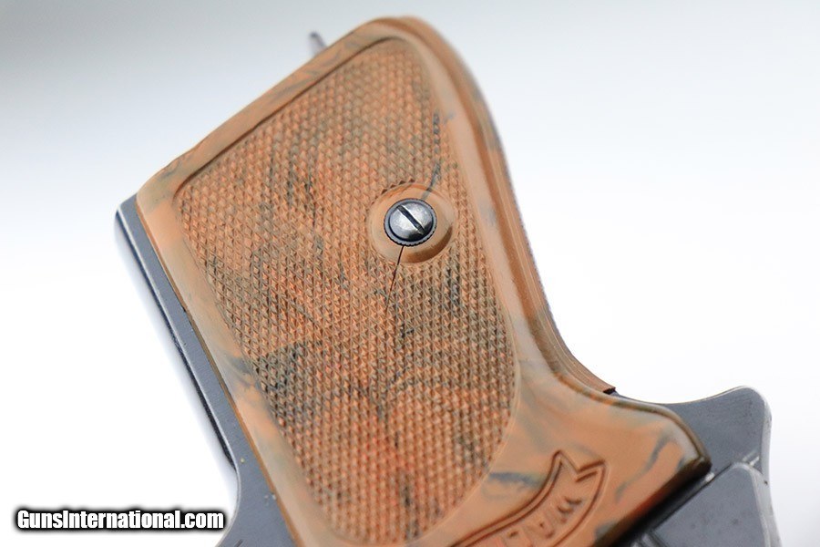 Description: 11/16/22 - This is a very nice example of a Walther PPK sold in the commercial market in 1940. It is all matching and has the proper "Eagle N" commercial proofs. It has retained about 93% of its original high polish finish. There is light spotty wear along both sides of the slide, concentrated mostly around the high edges. There is an area of minor discoloration around the left side of the muzzle. Comes with an excellent brown Walther grip (hairline crack around the right screw) and one wartime finger extension magazine. The bore has good rifling with minor frosting throughout. SOLD Curio/Relic: Yes Handgun Caliber: .32 ACP (7.65x17mm Browning SR) |