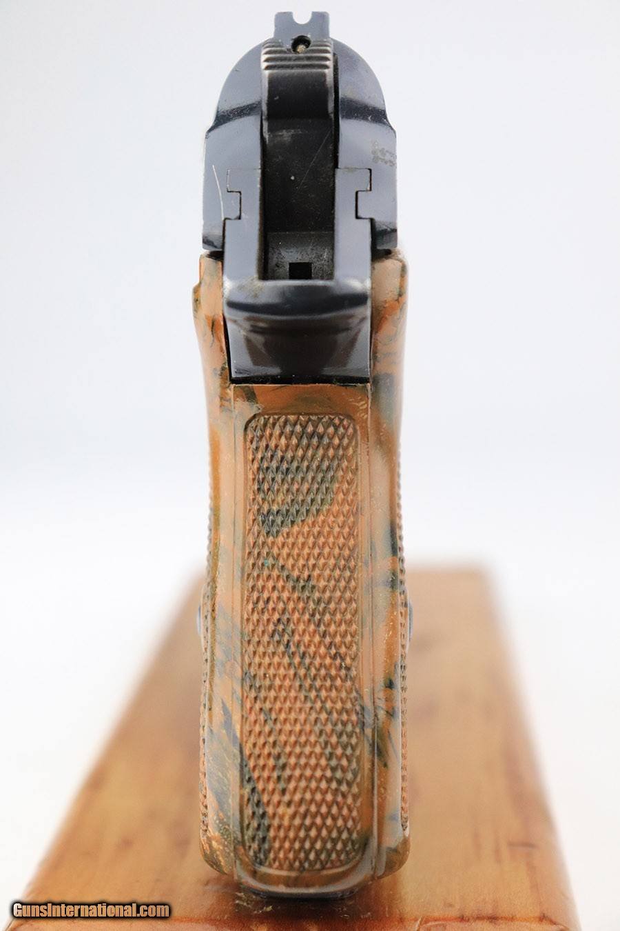 Description: This is a very nice example of a Walther PPK sold in the commercial market in 1935. It is all matching and has the proper commercial "Crown N" proofs. It has retained about 95% of its original finish. While there is not much actual finish loss, there are areas of splotchy discoloration on both sides of the slide (mostly on the right side) and on the right side of the frame. There are also areas of pitting around the muzzle and on the right side of the gun. A few tiny pits on the front strap. Comes with an excellent brown Walther grip and a wartime magazine. The bore is shiny with very strong rifling and some very minor freckling here and there. SOLD Curio/Relic: Yes Handgun Caliber: .32 ACP (7.65x17mm Browning SR) |