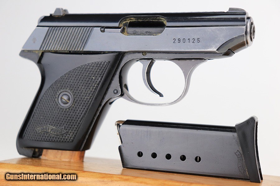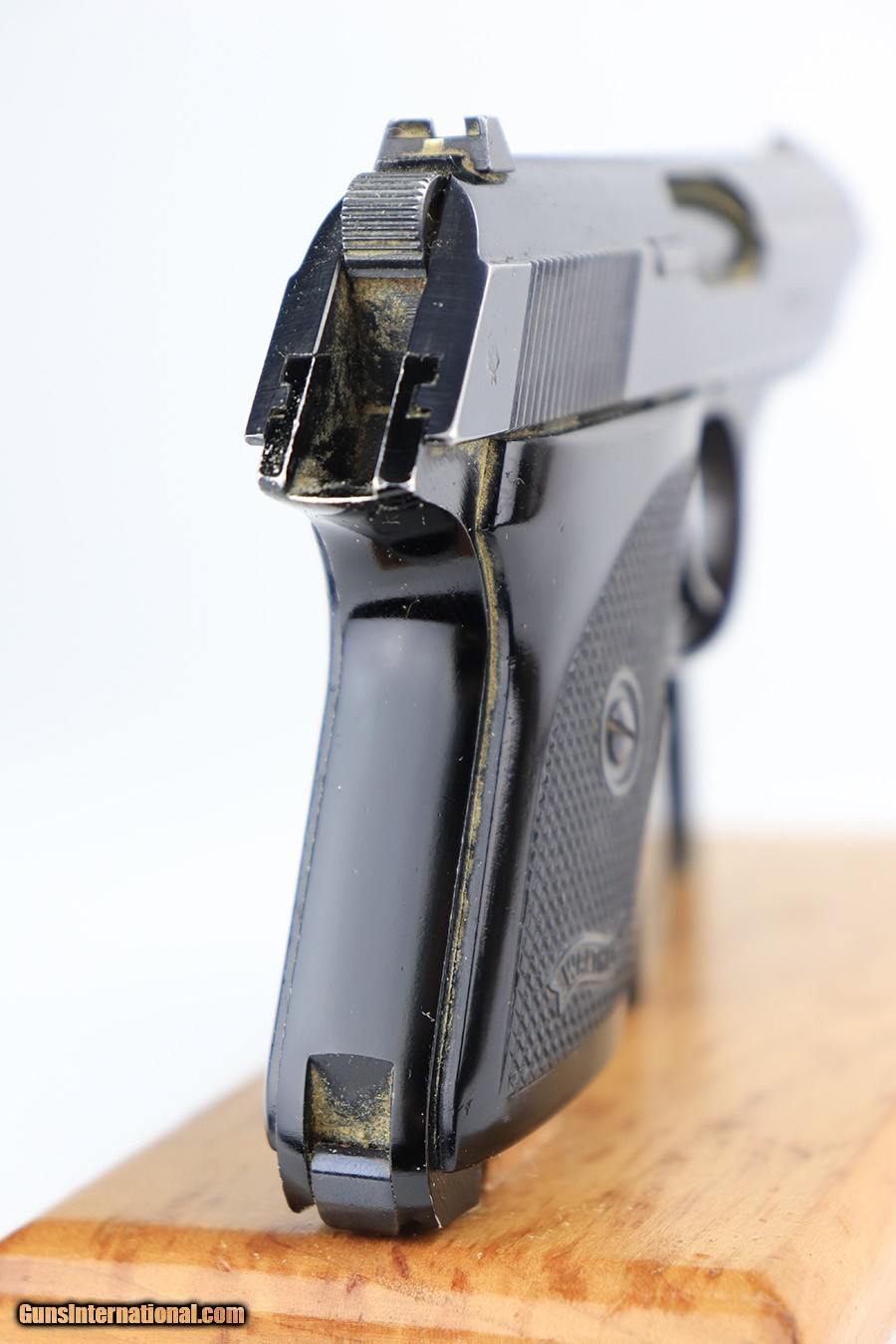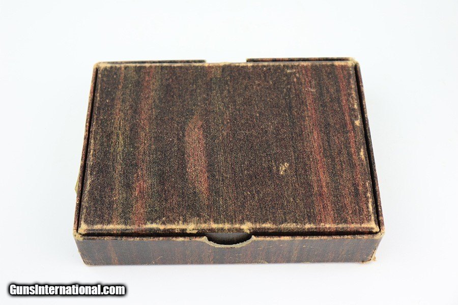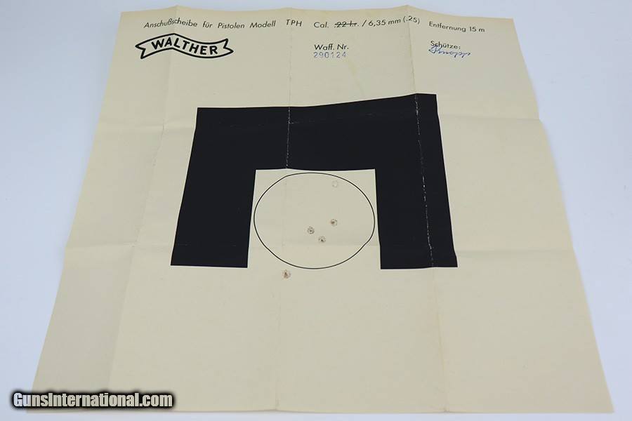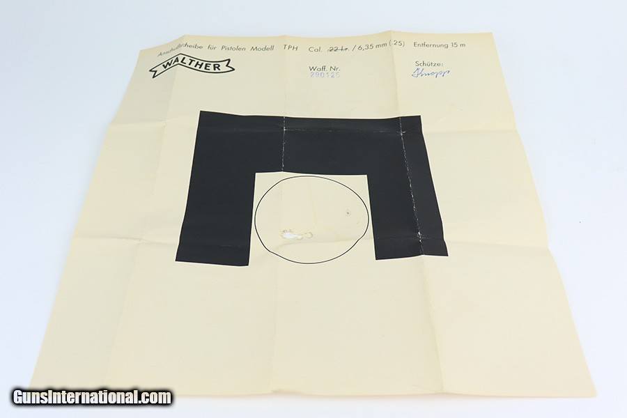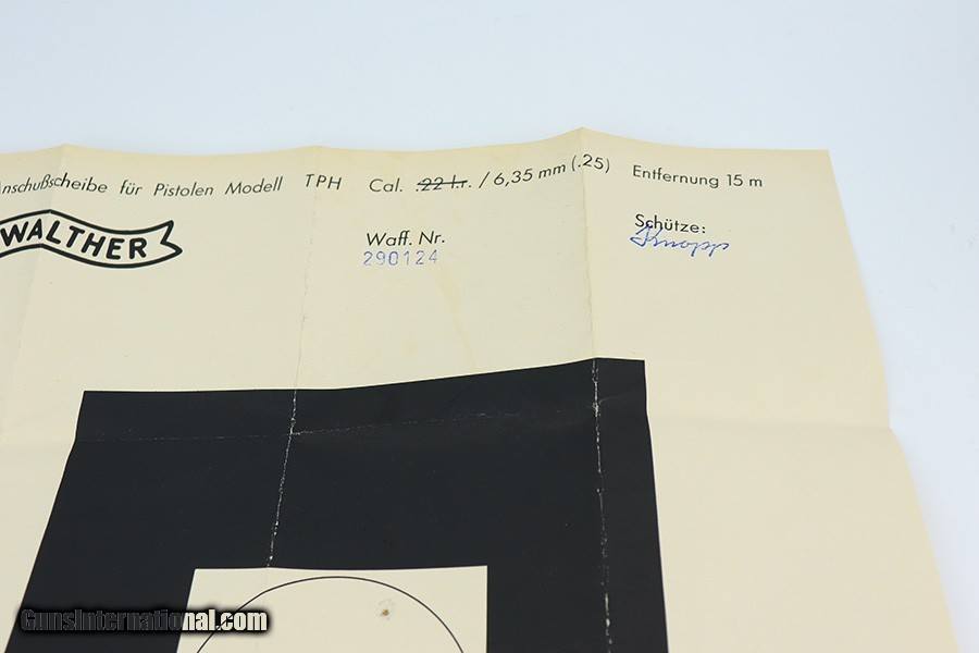 Description: This is a set of two consecutively-numbered Walther TPH pistols manufactured in 1984. Both guns are all matching and have the proper West German proofs. Each gun comes in its original matching box and comes with the matching-numbered test target, owners manual, cleaning rod, and one finger extension magazine. Starting with the gun ending in 124 - This gun is in mint condition with no signs of wear, just one tiny imperfection on the right side of the grip. The pistol ending in 125 saw more use. It has retained about 96% of its original finish with light wear on the front half of the slide. Minor wear on the underside of the trigger guard. The bores are mint and near-mint, respectively. SOLD Handgun Caliber: .25 ACP (6.35mm Browning, 6.35×16mmSR) Manufacturer: Walther Bore: Mint / 9.5/10 Condition: Mint / 96% |