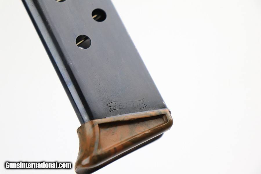 Description: This is a very nice example of a Walther PPK that was issued to the Third Reich Postal Service in 1937. The gun is matching, has the proper "DRP" Deutches Reichs Post marking on the left side of the frame, and also has the proper "Crown N" firing proofs. It has retained roughly 75% of its original high polish finish. There are areas of significant wear on both sides of the slide, as well as some small spots with tiny pitting here and there. Comes with an excellent brown grip and a period-correct finger extension magazine. The bore has good rifling with minor freckling throughout. SOLD Curio/Relic: Yes Handgun Caliber: .32 ACP (7.65x17mm Browning SR) |