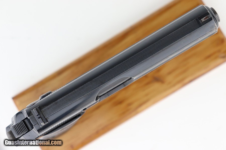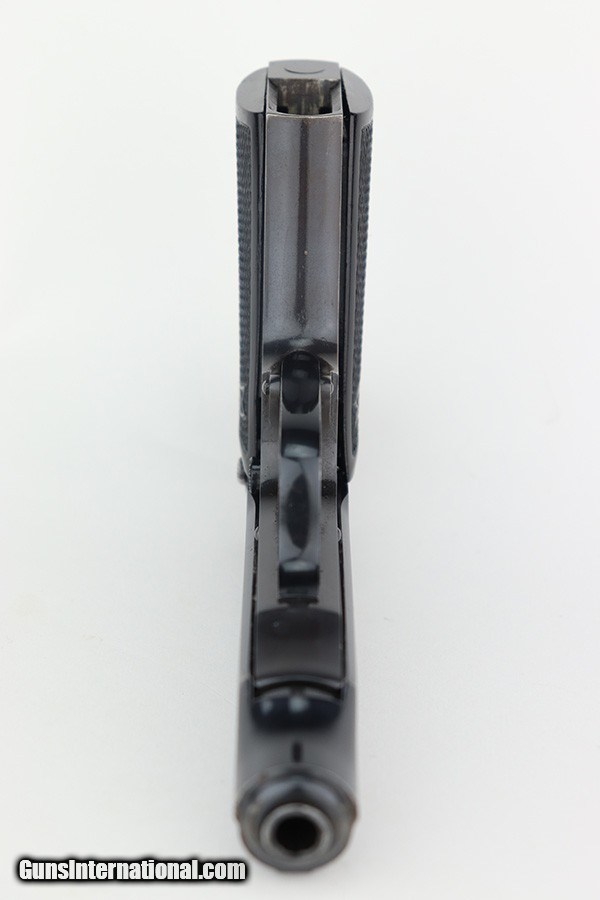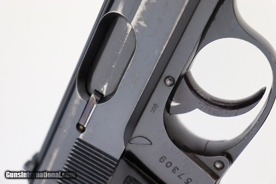 Description: This is a very nice example of an early Walther PP sold in the commercial market in 1930. It is all matching, "Crown N" proofed, and has the proper early features, such as 90 degree safety, extended barrel, and "upside-down" serial number on the frame. It has retained about 90-91% of its original high polish finish with wear around the muzzle and light, somewhat spotty wear along both sides of the slide, concentrated mostly around the high edges. Some minor dulling in the finish, light brown patina, and light pin-pricking on both grip straps. Fitted with an excellent pair of period-correct weighted grips. Comes with a proper Walther banner-only magazine. Excellent, shiny bore with strong rifling. SOLD Curio/Relic: Yes Handgun Caliber: .32 ACP (7.65x17mm Browning SR) |