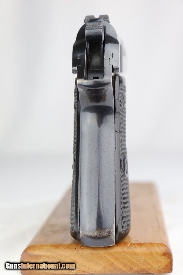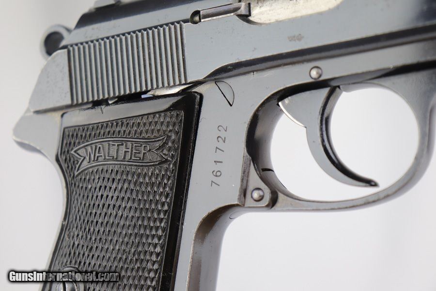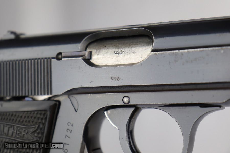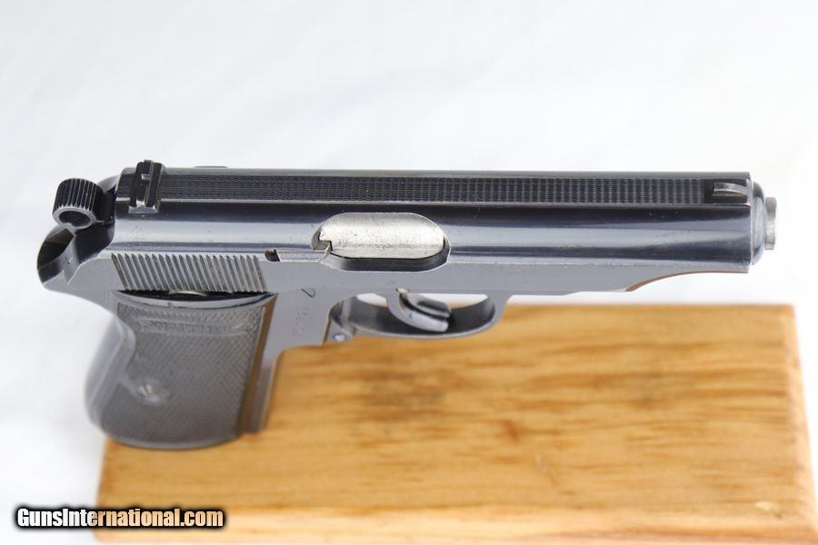 Description: This is an original pre WW2 commercial Walther PP pistol. The serial number puts the date of production around 1933. The pistol has early features like a 90 degree safety and high polish finish. The grips, however are a later wartime variation (non weighted). The overall finish is about 94-96% with edge wear and speckling on the slide. There's also some muzzle wear and light strap wear, but the straps are excellent overall. The bore rates about 8.5/10 with strong rifling and trace amounts of patina. Original and fully functional. SOLD Curio/Relic: Yes Manufacturer: Walther Model: PP Serial Number: 761722 Caliber Info: 7.65mm Bore: 8.5/10 Condition: 94-96% Manufacture Date: 1933 |