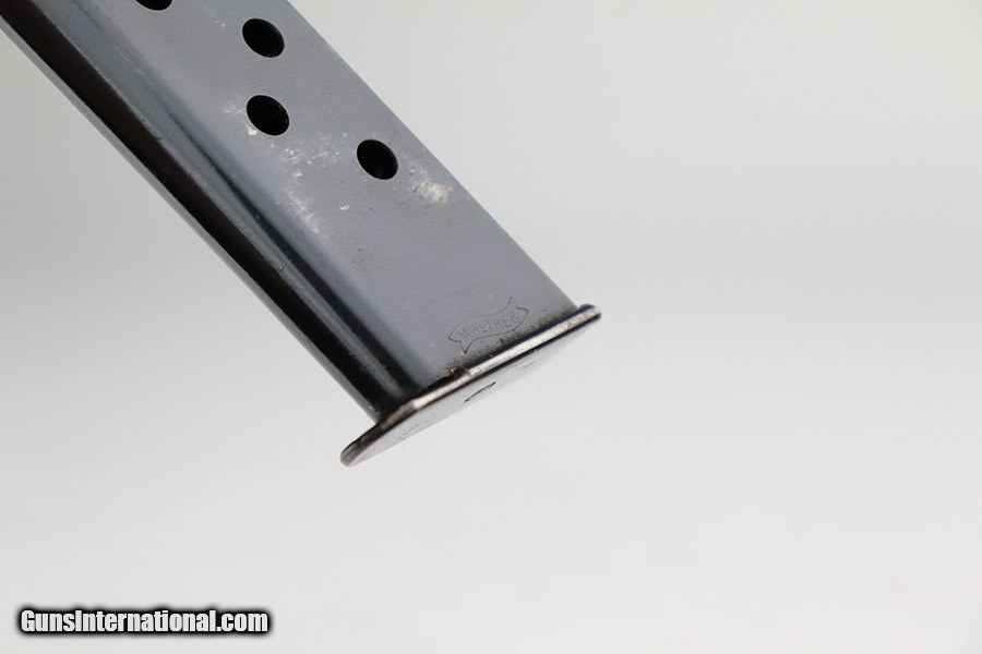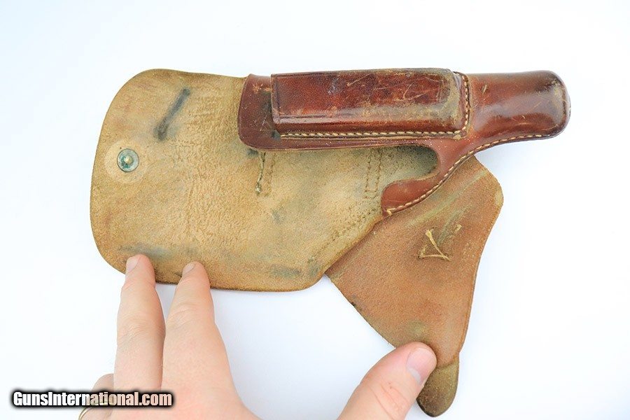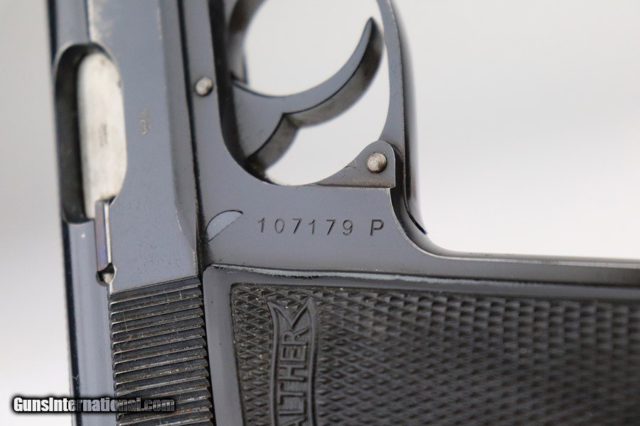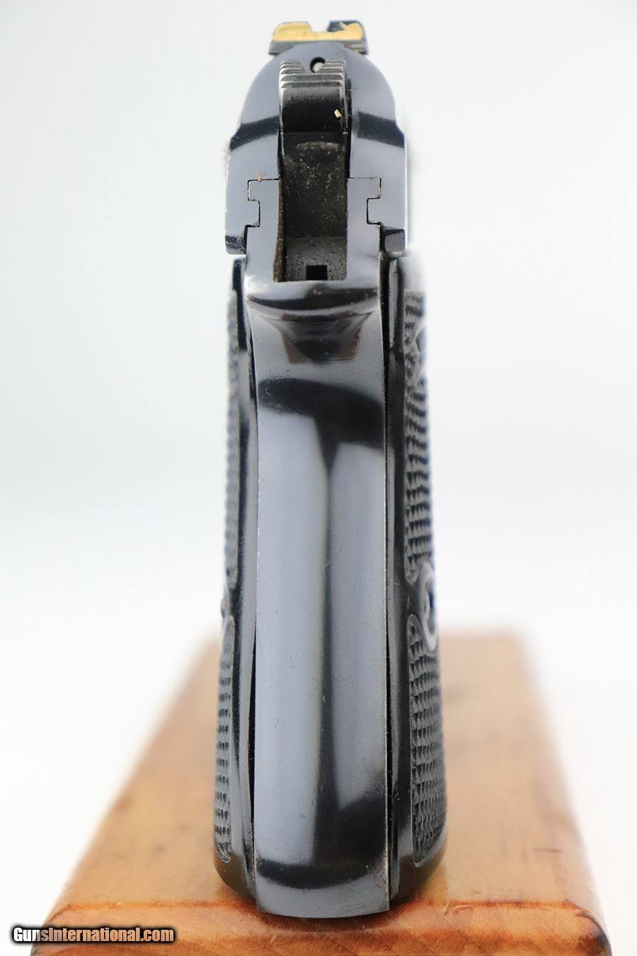 Description: This is an excellent example of a Walther PP sold in the commercial market in 1938. It is all matching and has the proper "Crown N" commercial proofs. It comes as a rig with a nice tan leather Akah holster, a finger extension Walther banner magazine, and a spare flat bottom Walther banner magazine. The gun itself has retained about 95% of its original high polish finish with wear around the muzzle and along the high edges of the slide. One area of light wear on the right side of the slide. While there isn't a ton of actual finish loss, there are tiny dots of discoloration along the left side of the slide. Comes with nice period-correct black bakelite grips - there is a crack along the edge of the left grip panel. Minty bore. The front and rear sights have old white paint on them. SOLD Curio/Relic: Yes Handgun Caliber: .32 ACP (7.65x17mm Browning SR) |