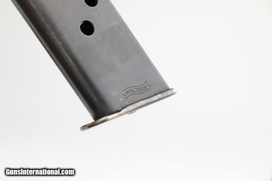 Description: 11/2/22 - This is an excellent example of a Walther PPK sold in the commercial market in 1940. The gun is all matching and has the proper "Eagle N" commercial proofs. It has retained about 96% of its original finish with minor muzzle wear and very minor wear on the high edges of the slide. Also some very minor thinning on the front strap. Comes with a very nice Brown Walther grip (tiny crack in the spine) and a Walther banner-only magazine. The bore has strong rifling, but there is some very minor freckling throughout. SOLD Curio/Relic: Yes Handgun Caliber: .32 ACP (7.65x17mm Browning SR) |