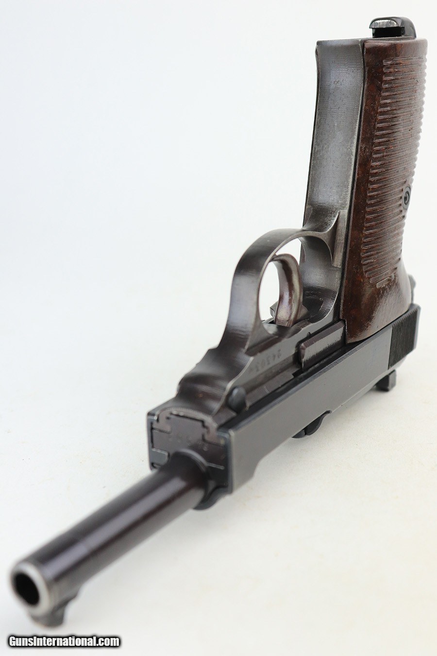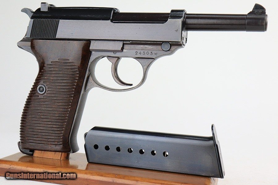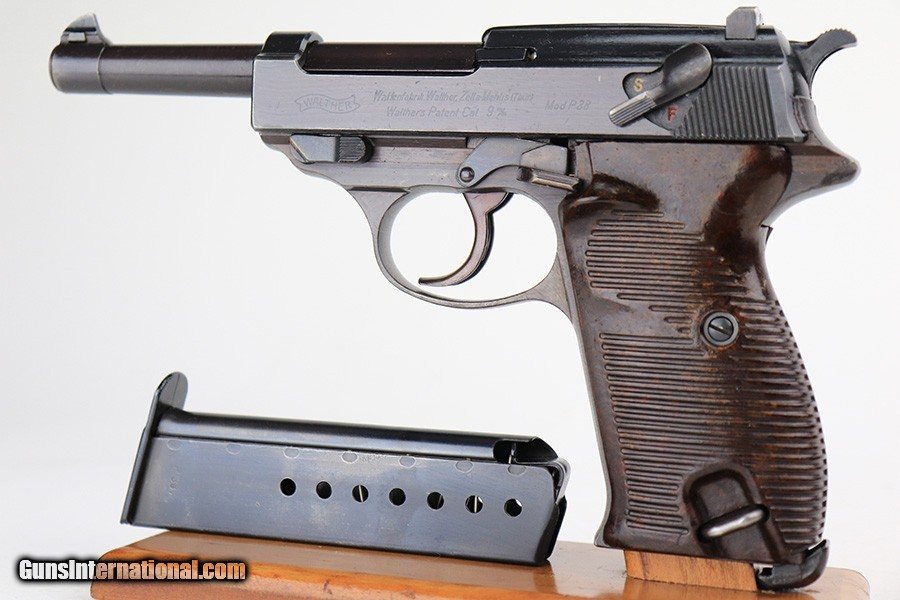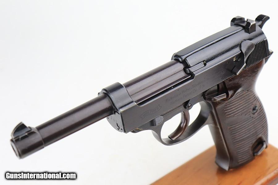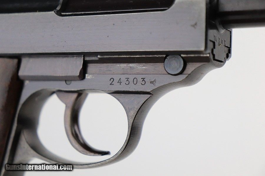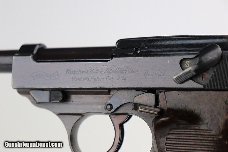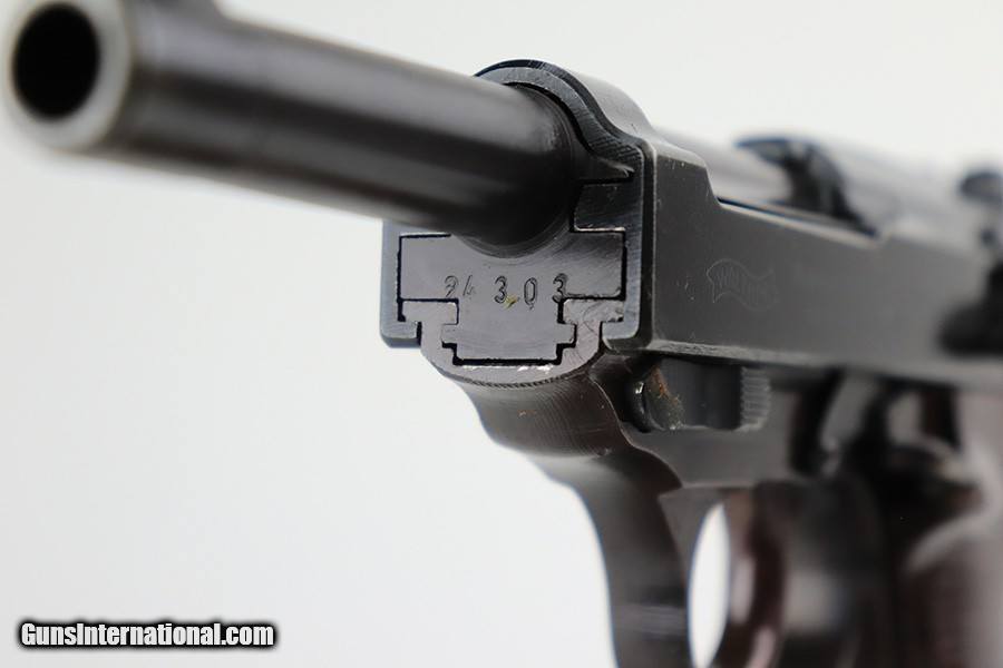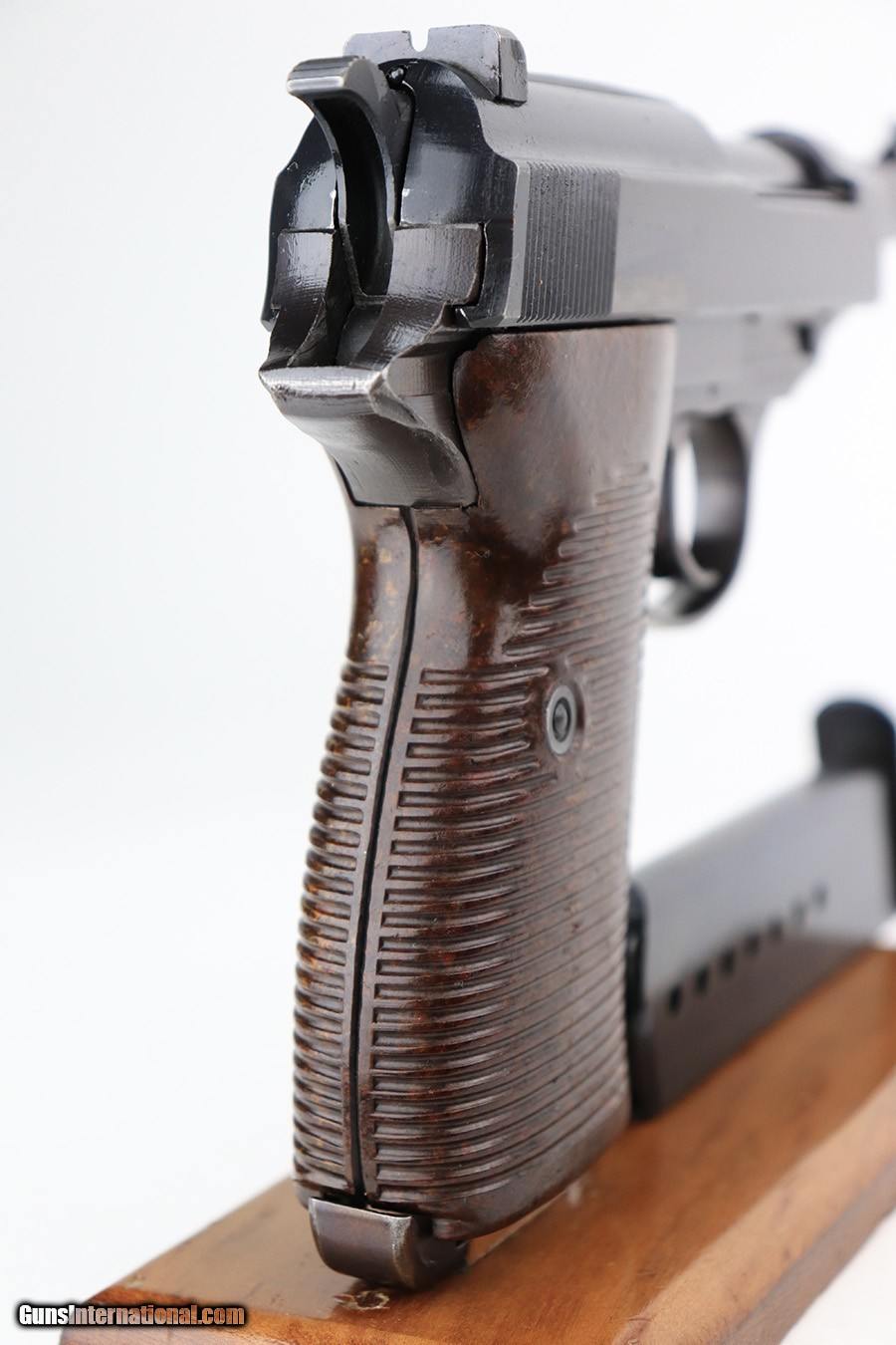 Description: This is an excellent example of a rare Walther Mod P.38 sold in the commercial market during WW2. This one is all matching and has the proper "Eagle N" proofs. This gun is rare as only 1,800 were produced. It has retained about 96-97% of its plumb-colored finish. There is thinning and spotty oxidation on the front strap. Minor muzzle wear and wear at the front edges of the slide. Comes with excellent reddish period-correct bakelite grips and a "P.38v" marked magazine. The bore is excellent - shiny with strong rifling. De-cocker is functional. SOLD Curio/Relic: Yes Handgun Caliber: 9x19mm Parabellum (9mm Luger, 9x19mm NATO) Bore: 9/10 Condition: ~96-97% |