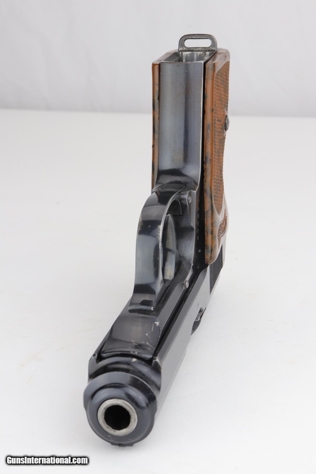 Description: This is a terrific example of an early commercial Walther PPK from the early 1930s. The original high-polish blue rates at 97-98% with minor muzzle wear on either side of the slide, and some patina on the front strap. There are also a few scratches on the underside of the frame, toward the forward end. Early 90 degree safety. Nice, original grip though it does have the common stress crack in the spine. Excellent finger extension magazine. Minty bore. SOLD Curio/Relic: Yes Manufacturer: Walther Model: PPK Serial Number: 800977 Caliber Info: 7.65mm Bore: 9.5/10 Condition: 97-98% Manufacture Date: 1933-1934 |