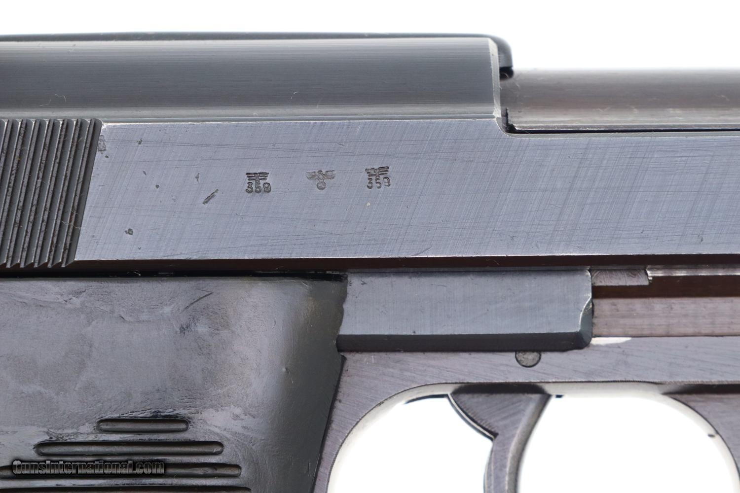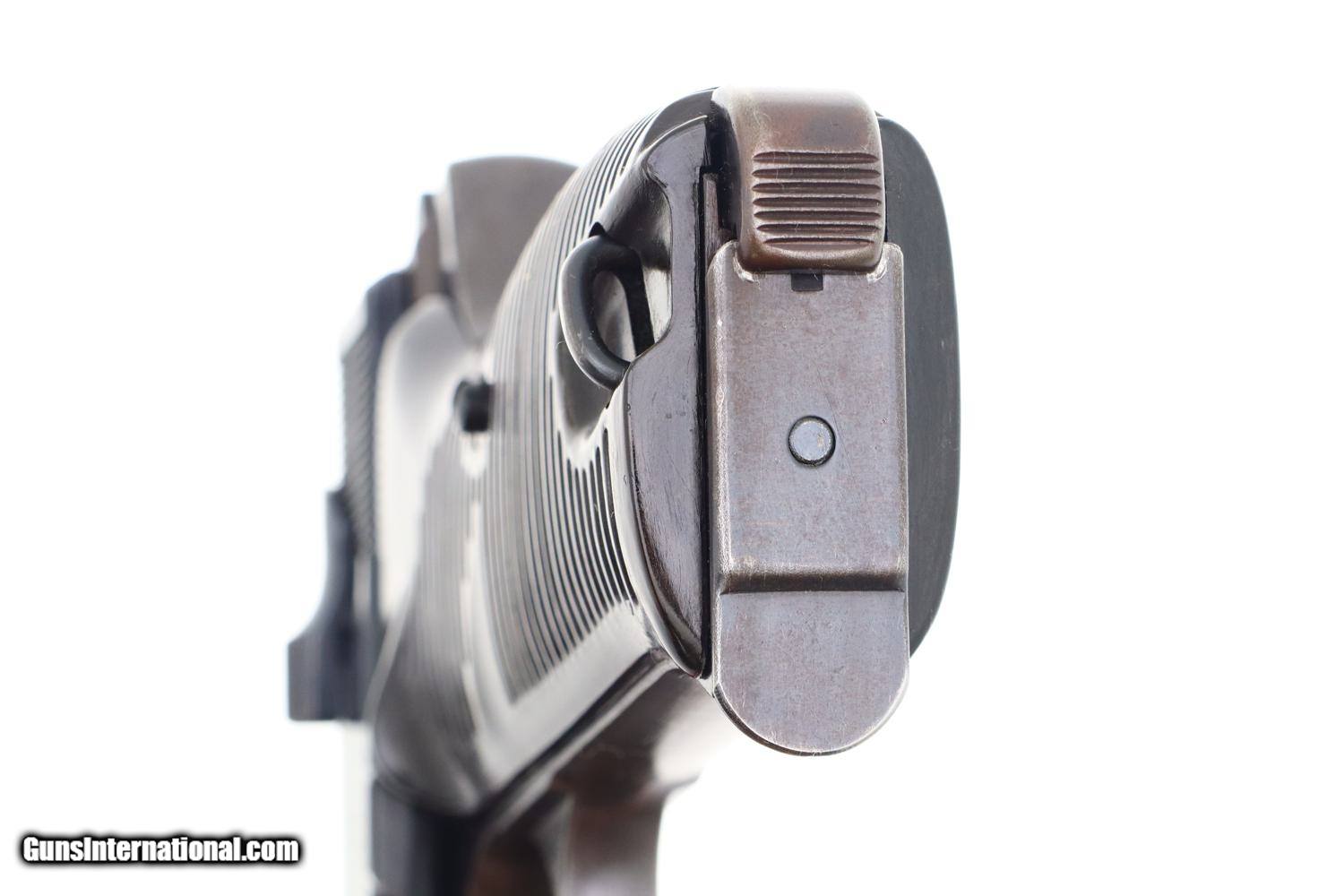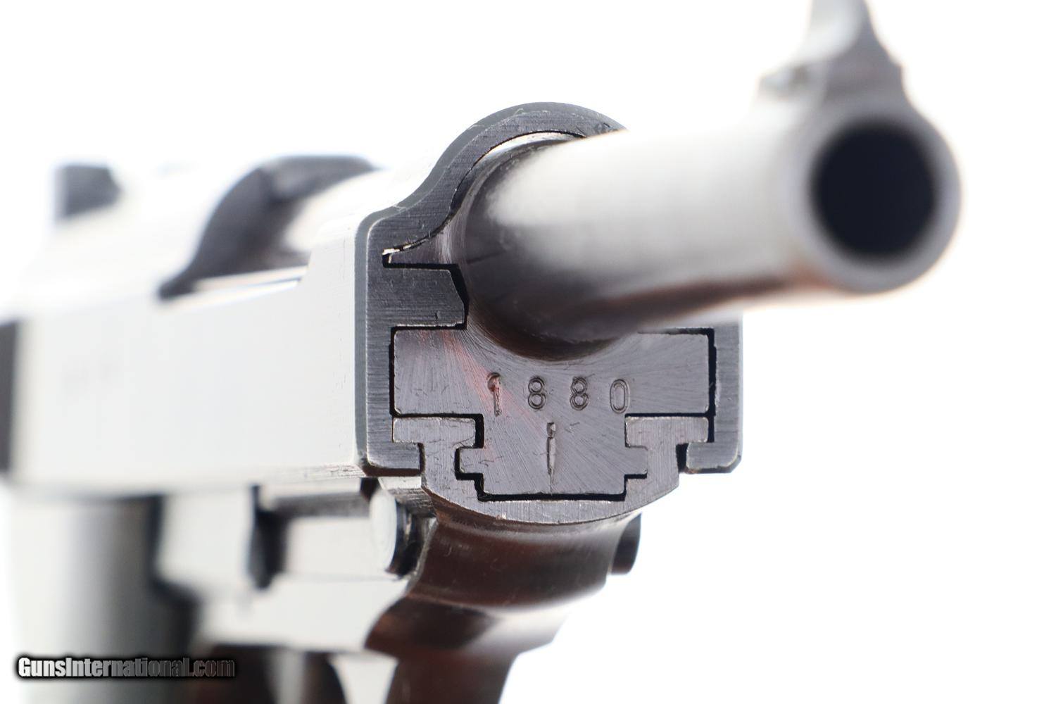 Description: Synopsis: High Original Condition Walther P38, ac 42, German Military Pistol, 1880j, FB01242 Description: Especially nice Walther P38, made in late 1942, all matching, with correct Walther accepted magazine. SN: 1880j. Cal: 9mmP. Standard configuration P38 with 5” barrel, drift adjustable front sight and fixed rear sight. Stacked address on the left side of slide that includes “ac” manufacturers code, the date “42” and the serial number. Safety positions marked with a white highlighted “S” and a red highlighted “F”. The right side of slide with the usual three acceptances. The full serial number is repeated on the left side of the frame, left side of slide under the plum tone barrel and on the locking block. Fitted with the correct dark brown grips and “P.38” Walther accepted Eagle/359 magazine. Condition: Excellent, bright original salt blue with minimal sharp edge and holster wear that one would expect from very light use. Comparable blue on the front strap. Crisp original grips. Same condition applies to the magazine. Mirror bore with strong rifling. Perfect manual mechanics. A truly excellent German WWII P38 pistol that would grace any collection. ~~Insured shipping fee of $55; most packages shipped using FedEx 2nd Day.~~ SOLD Manufacturer: Walther Serial Number: 1880j Caliber Info: 9mmP |