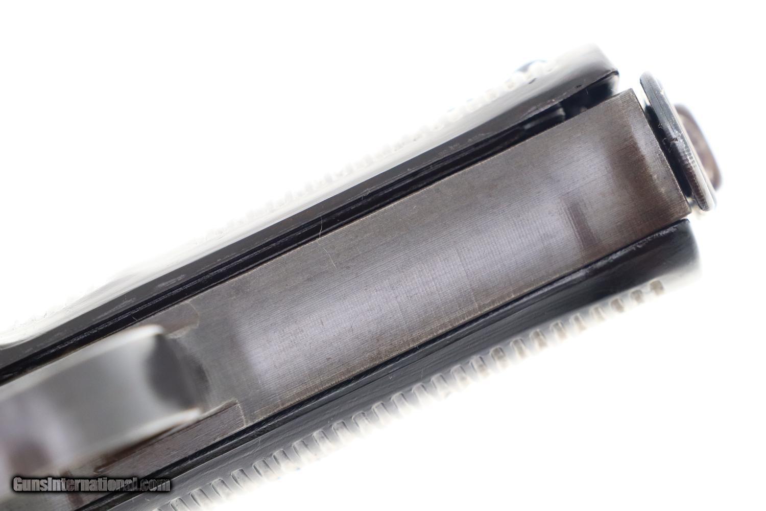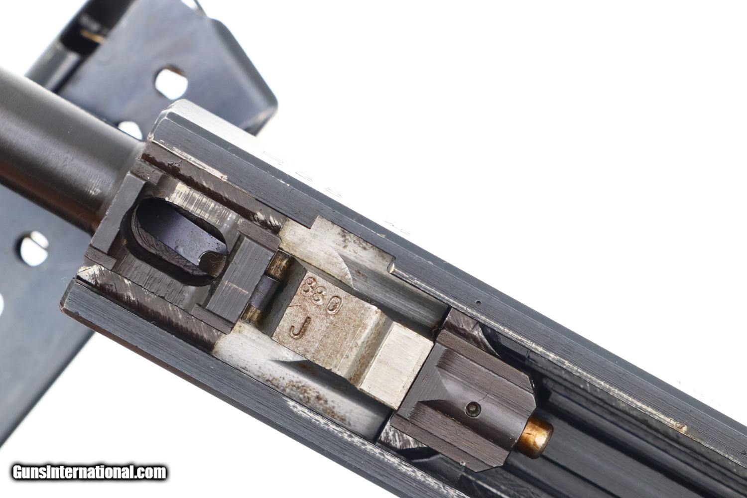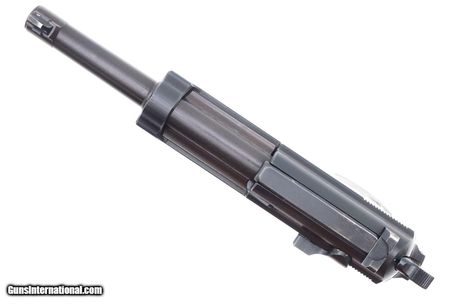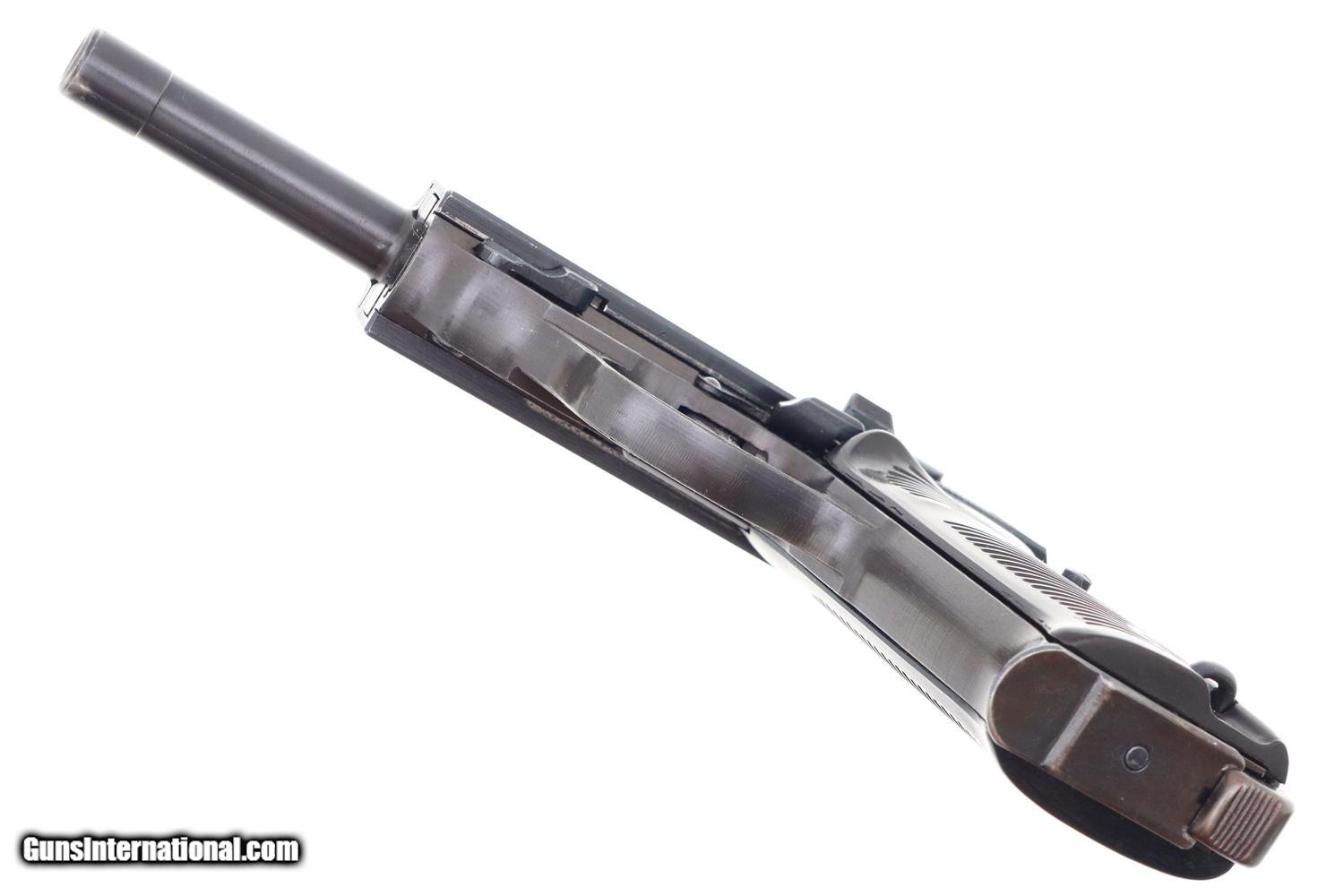 Description: Synopsis: High Original Condition Walther P38, ac 42, German Military Pistol, 1880j, FB01242 Description: Especially nice Walther P38, made in late 1942, all matching, with correct Walther accepted magazine. SN: 1880j. Cal: 9mmP. Standard configuration P38 with 5” barrel, drift adjustable front sight and fixed rear sight. Stacked address on the left side of slide that includes “ac” manufacturers code, the date “42” and the serial number. Safety positions marked with a white highlighted “S” and a red highlighted “F”. The right side of slide with the usual three acceptances. The full serial number is repeated on the left side of the frame, left side of slide under the plum tone barrel and on the locking block. Fitted with the correct dark brown grips and “P.38” Walther accepted Eagle/359 magazine. Condition: Excellent, bright original salt blue with minimal sharp edge and holster wear that one would expect from very light use. Comparable blue on the front strap. Crisp original grips. Same condition applies to the magazine. Mirror bore with strong rifling. Perfect manual mechanics. A truly excellent German WWII P38 pistol that would grace any collection. ~~Insured shipping fee of $55; most packages shipped using FedEx 2nd Day.~~ SOLD Manufacturer: Walther Serial Number: 1880j Caliber Info: 9mmP |