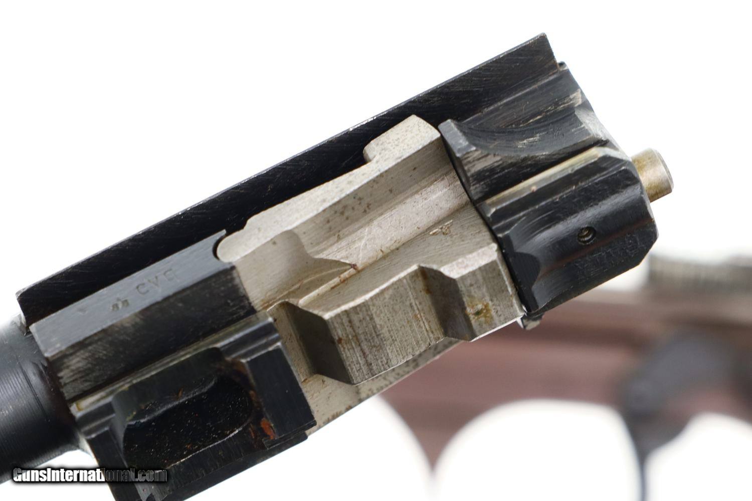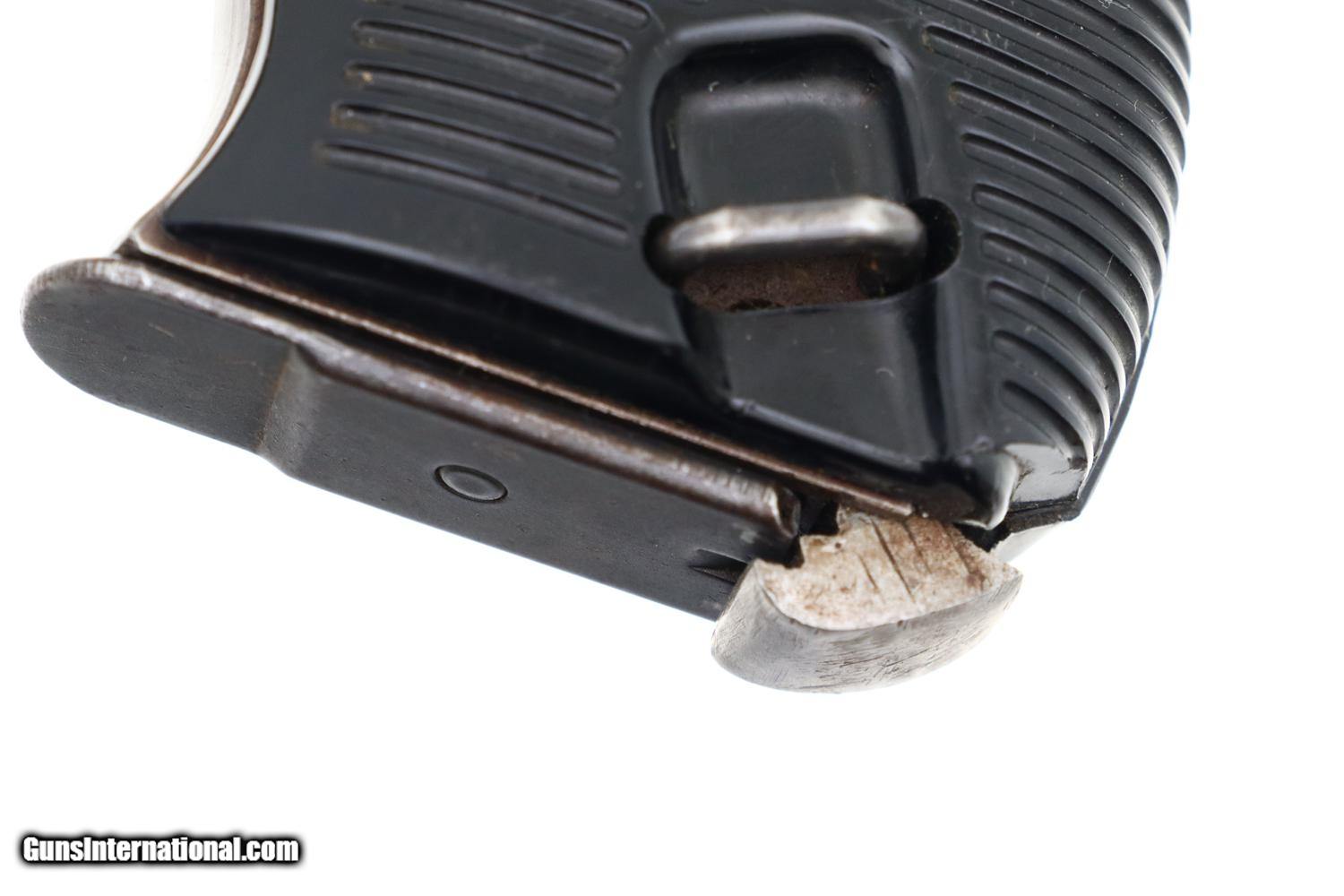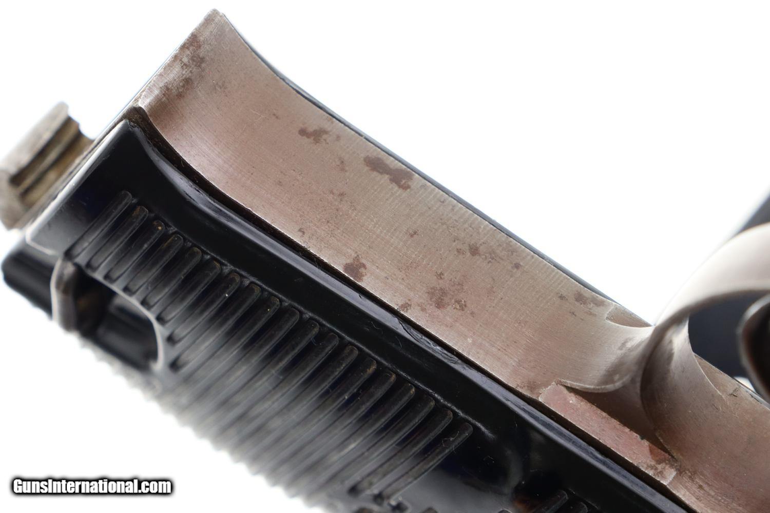 Description: Synopsis: Incredible Walther P38, Armorer Assembled, Parts Gun Description: This is an interesting late war/postwar P38 assembled with original finish parts from each of the manufacturers. The plum frame is Walther/AC marked and proofed; the slide comes from Mauser and dated “44”; while the barrel was made by Spreewerke marked “cyq”. None of the parts carries a serial number, the takedown lever is a homemade replacement as is the magazine catch that may have started as a solid forging but clearly hand finished. Fitted with original black plastic grips and a standard “P38” Mauser magazine, spine marked “E/WaA135” Condition: 97-98% bright original finish with some spotting on the frontstrap as imaged. Non-factory takedown pin and hand modified magazine retainer. Excellent grips. Near mirror bore. Perfect manual mechanics, though NOT SAFE TO FIRE as takedown lever not secure. ~~Insured shipping fee of $65; most packages shipped using FedEx 2nd Day.~~ SOLD Manufacturer: Walther Serial Number: NSN Caliber Info: 9mmP |