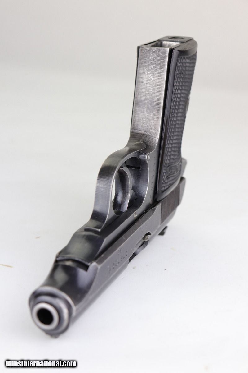 Description: This is a late-war, 4th variation Nazi police-issued "Eagle F" Walther PP, manufactured in 1945. Late military finish. The serial number on the right side of the slide is marked with an "AC" code. The gun has no slide legend. It is completely original. The gun has retained about 85% of its original finish. There is wear around the muzzle, some high edge wear, some minor surface scratches on the right side of the slide, but most of the wear is thinning on the straps. Comes with a period-correct Walther magazine. The grips are original. The left grip panel has starting to split (typical). The gun is fully functional. Bore is excellent - shiny with strong rifling. SOLD Curio/Relic: Yes Manufacturer: Walther Model: PP Serial Number: 376723p Caliber Info: 7.65mm Condition: ~85% Bore Condition: 9/10 Manufacture Date: 1945 |
