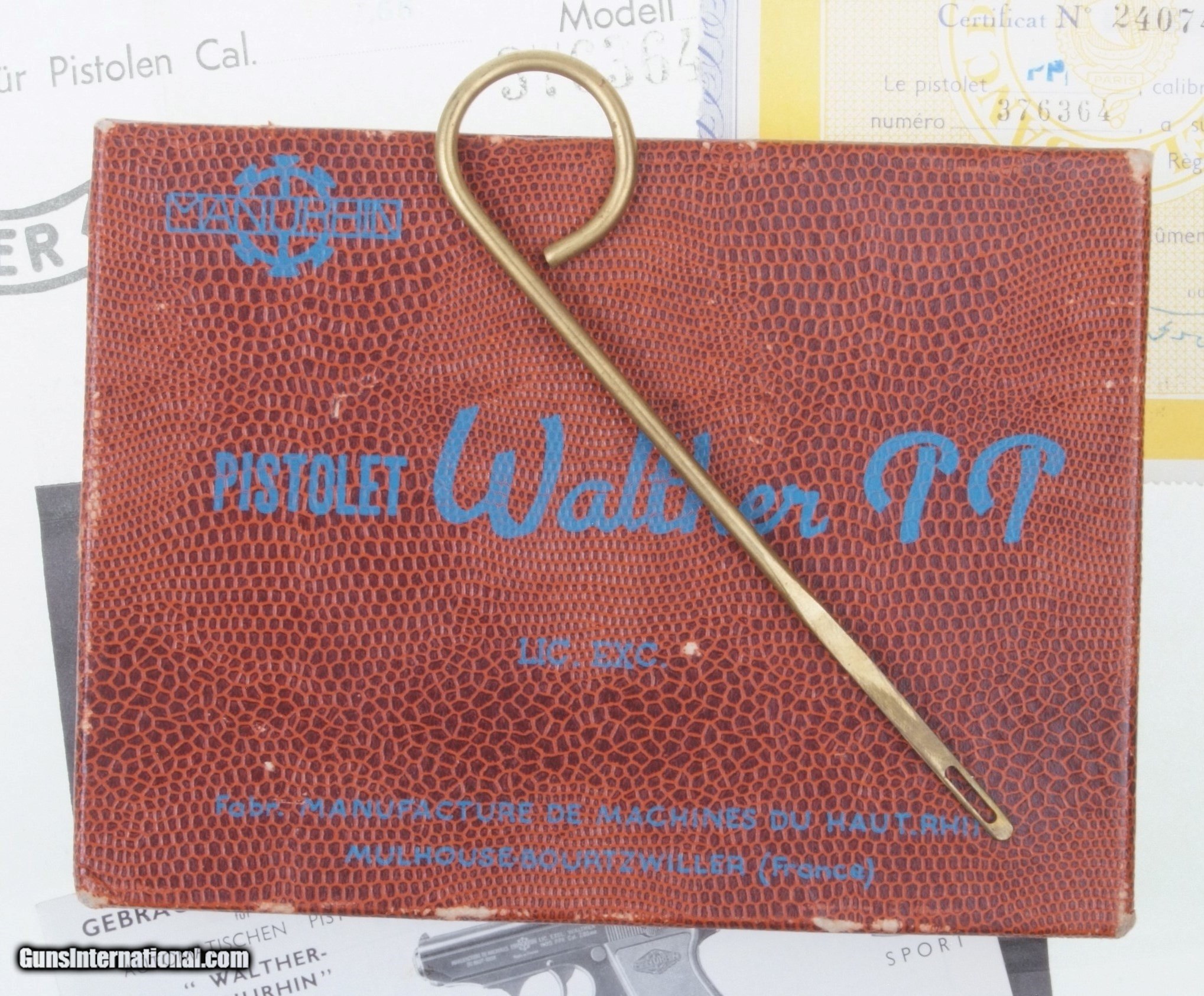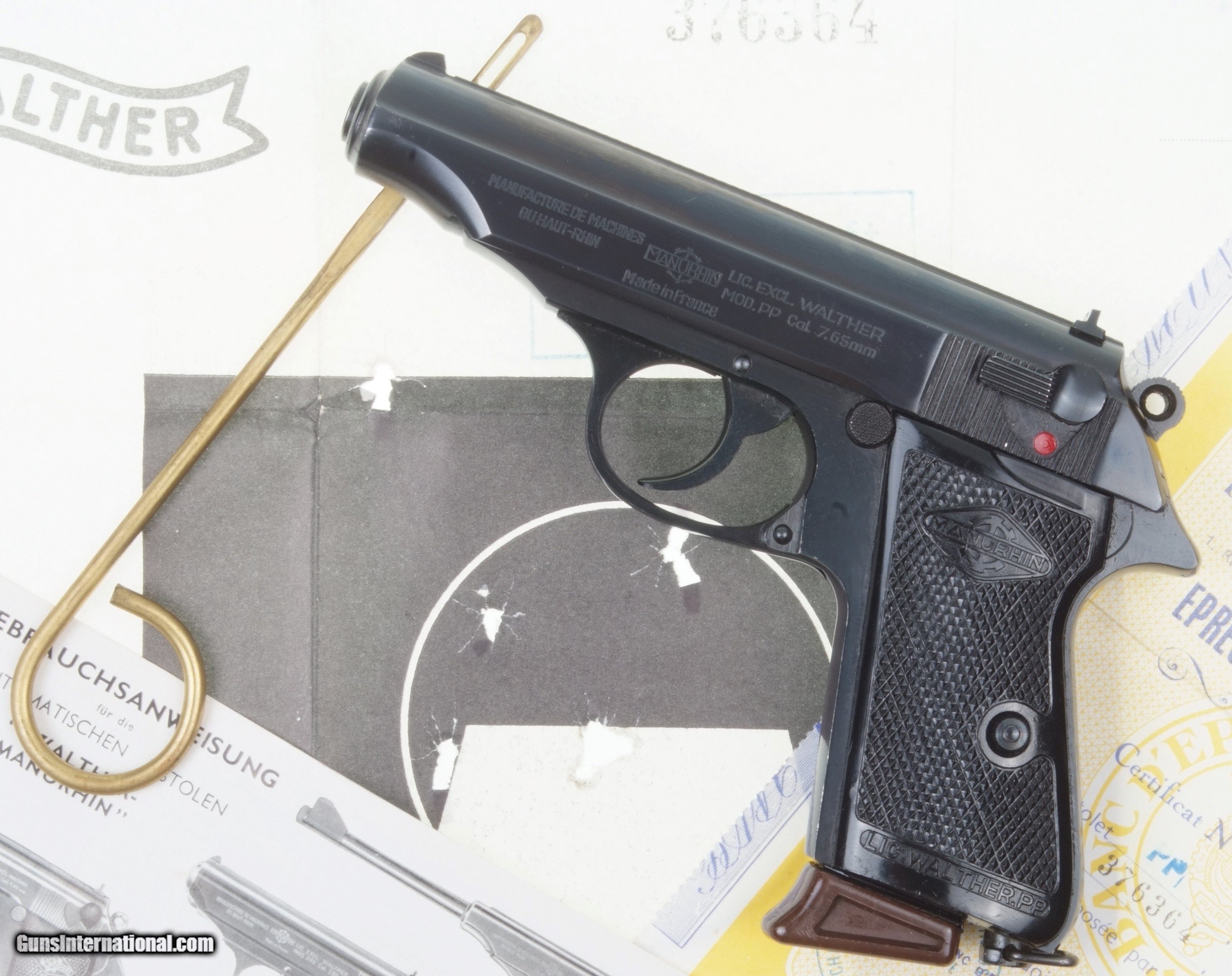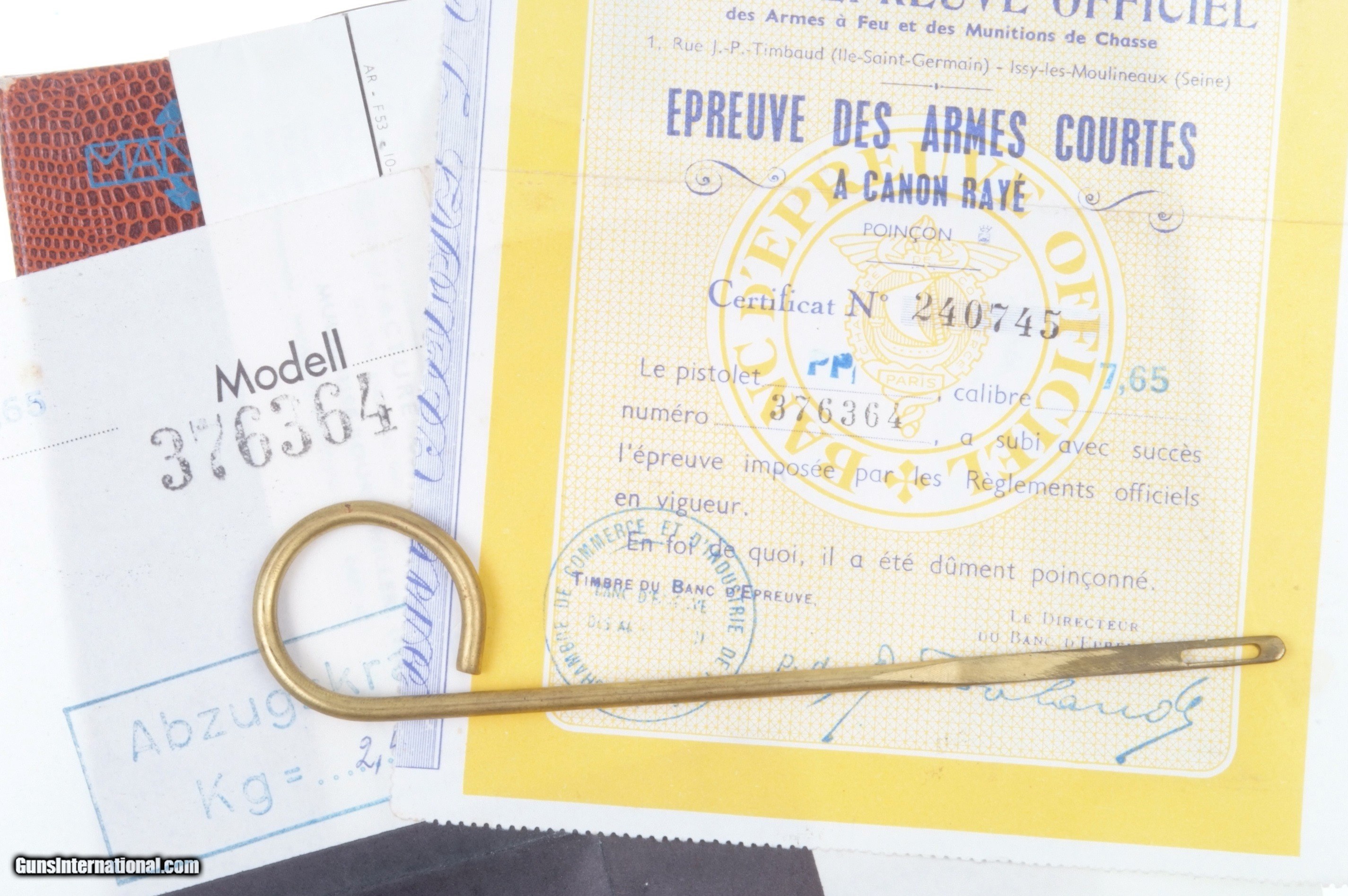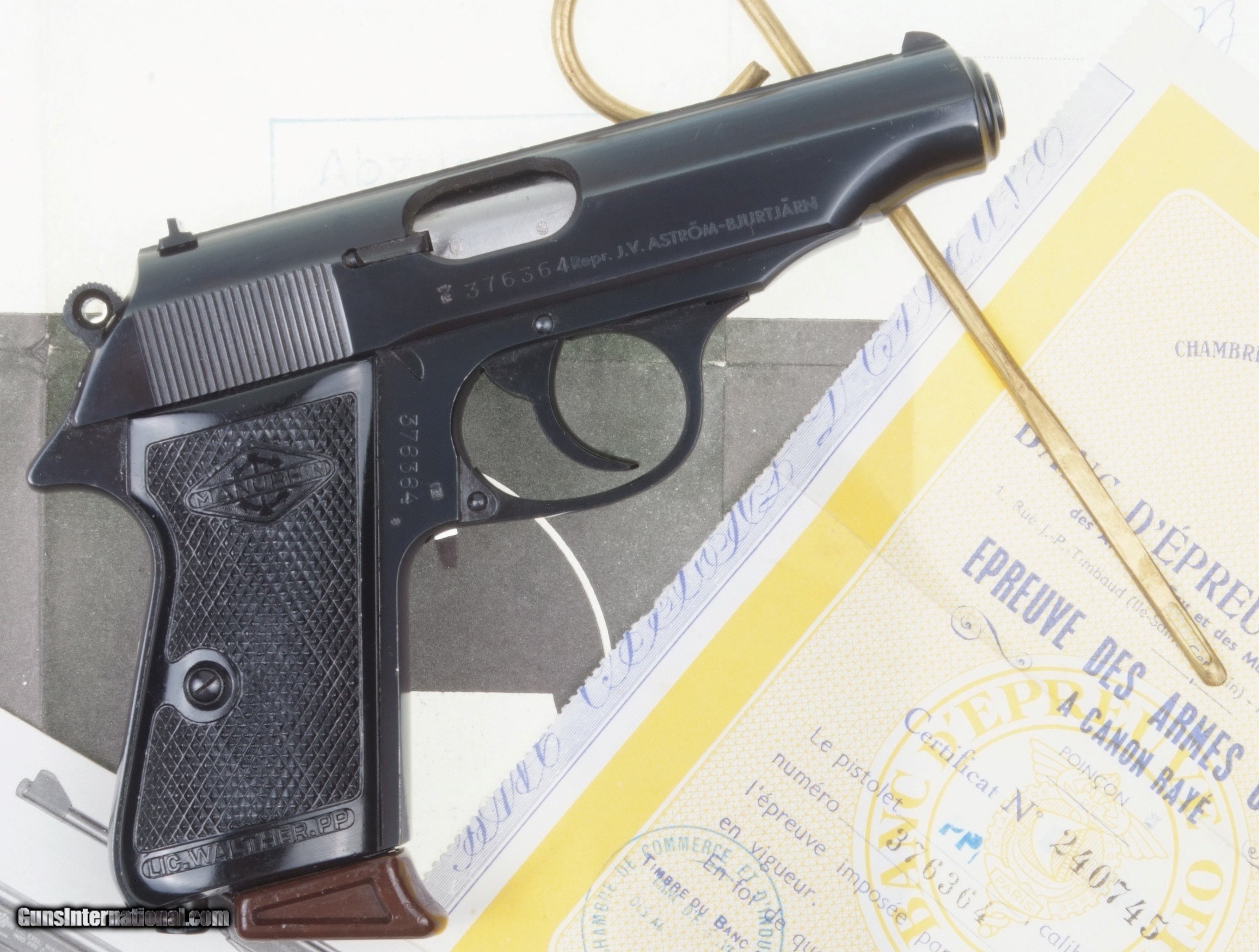 Standard configuration PP with fixed front sight, drift adjustable rear sight and loaded indicator. Left side of slide with Manurhin address referencing model, caliber and Walther licensing. Safety with red dotted Fire detent. Rowel hammer. Exposed barrel hood, in-the-white with French Arsenal proofing that is repeated, along with the full serial number, on the right side of the slide and frame. Swedish importer markings on right side of the slide. Fitted with two piece black grips, each marked with Manurhin diamond and referencing Walther’s licensing. Magazine is drilled with seven indicator holes, unmarked, with brown finger extension. Complete with matching numbered test target, matching numbered proofing certificate, 12 page instruction manual, original brass cleaning rod and faux alligator skin covered box, lettered in blue with the Manurhin logo along with Walther PP and location of the licensed manufacturer in France.