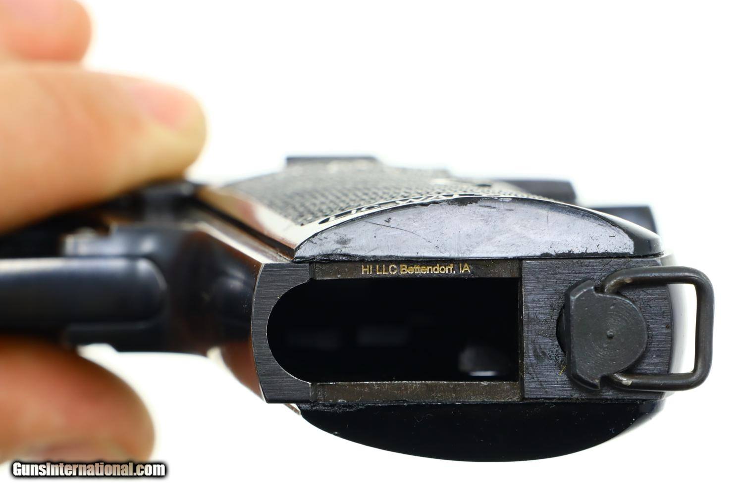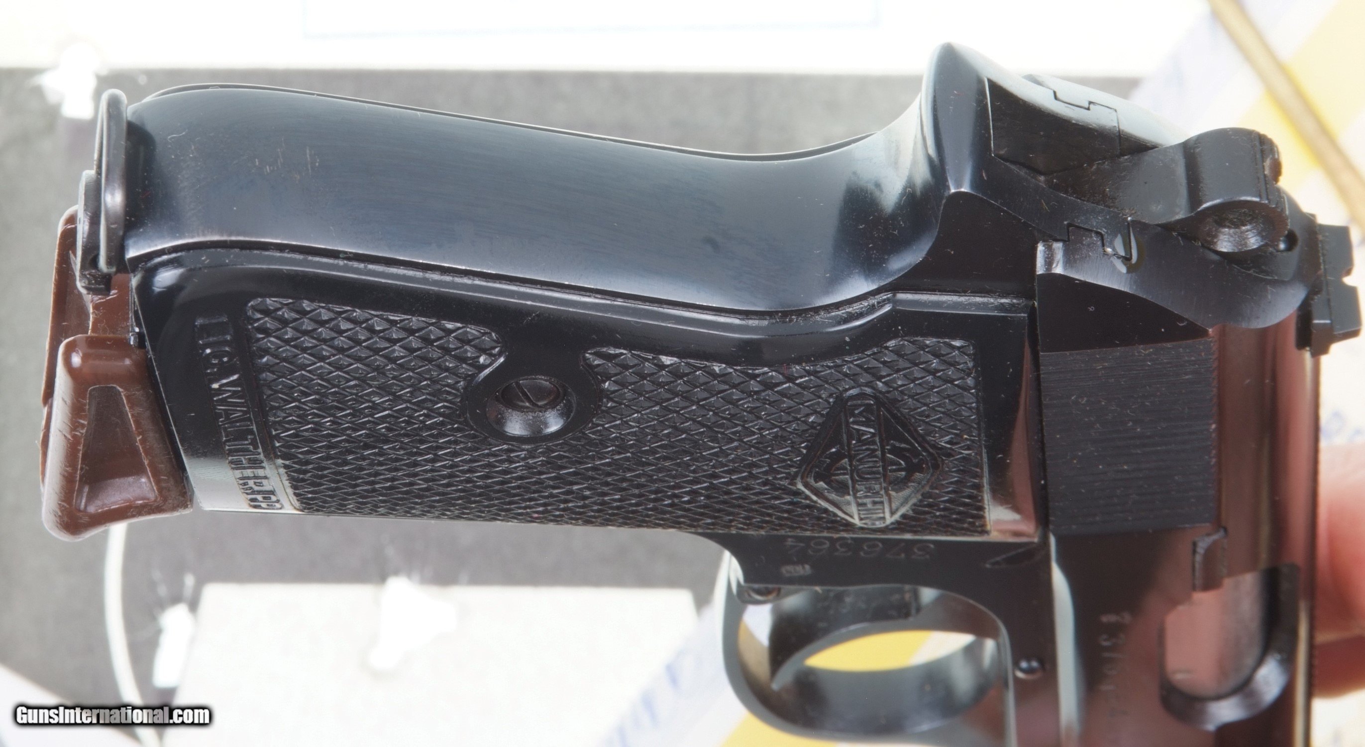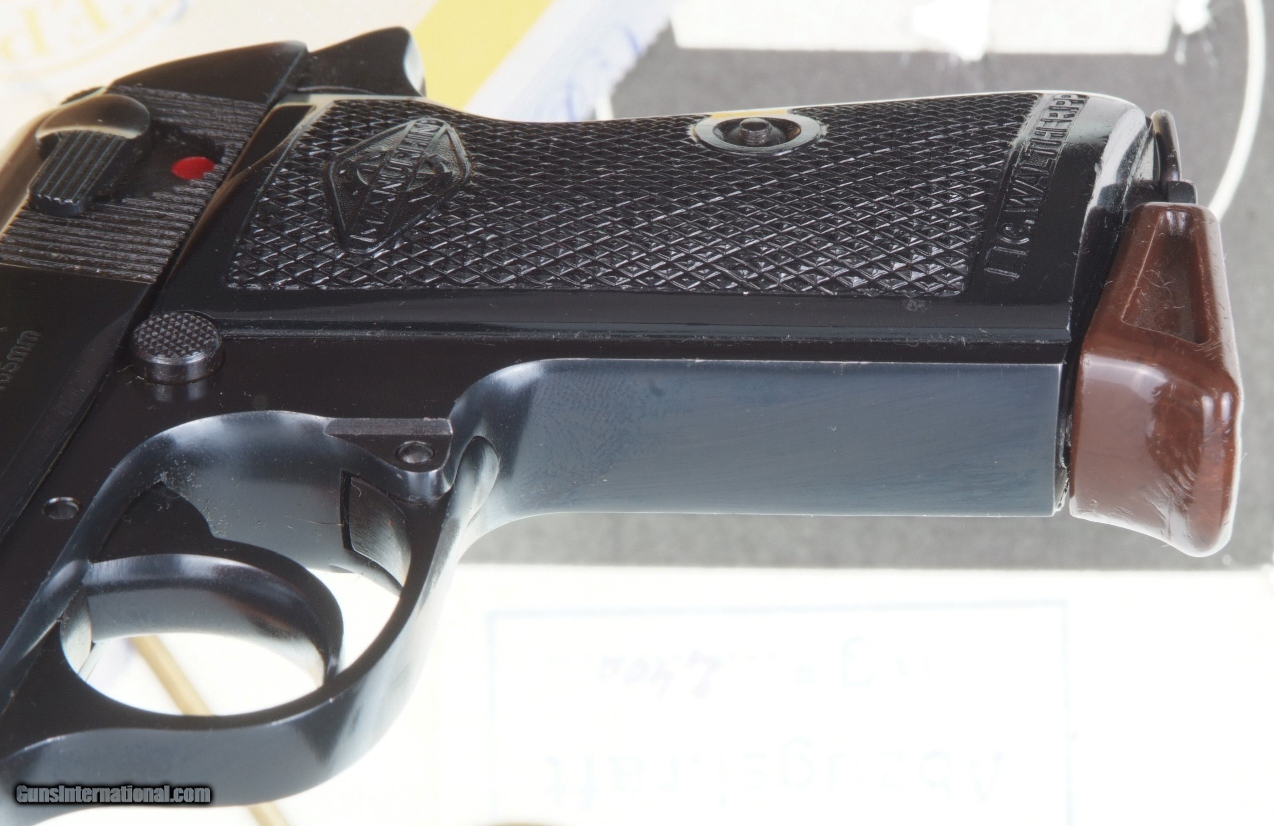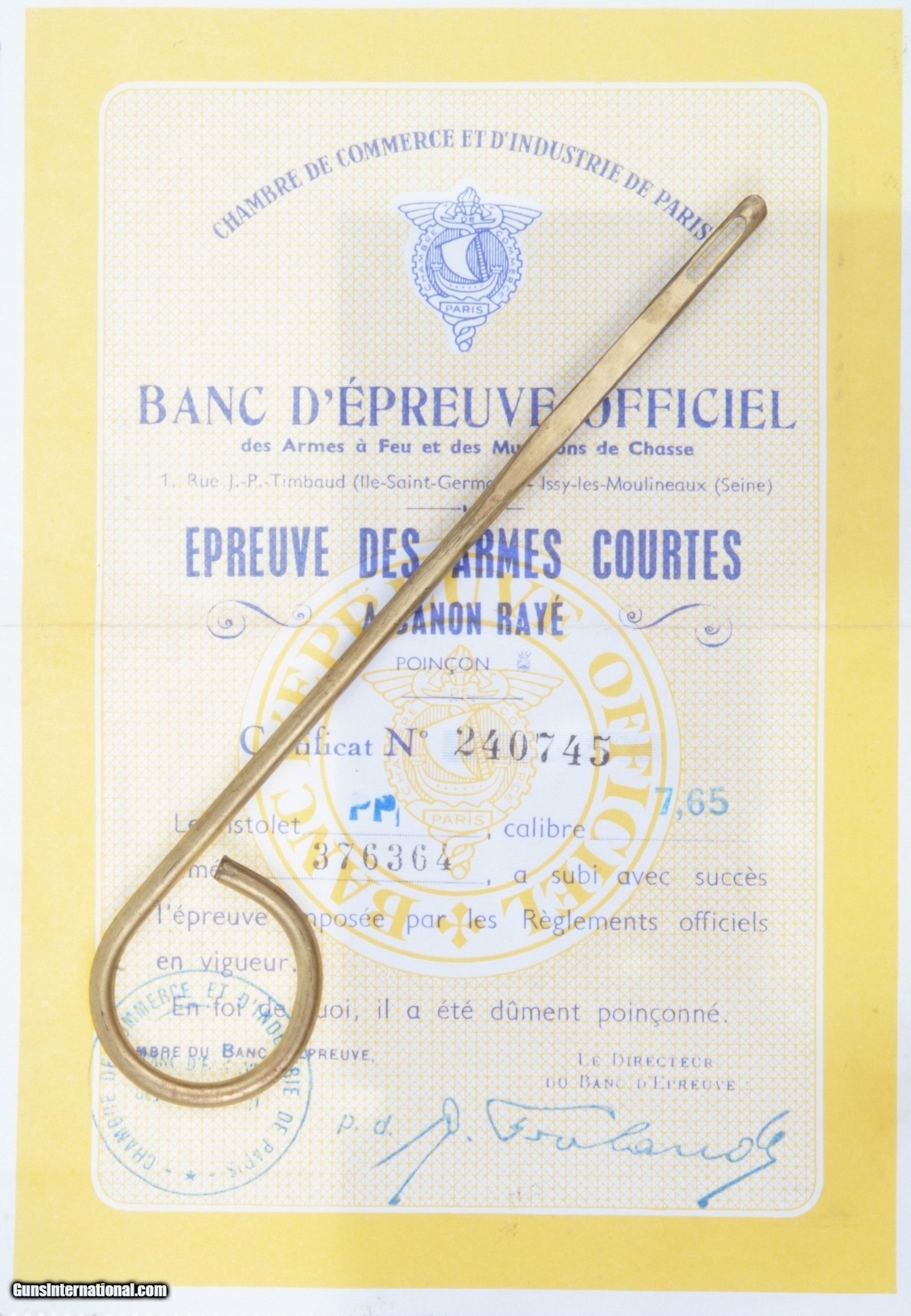 Standard configuration PP with fixed front sight, drift adjustable rear sight and loaded indicator. Left side of slide with Manurhin address referencing model, caliber and Walther licensing. Safety with red dotted Fire detent. Rowel hammer. Exposed barrel hood, in-the-white with French Arsenal proofing that is repeated, along with the full serial number, on the right side of the slide and frame. Swedish importer markings on right side of the slide. Fitted with two piece black grips, each marked with Manurhin diamond and referencing Walther’s licensing. Magazine is drilled with seven indicator holes, unmarked, with brown finger extension. Complete with matching numbered test target, matching numbered proofing certificate, 12 page instruction manual, original brass cleaning rod and faux alligator skin covered box, lettered in blue with the Manurhin logo along with Walther PP and location of the licensed manufacturer in France.