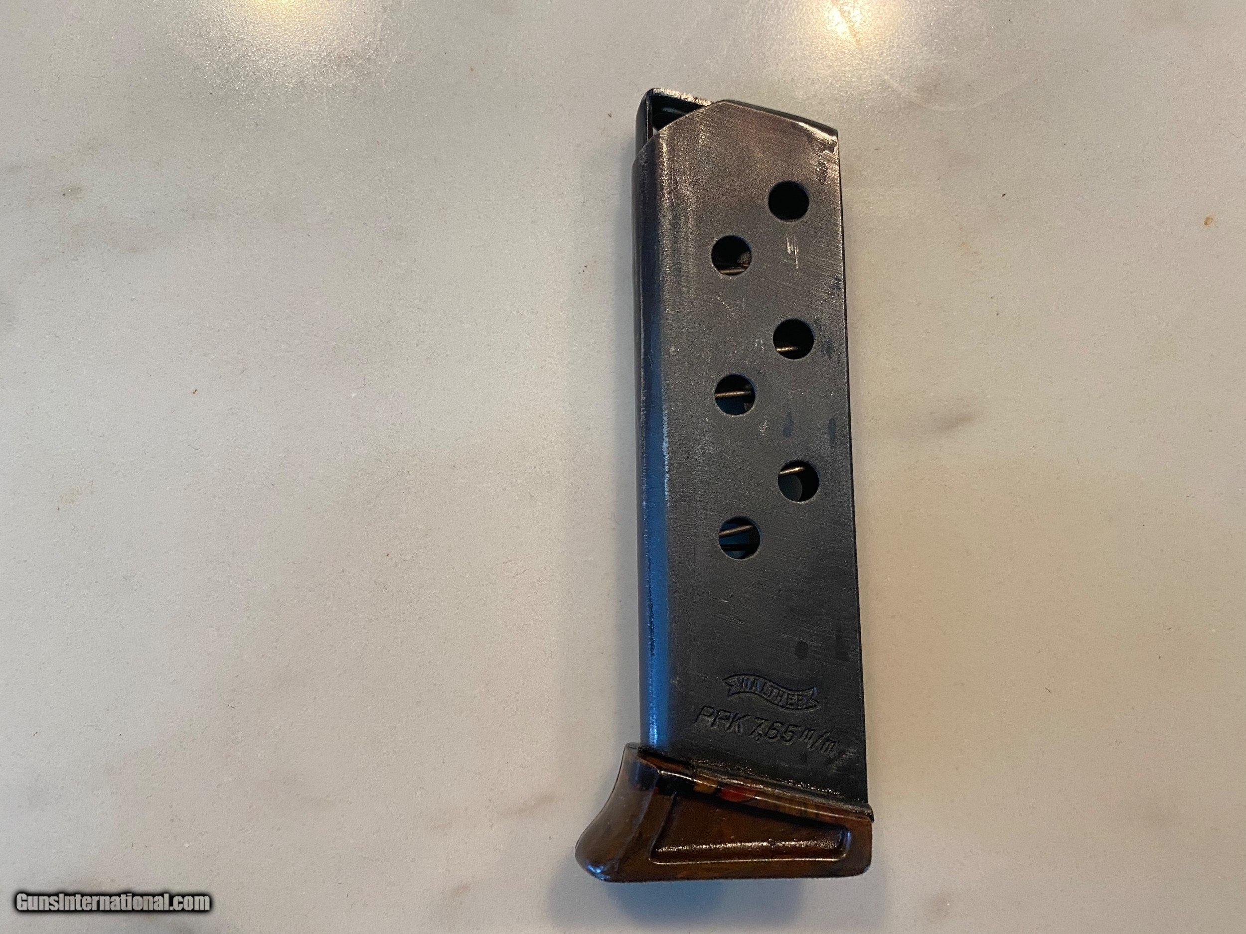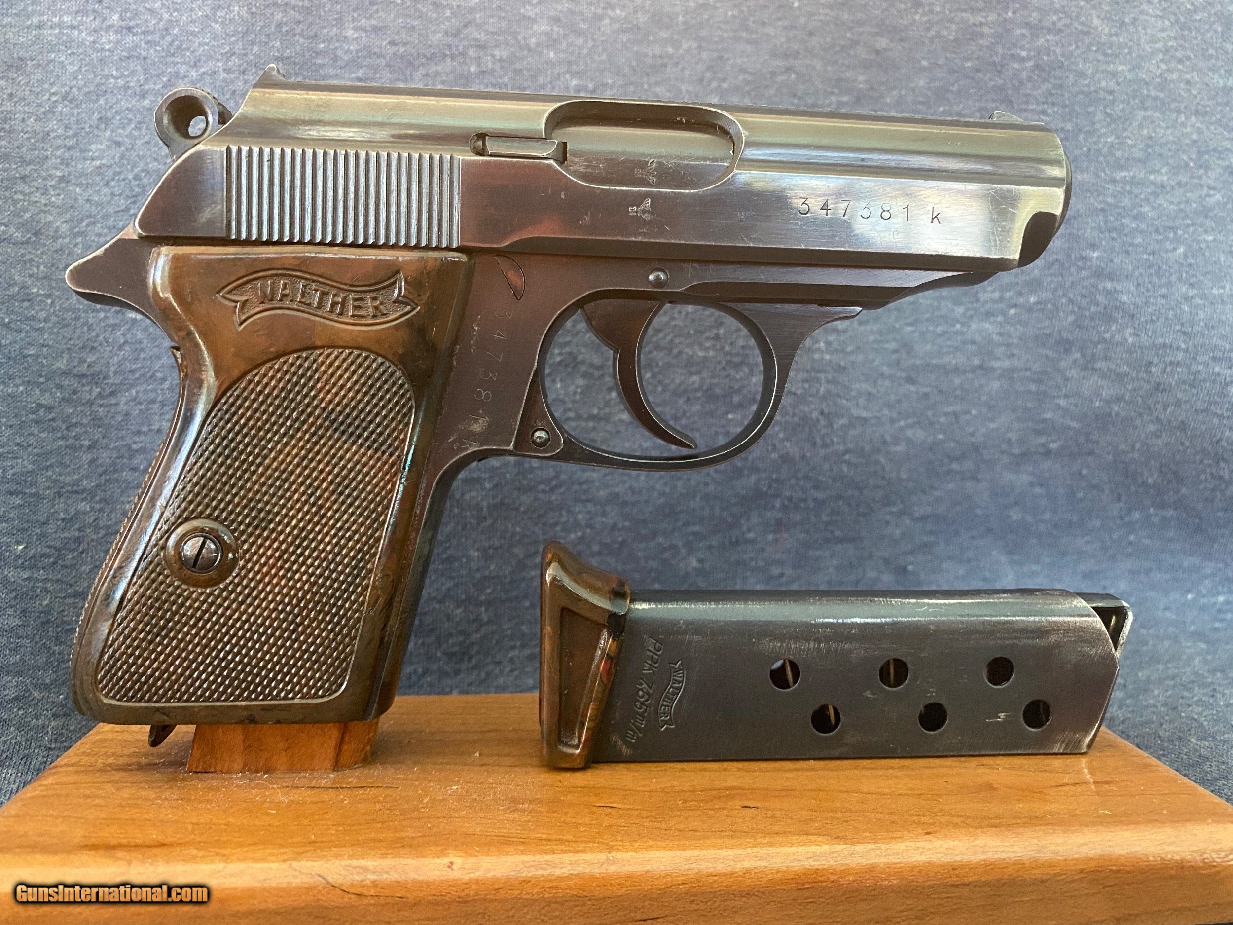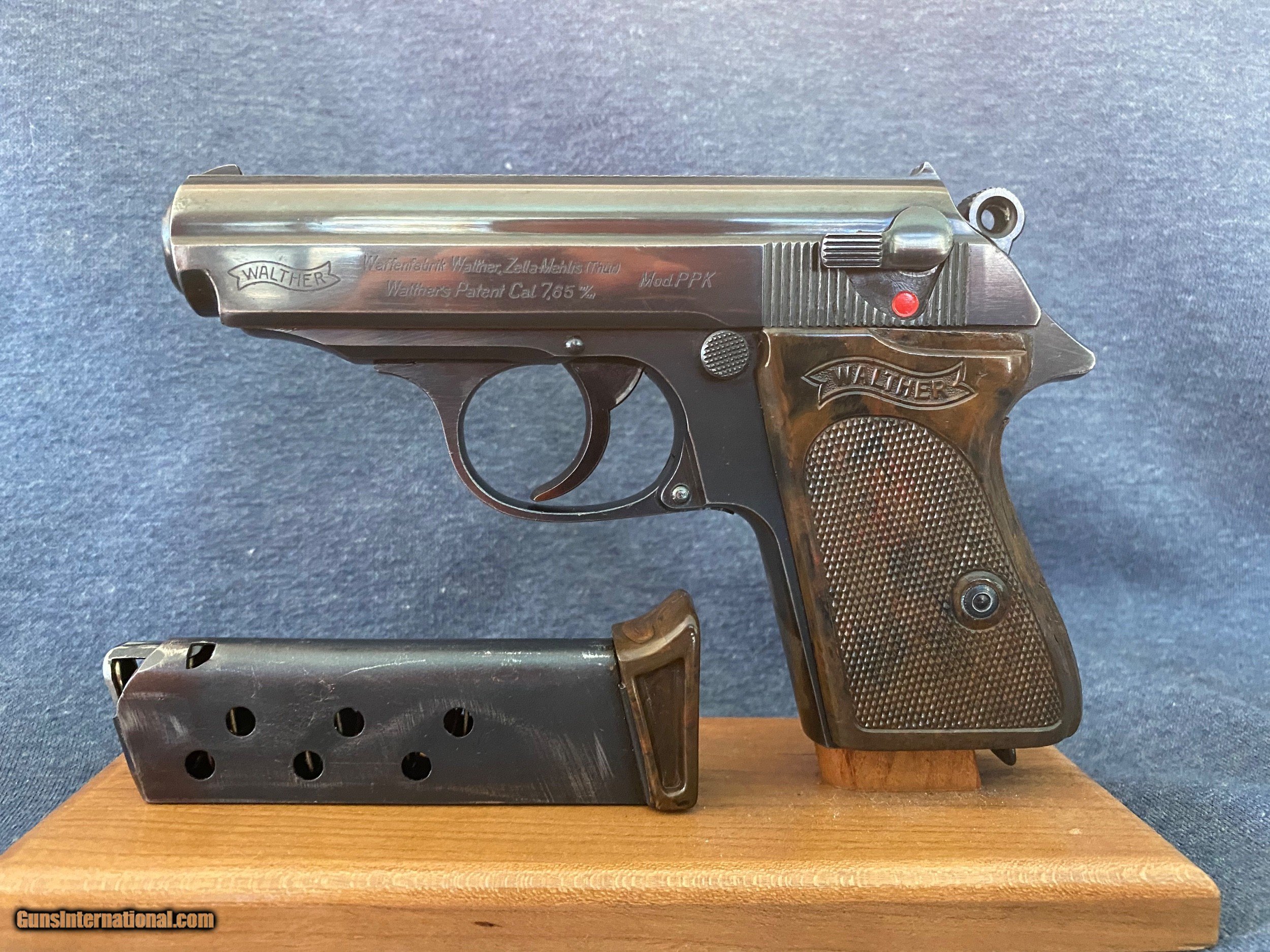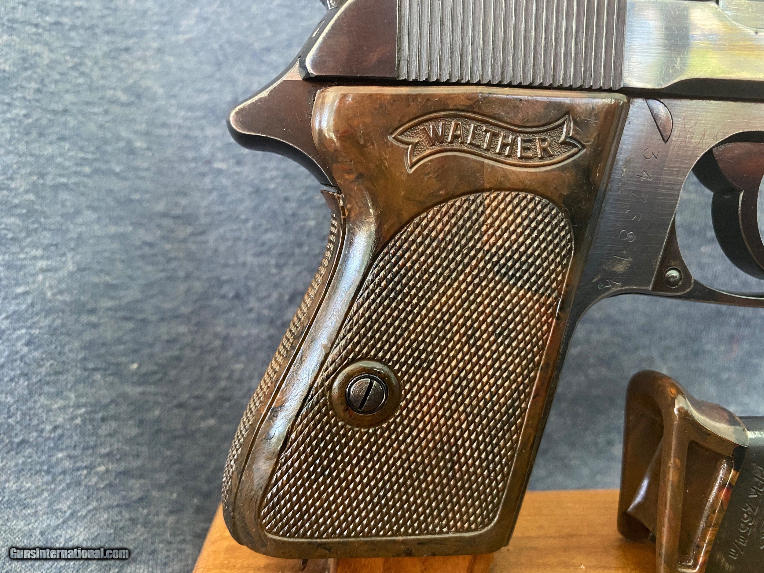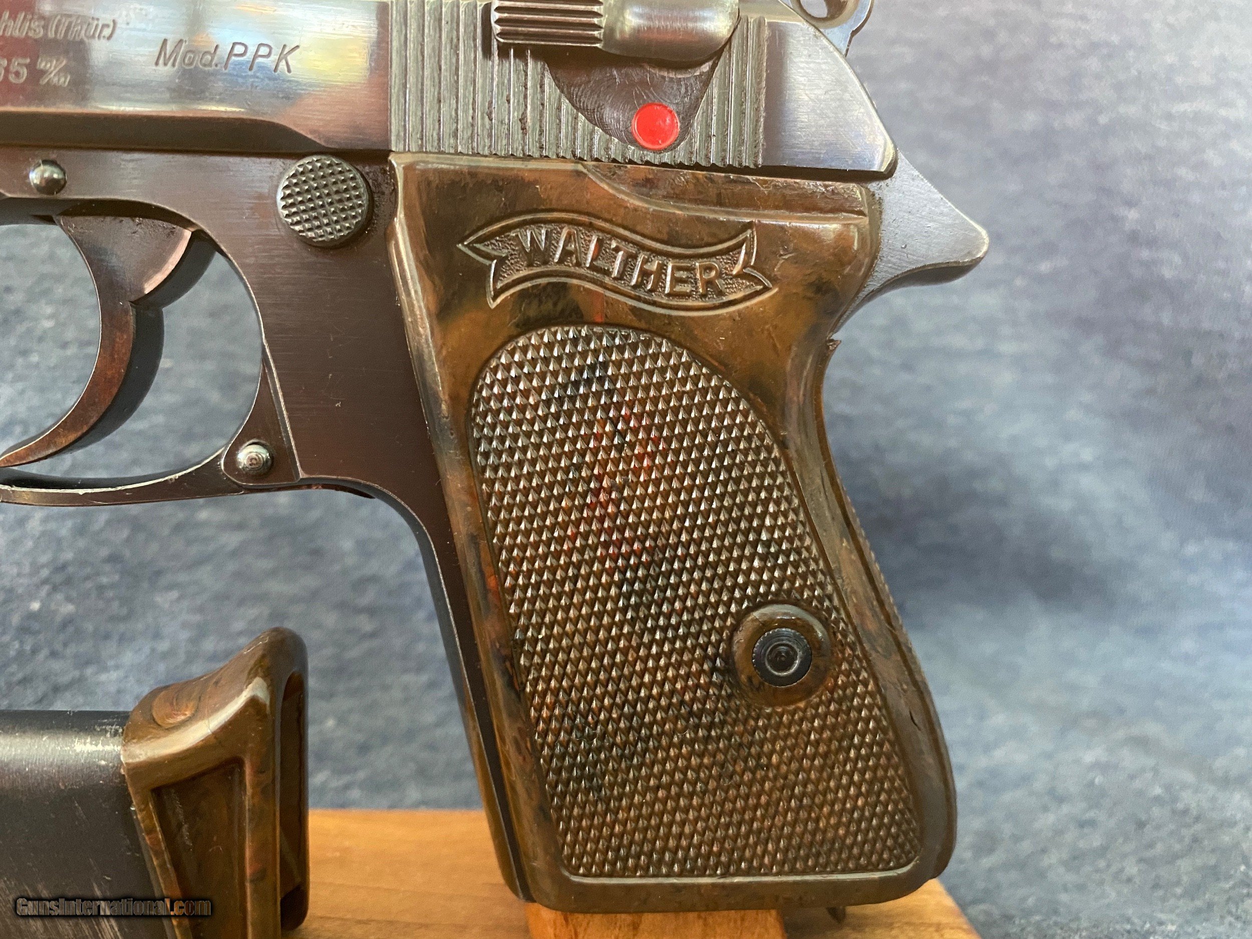 Description: Another! Price reduction! This is a beautiful wather PPK from 1941 with excellent grips with pinky extension magazine that matches perfectly this pistol is 100% correct look at the red in the grip and pinky extension absolutely stunning chocolate brown color hard to find this mint. This is a 99% condition fine example of a transitional color grip PPK with Nazi eagle N proof stamps.see photos. USPS money order only SOLD Curio/Relic: Yes |