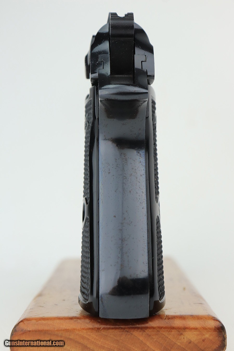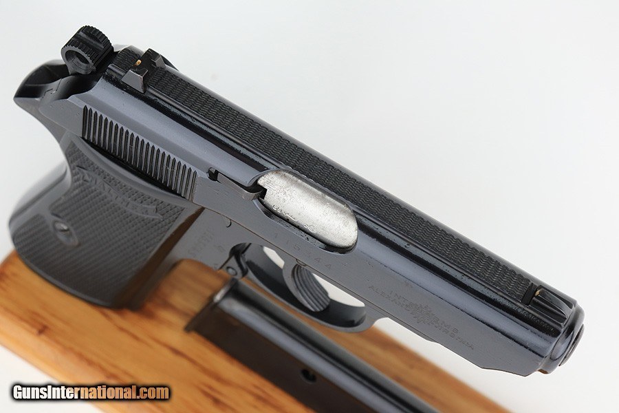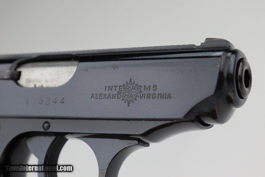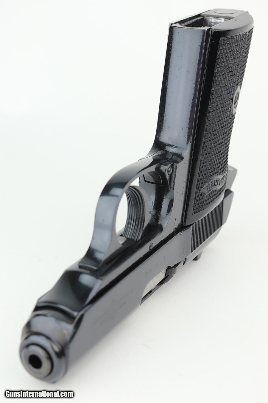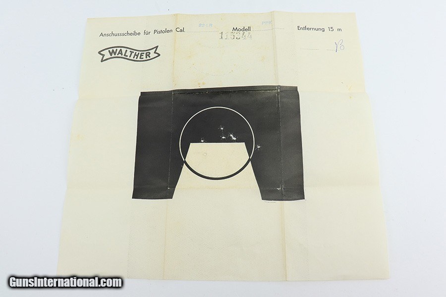 Description: This is a minty example of a Walther / Interarms PPK/S manufactured in 1969 and chambered in .22 LR. It is all matching and has the proper West German proofs. Interarms marking on the right side of the slide. The gun comes with its original matching-numbered box, matching-numbered test target, owners manual, and one flat-bottom magazine. The gun has retained virtually of its bluing, but there is light freckling on both grip straps. Fitted with very nice black plastic grips - one small mark on the top left of the left panel. The bore is like-new. SOLD Curio/Relic: Yes Handgun Caliber: .22 Long Rifle |