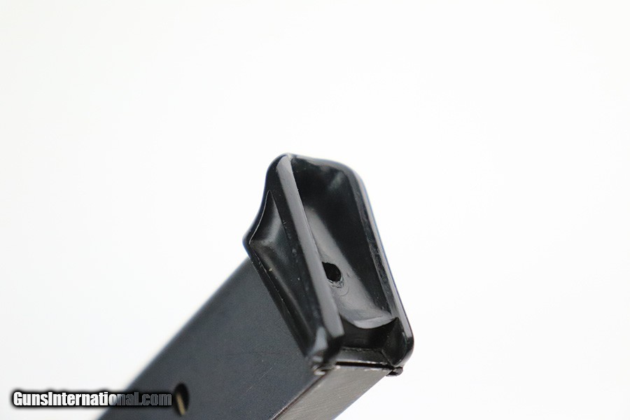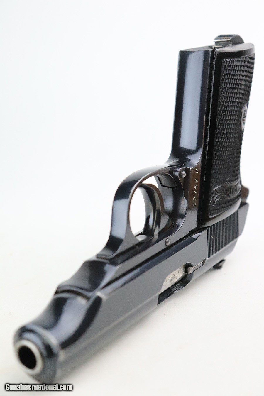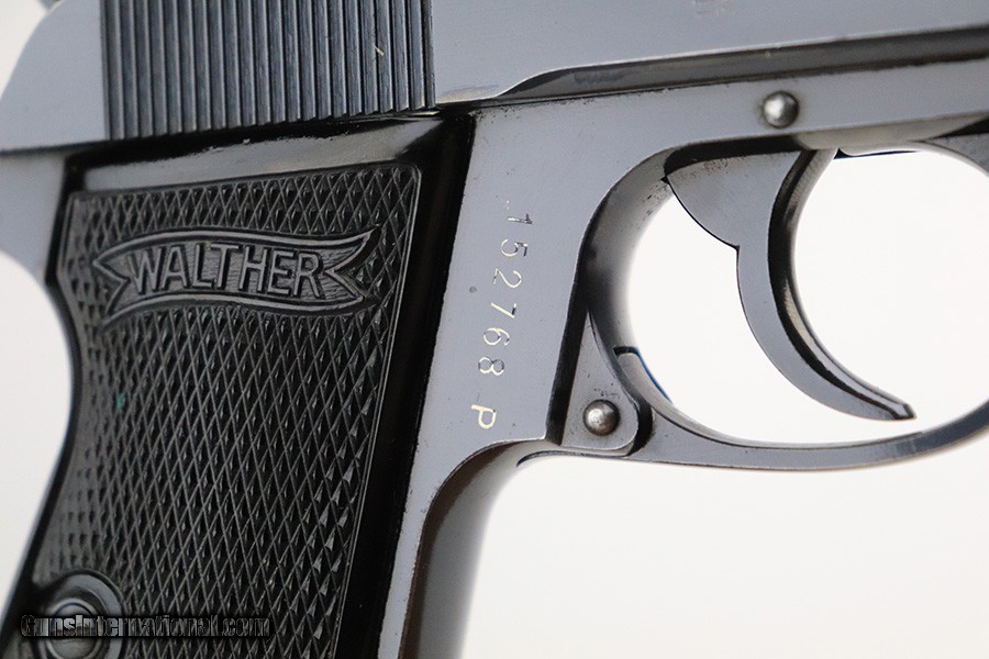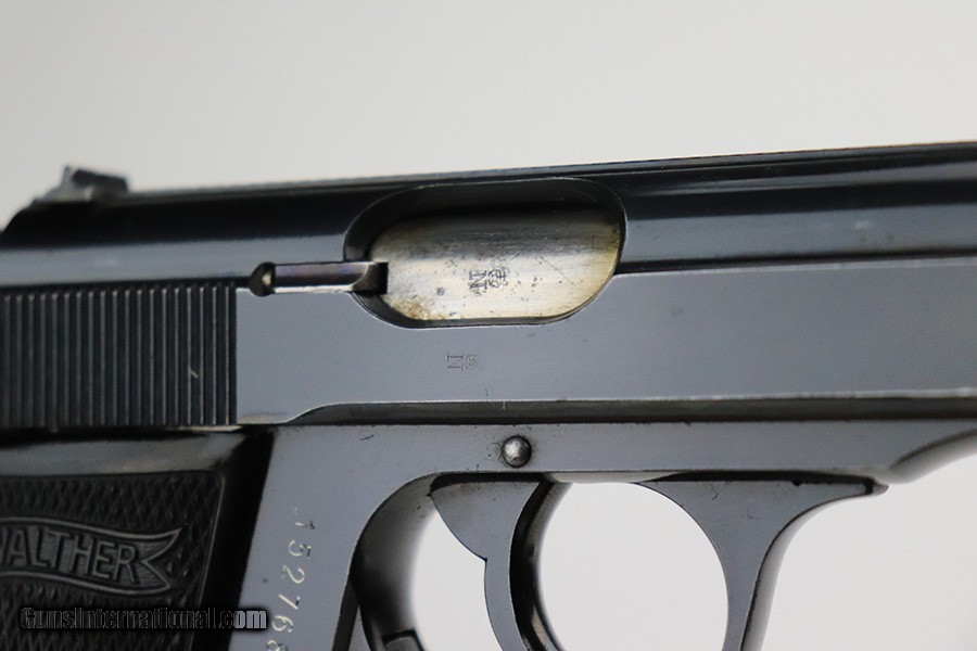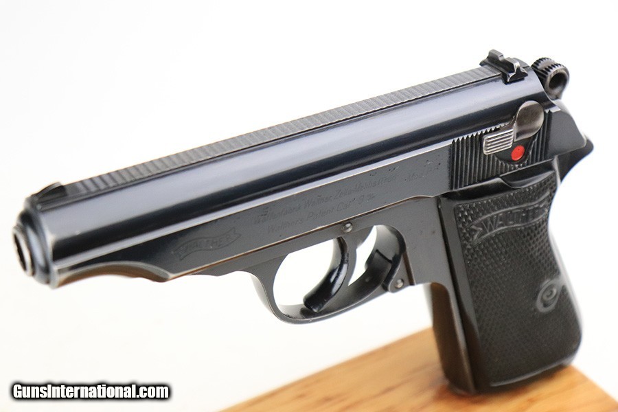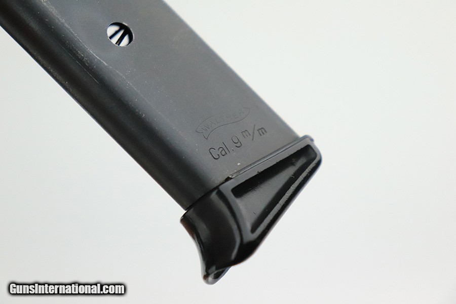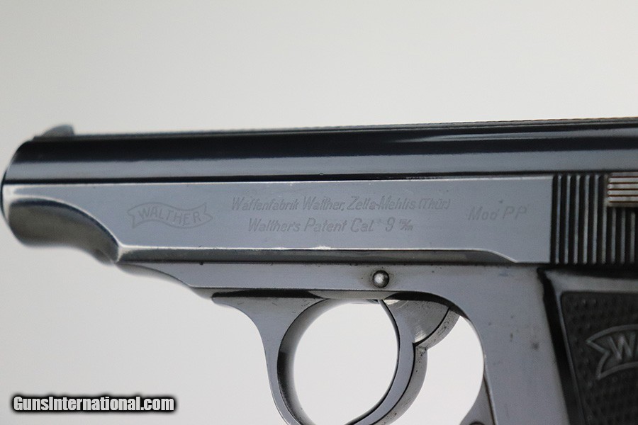 Description: This is a minty example of a rare 9mm Walther PP sold in the commercial market in 1939-40. It is all matching and has the proper "Crown N" proofs. It has retained about 97-98% of its original high polish finish. Just some very minor muzzle wear, a couple of very light scratches on the right side of the slide, and some light freckling on the back strap. Comes with excellent period-correct black bakelite grips and a period-correct 9mm finger extension magazine. The bore is near-mint with a hint of fouling in the grooves. SOLD Curio/Relic: Yes Handgun Caliber: .380 ACP (9x17mm Browning Short) |