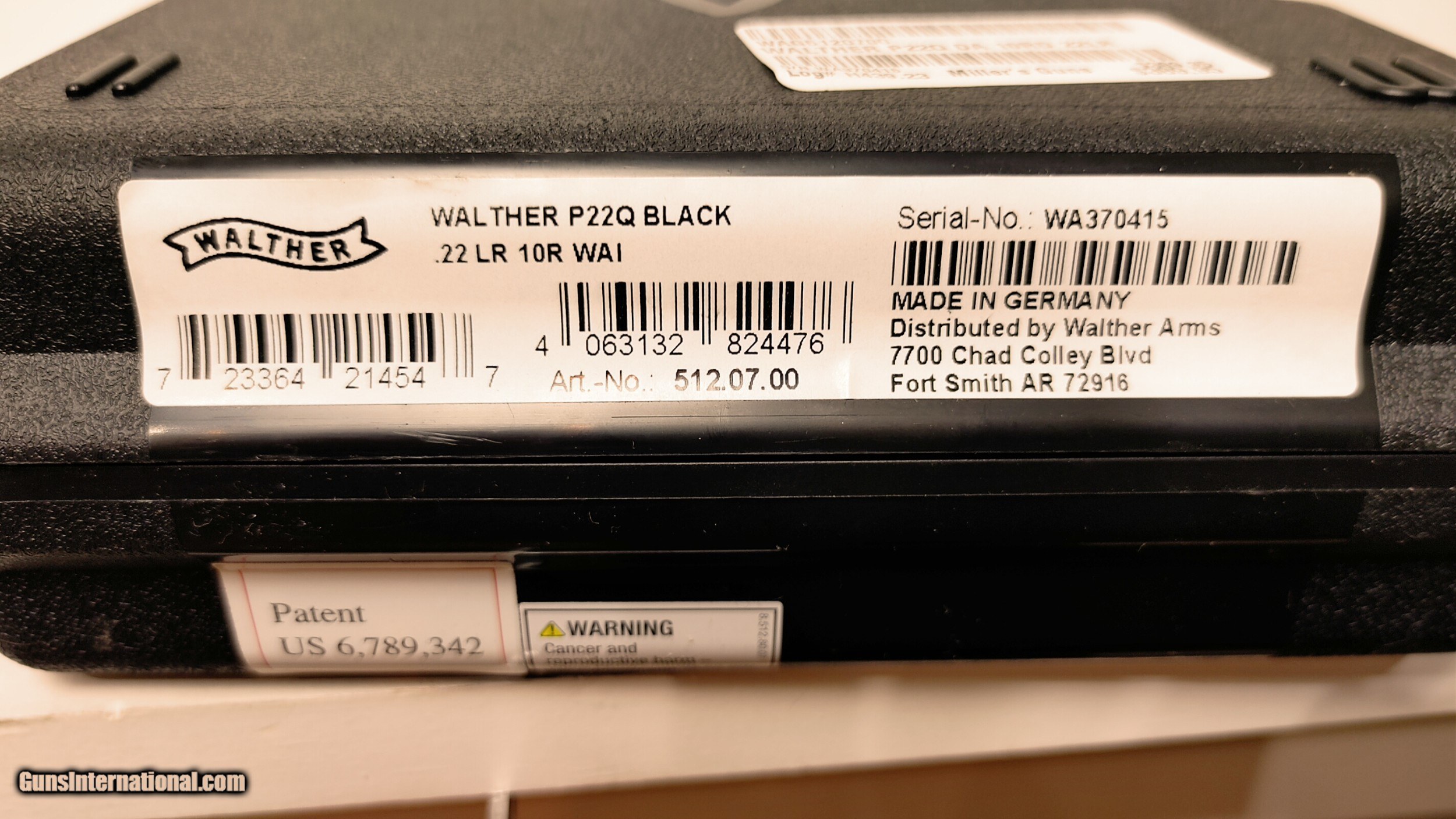Description: new WAI P22Q 22LR DA 10RD 3.4B TB new in hard plastic case (CALIBER:22LR); (MAG CAPACITY:10+1); (MODEL SERIES:P22); (CAPACITY:10+1); (FINISH:BLACK); (STOCK:BLACK POLYMER FRAME); (SIGHTS:FT: 1-DOT RR: 2-DOT WINDAGE ADJUSTABLE); (OVERALL LENGTH:6.26); (FEATURES:LOADED CHAMBER INDICATOR/ AMBI-MAGAZINE CATCH); (GUN TYPE:PISTOL: SEMI-AUTO); (ACTION:DOUBLE ACTION); (BARREL LENGTH:3.42 THREADED BARREL); (DEPT:HANDGUN) Buyer pays shipping Millers Gun Center Located in New Castle, Delaware "Home of TAX-Free shopping" No Credit Card Fees SOLD Serial Number: WA370415 |