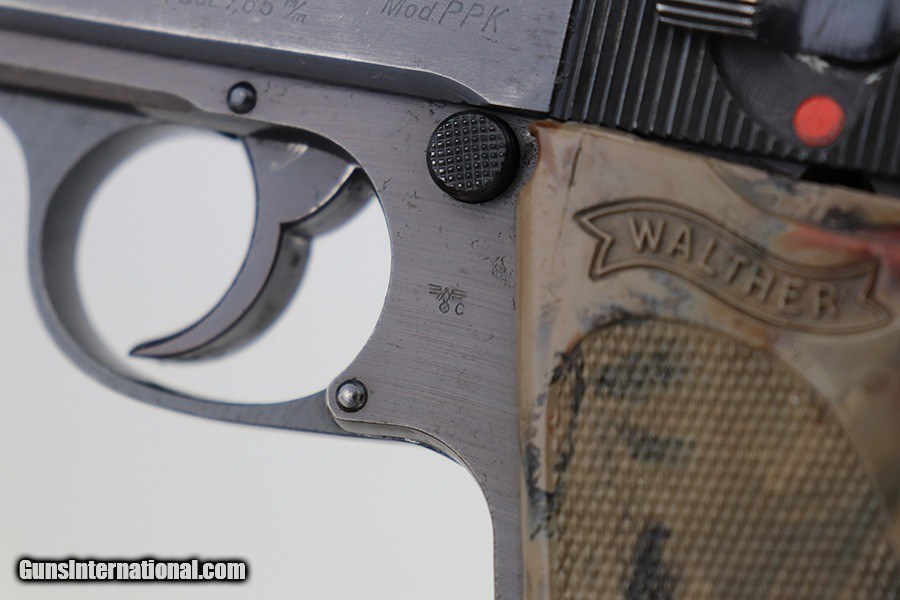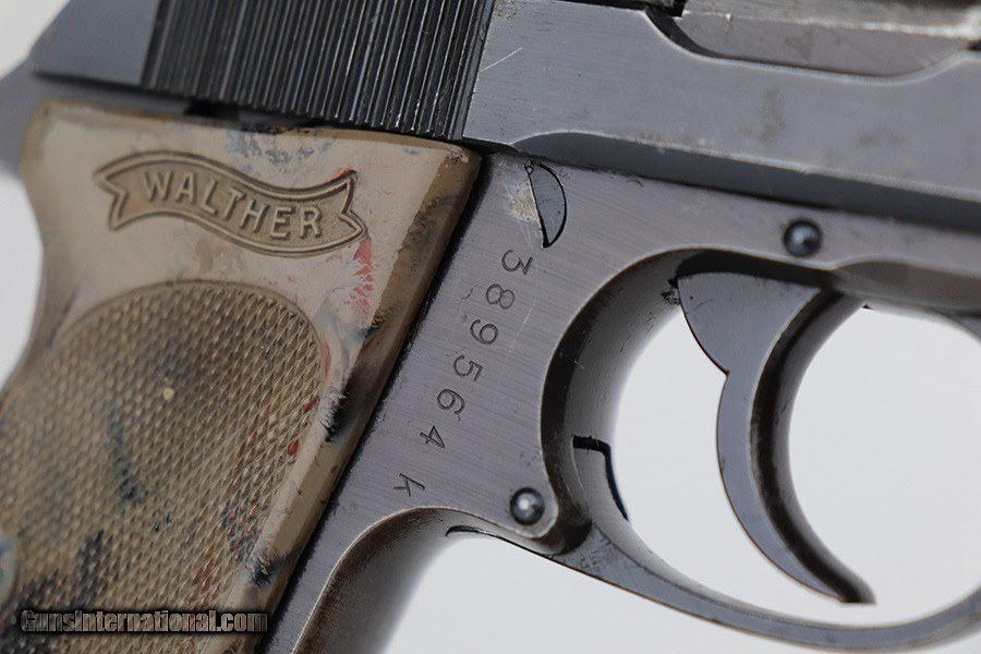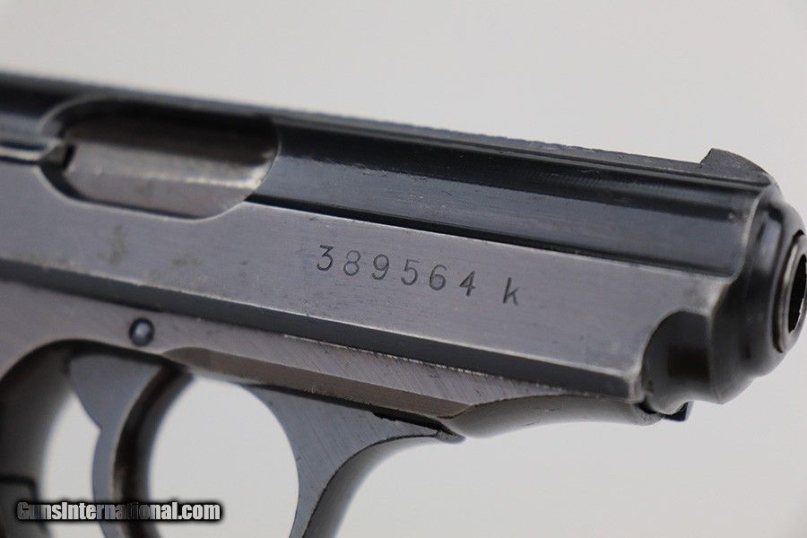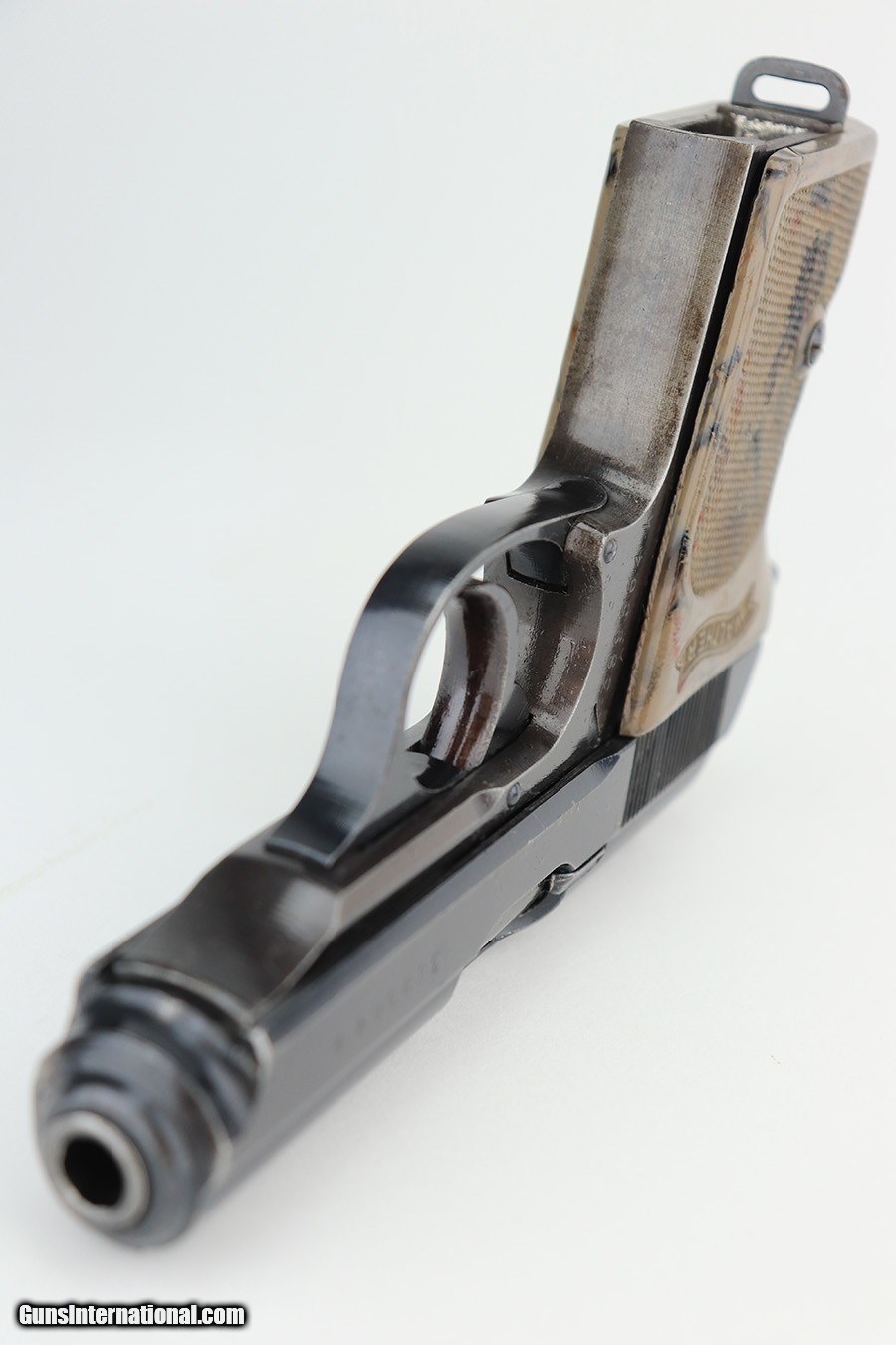 Description: This is a very nice example of a Walther PPK issued to the Nazi police force in 1943. It is all matching and has a police "Eagle C" proof on the left side of the frame. This one is also fitted with a scarce grey grip - really nice marbling of black and red throughout! There is a very light crack on the left side. The gun itself has retained about 94% of its original wartime finish. The majority of the finish loss is on the front strap, but there are also areas of light spotty discoloration around the muzzle and on the right side of the slide. Comes with a proper wartime magazine. Mint bore. SOLD Curio/Relic: Yes Handgun Caliber: 7.65x22mm Parabellum (7.65x22mm Luger, .30 Luger) |
