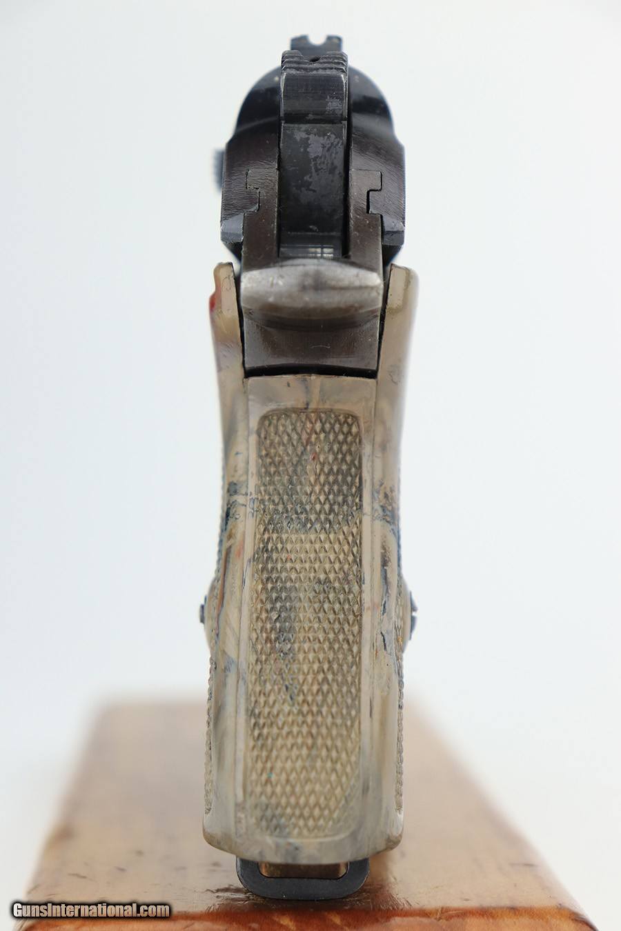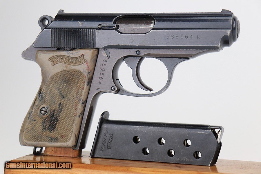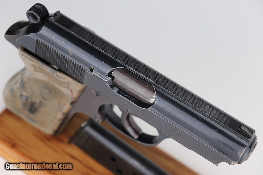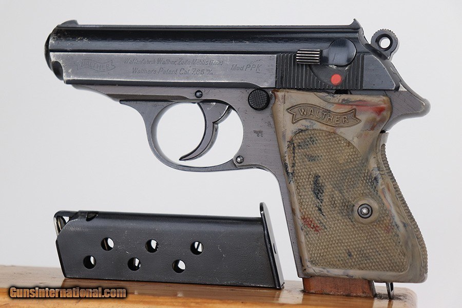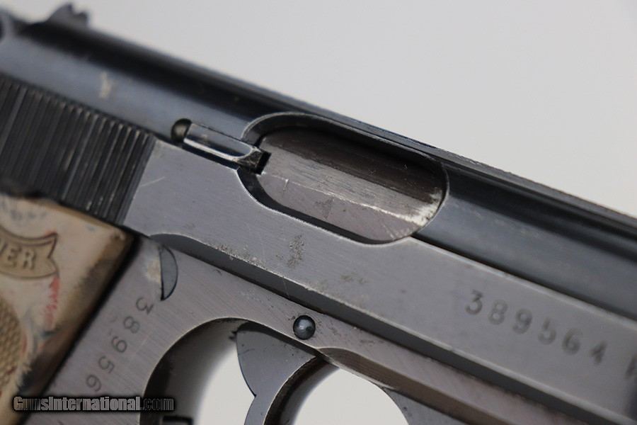 Description: This is a very nice example of a Walther PPK issued to the Nazi police force in 1943. It is all matching and has a police "Eagle C" proof on the left side of the frame. This one is also fitted with a scarce grey grip - really nice marbling of black and red throughout! There is a very light crack on the left side. The gun itself has retained about 94% of its original wartime finish. The majority of the finish loss is on the front strap, but there are also areas of light spotty discoloration around the muzzle and on the right side of the slide. Comes with a proper wartime magazine. Mint bore. SOLD Curio/Relic: Yes Handgun Caliber: 7.65x22mm Parabellum (7.65x22mm Luger, .30 Luger) |