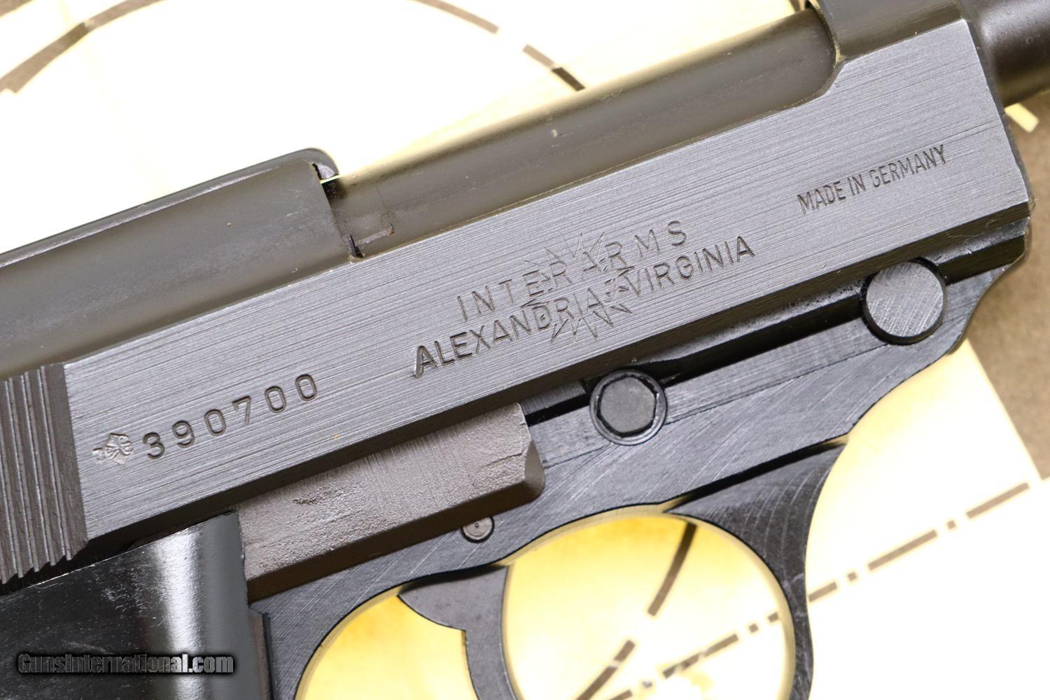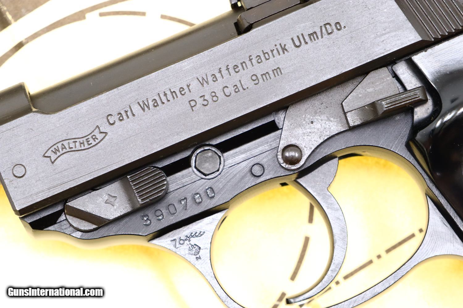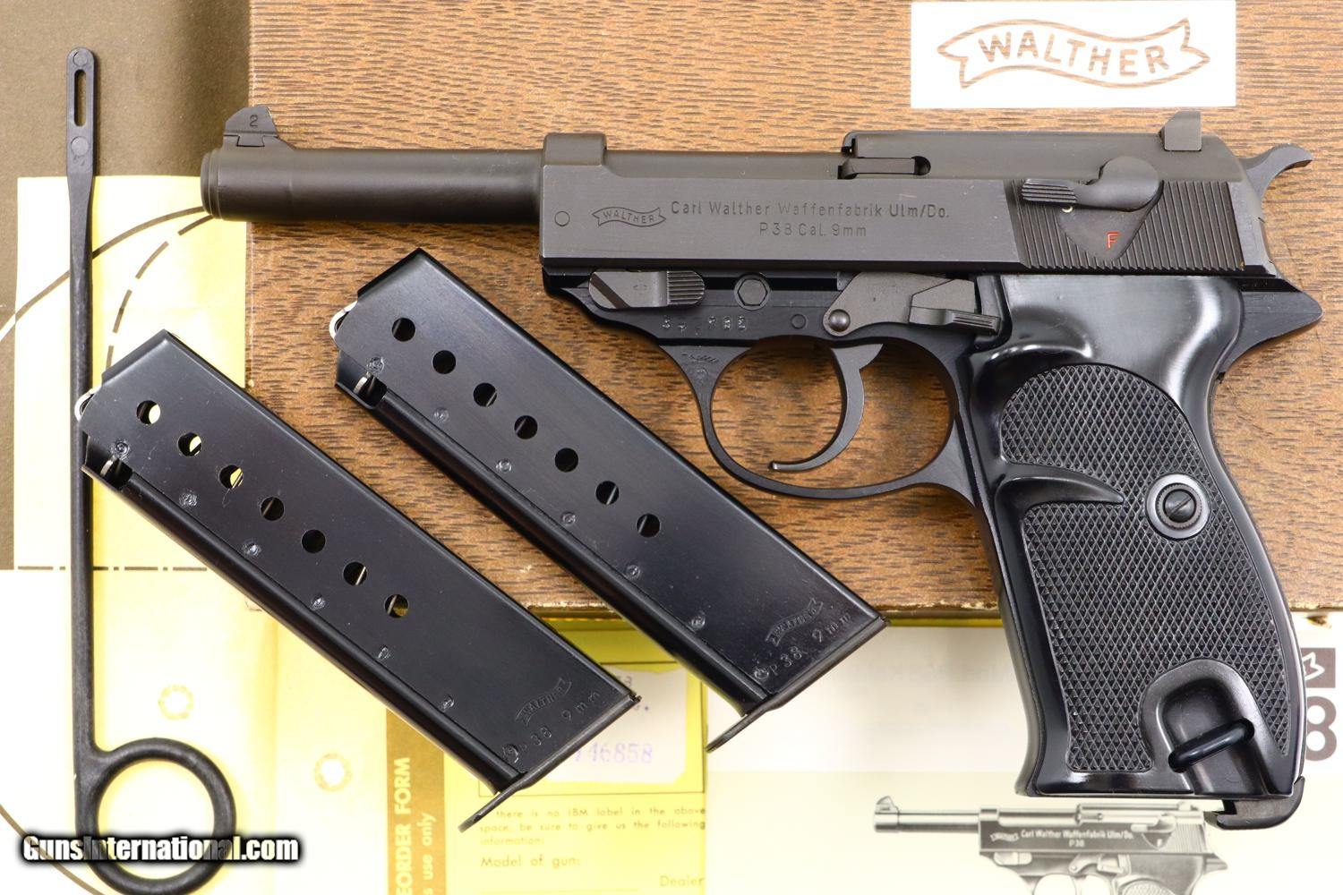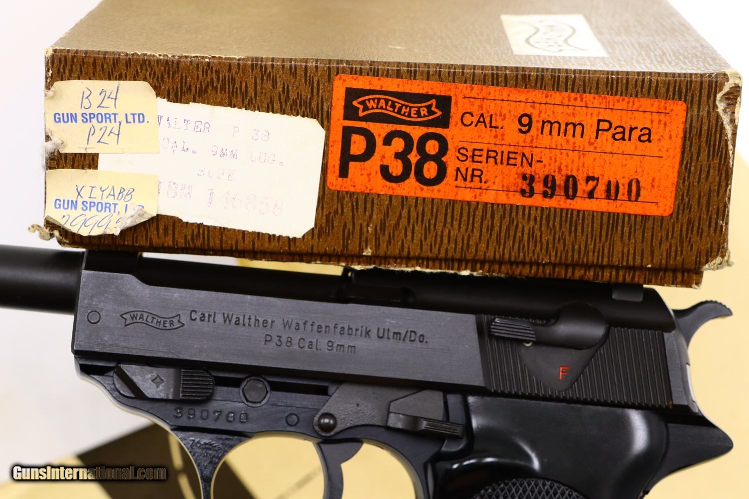 Description: Synopsis: Post War Walther P38, as NIB with accessories, 390700, FB01076 Description: As NIB Walther Post War P38, made 1976, with spare magazine, black plastic cleaning rod, instruction booklet, warranty card, matching test target in matching Walther shipping box. SN: 390700. Cal: 9mmP. Drift adjustable front sight and fixed rear sight, both with white highlights. Left side of slide with Walther banner followed by two line address. Left side of frame with full serial number over 76 year acceptance and Eagle/N. Right side of slide with full serial number, Interarms marking, and “Made in Germany”. Black plastic grips with bordered checkered panels on each side and over backstrap. Lanyard loop present. High polish magazines with left side marked with the Walther banner/P38/9mm. Complete with spare magazine, black plastic rod, instruction booklet, warranty card, matching test target in its original Walther brown cardboard shipping box with matching end label. NOTE: CONSECUTIVE PISTOL, NIB, POSTED AND OFFERED AT SAME PRICE! Condition: As new, a condition that applies to the pistol and all accessories. Box has a few shelf scuffs. ~~Insured shipping fee of $55; most packages shipped using FedEx 2nd Day.~~ SOLD Manufacturer: Walther Serial Number: 390700 Caliber Info: 9mmP |